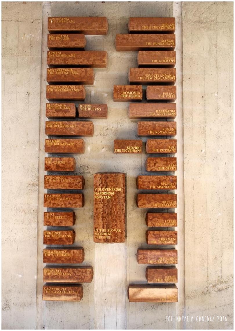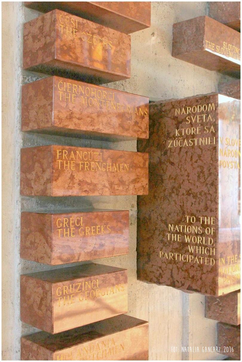 - Tabliczka w języku słowackim i angielskim pośród innych narodowości zaangażowanych w Słowackim Powstaniu Narodowym
