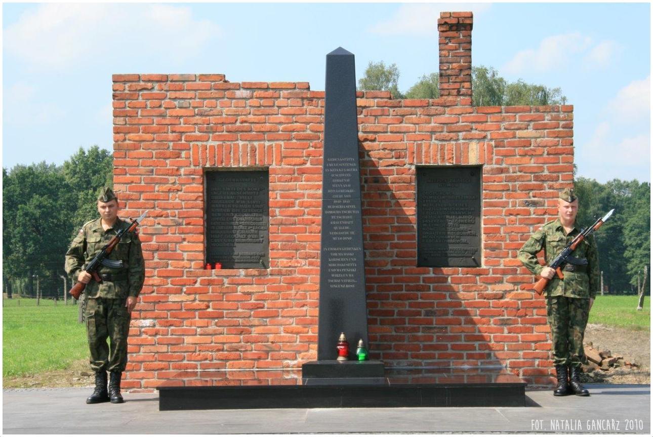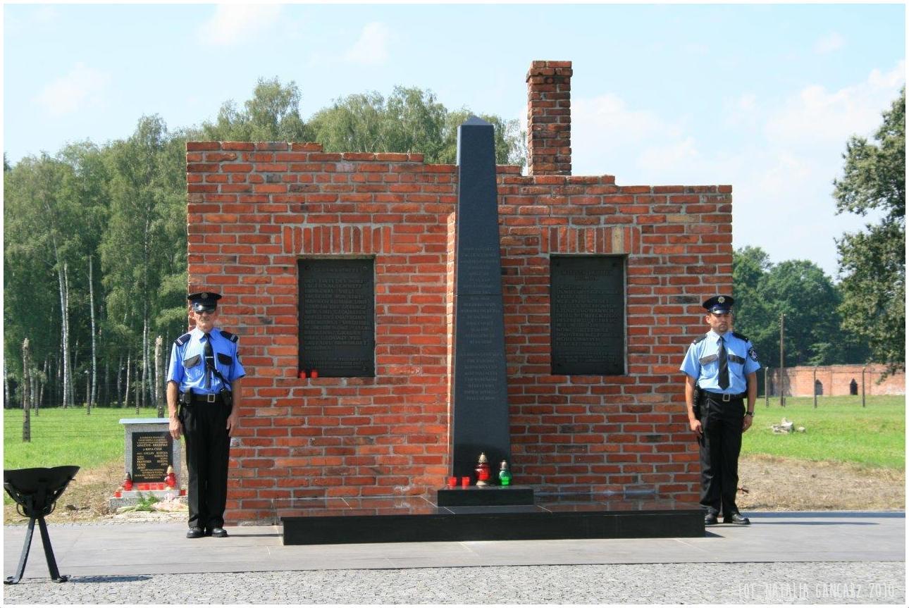 MIEJSCE PAMIĘCI ROMÓW / OBOZU KONC. / OŚWIĘCIM-BRZEZINKA / TYSIĄCE MĘŻCZYZN, KOBIET / I DZIECI WIĘZIONYCH / I TORTUROWANYCH / OFIAR NIEMIECKIEGO / FASZYZMU – ZGINĘŁO / W TYM OBOZIE / KONC. BRZEZINKA / OKRUTNIE / MĘCZONYCH, MORDOWANYCH / I ZAGAZOWANYCH. // UFUNDOWANY PRZEZ ZWIAZEK / ROMA W NIEMCZECH 1973 / ROSE O. BAMBERGER