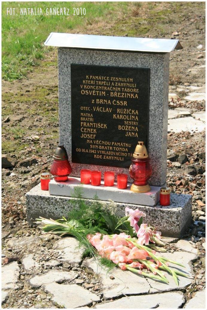 Na betonowej steli znajduje się tablica, na której z inicjatywy ocalałego syna/brata, Tondry Růžički, wspomina się: Wacława i Karolinę (rodziców) oraz rodzeństwo: Franciszka, Čenka, Józefa, Bożenę i Janę, którzy przebywali w obozie Auschwitz-Birkenau od 16.04.1942 i tutaj zostali zamordowani.