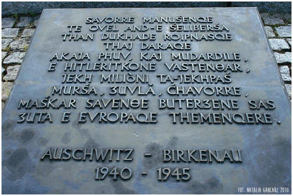 SAVORE MANUŚENQE / TE OVEL AND-E ŚELIBERŚA / THAN DUKHADE ROIPNASQE / THAJ DARAQE / AKAJA PHUV KAJ MUDARDILE, / E HITLERITKONE VASTENCAR, / JEKH MILIÒNI TA-JEKHPAŚ / MURŚA, DUVLA, ĆHAVORRE, / MAŚKAR SAVENDE BUTERDENE SAS / ZUTAR E EVROPAQE THEMENQERE / AUSCHWITZ-BIRKENAU / 1940-1945