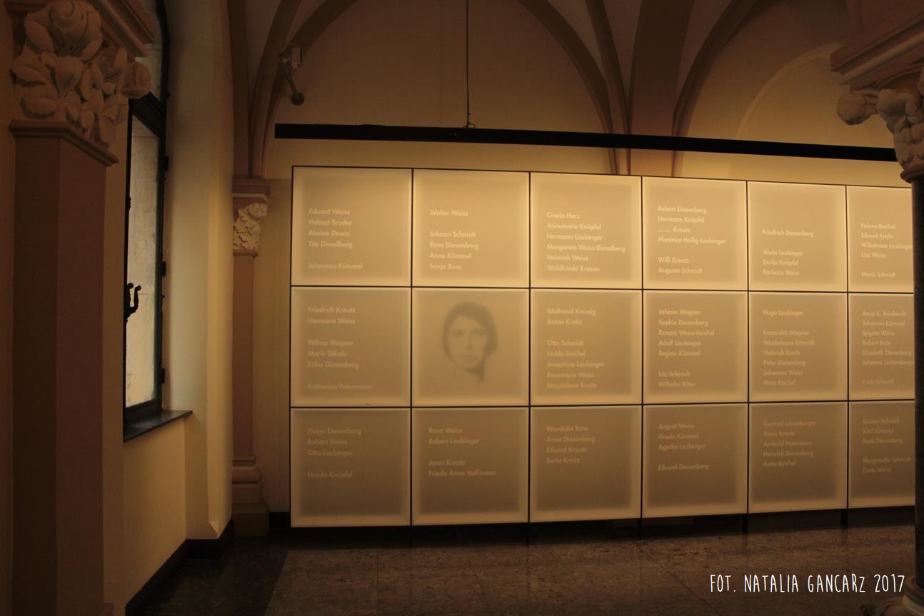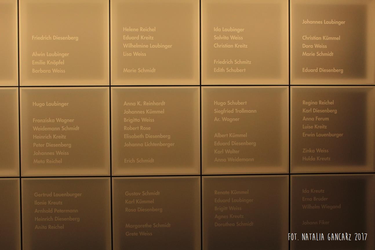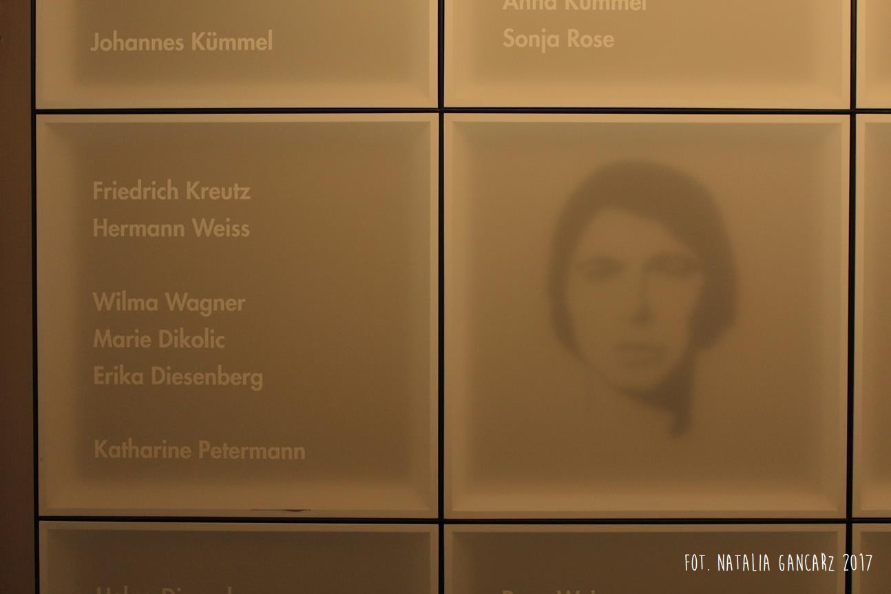 Białe panele, tj. ekspozycja podświetlona od tyłu ciepłym światłem, podaje nazwiska Sintów z Brunszwika. Drugi panel od lewej w rzędzie środkowym przedstawia zarys twarzy kobiety. Jest on na tyle rozmyty, że nie jesteśmy pewni, czy istotnie jest ot Cyganka, czy fotografia przedstawia konkretną osobę… zresztą nie ma to pewnie większego znaczenia w zestawieniu z liczbą tylu nazwisk „bez twarzy”, ludzi, z których prawdopodobnie wszyscy zginęli.