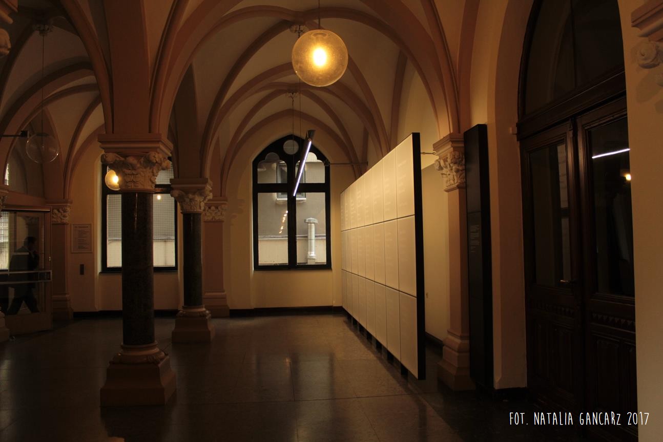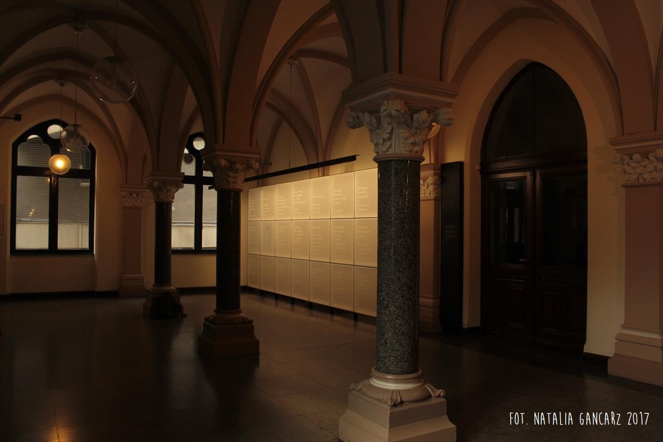 Kierując się w prawo od głównego wejścia do Ratusza w Brunszwiku (wejście od strony Platz der Deutschen Einheit), dotrzemy do ekspozycji tablic pamiątkowych we foyer budynku. Składają się na nią 24 podświetlone od tyłu tablice, ułożone w trzech rzędach, z których każda ściśle przylega do następnej. Po prawej stronie od ekspozycji znajduje się czarny panel, wysokością i szerokością wypełniający powierzchnię ściany pomiędzy kolumną przyścienną i jej głowicą a łukiem przy drzwiach. Za plecami mamy kolumny wspierające sklepienie.
