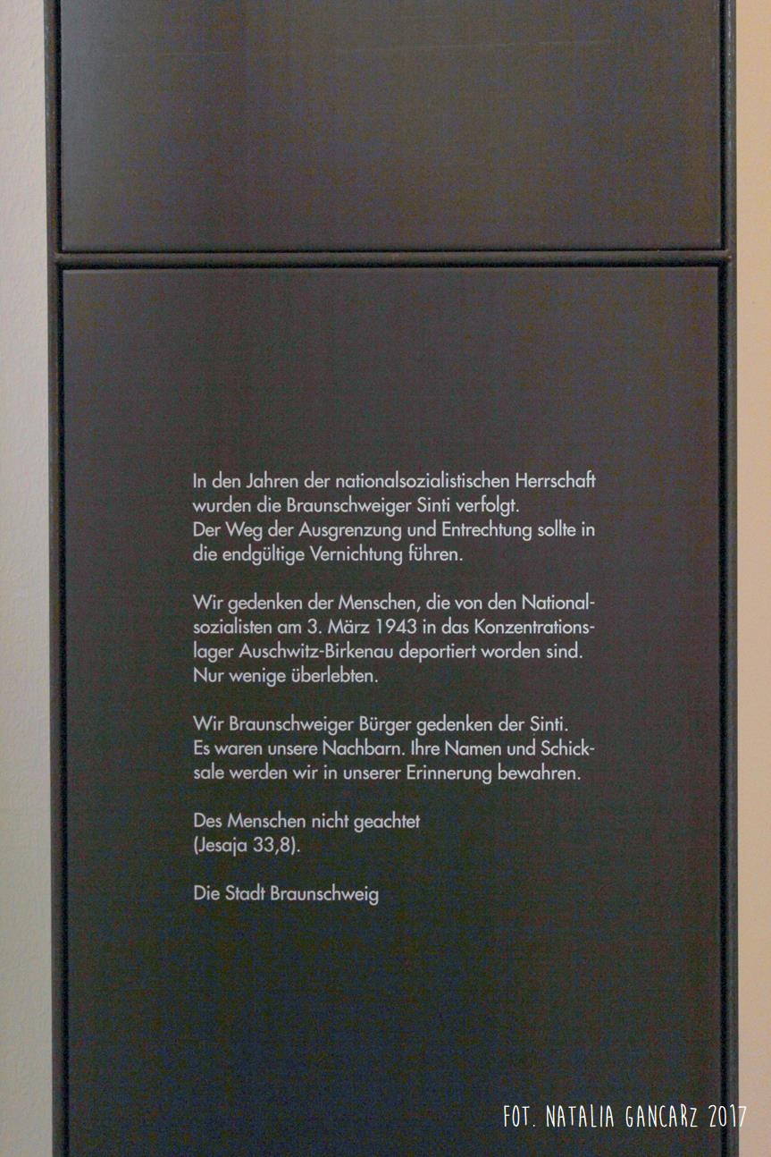 In den Jahren den nationalsozialistischen Herrschaft / wurden die Braunsweiger Sinti verfolgt. / Der Weg der Ausgrenzung und Entrechtung sollte in / die endgültige Vernichtung führen. // Wir Gedenken der Menschen, die von den National- / -sozialisten am 3. Märch 1943 in das Konzentrations- / -lager Auschwitz-Birkenau deportiert worden sind. / Nur wenige überlebten. // Wir Breunschweiger Bürger gedenken der Sinti. / Es waren unsere Nachbarn. Ihre Namen und Schick- / -sale werden wir in unserer Erinnerung bewahren. // Das Menschen nicht geachtet / (Jessaja 33,8). // Die Stadt Braunschweig
