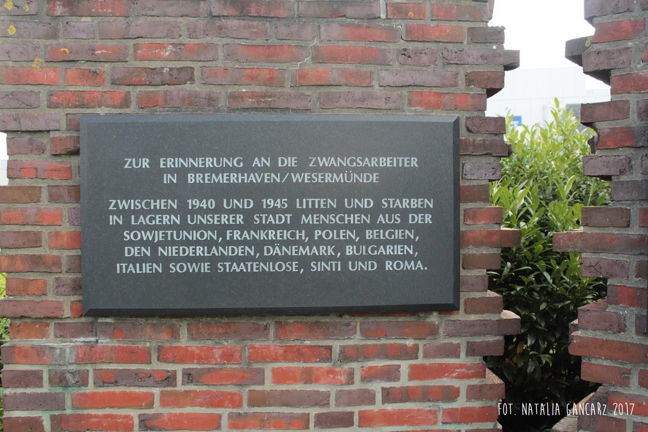 ZUR ERINNERUNG AN DIE ZWANGSARBEITER / IN BREMERHAVEN/WESERMÜNDE. // ZWISCHEN 1940 UND 1945 LITTEN UND STARBEN / IN LAGERN UNSERER STADT MENSCHEN AUS DER / SOWJETUNION, FRANKREICH, POLEN, BELGIEN, / DEN NIEDERLANDEN, DÄNEMARK, BULGARIEN, / ITALIEN SOWIE STAATENLOSE, SINTI UND ROMA.