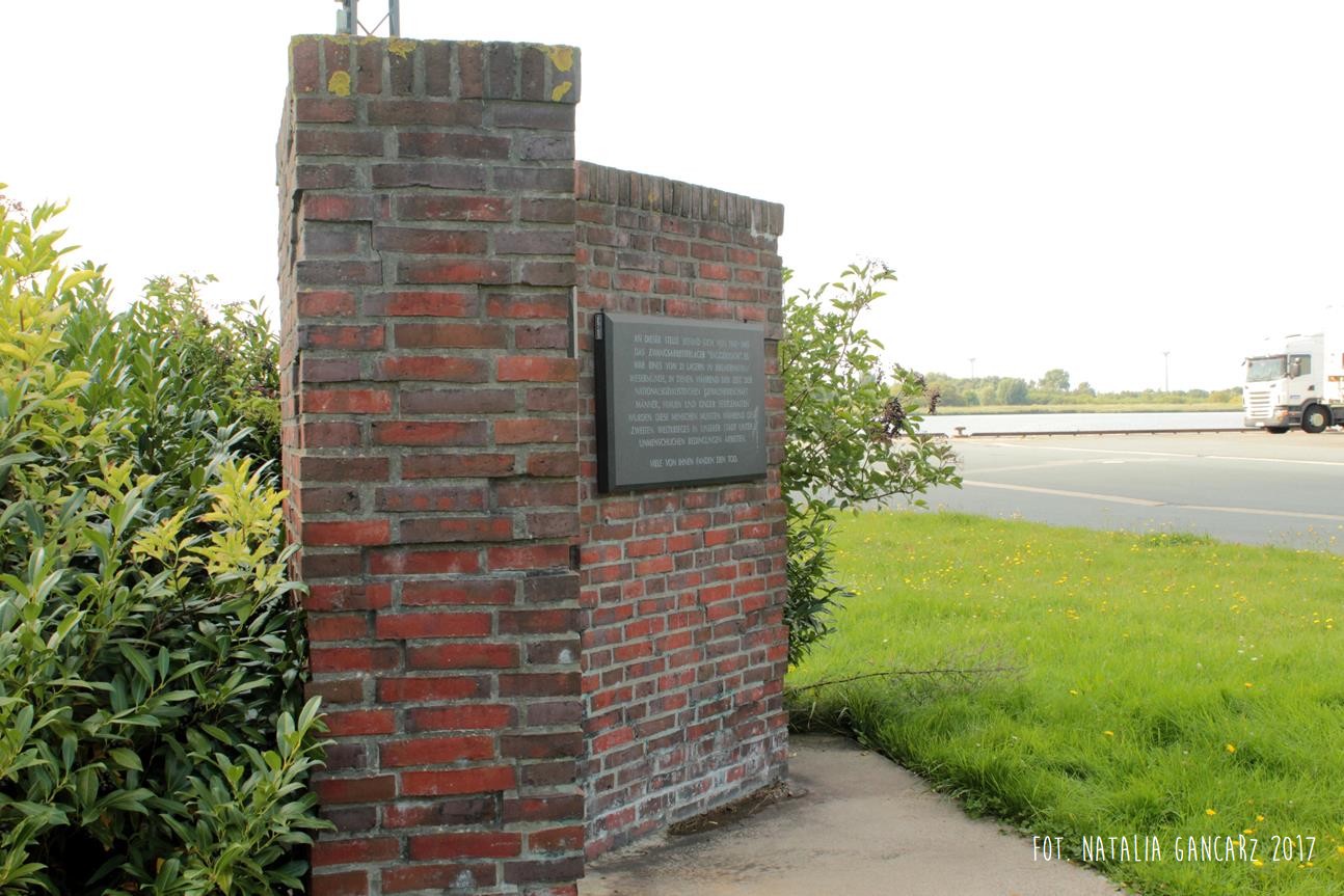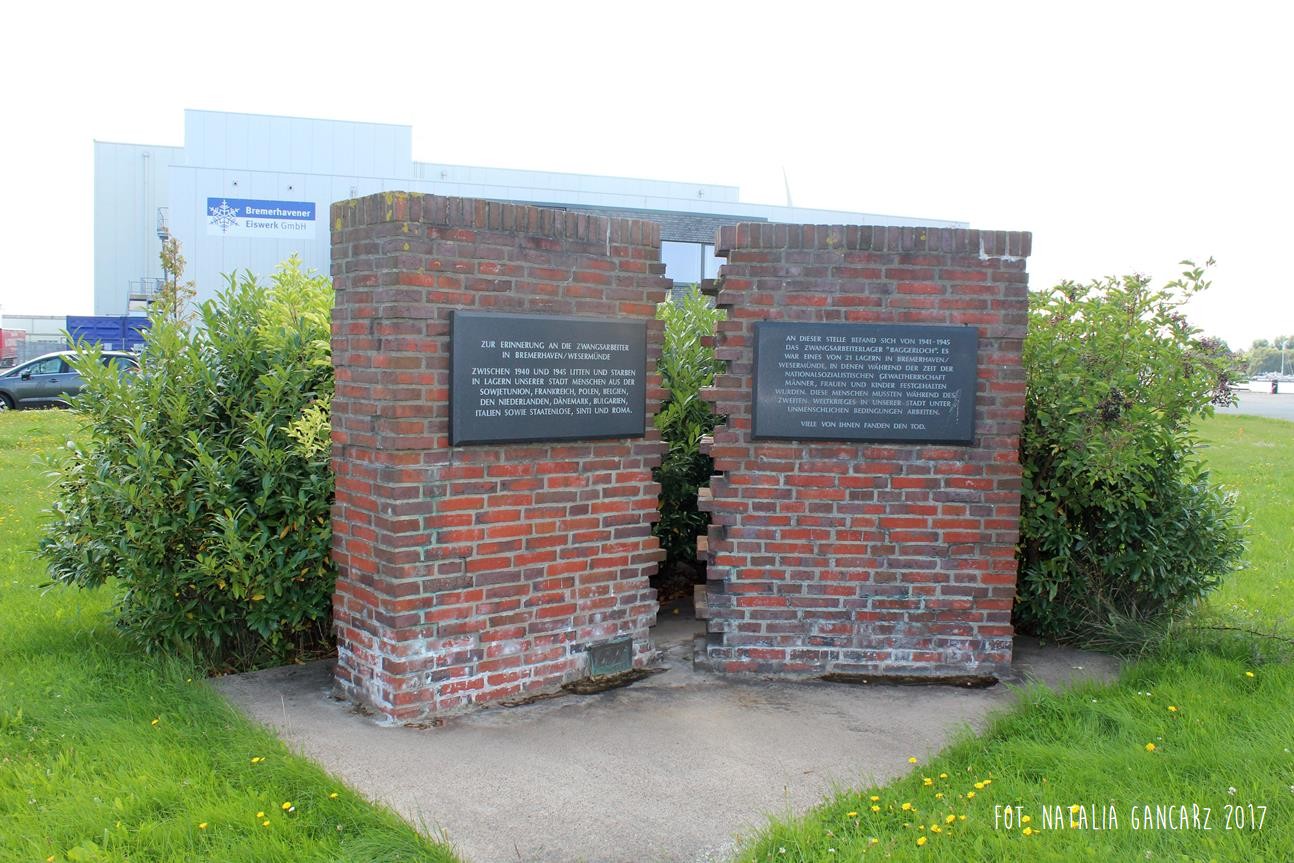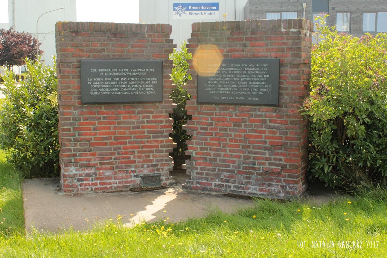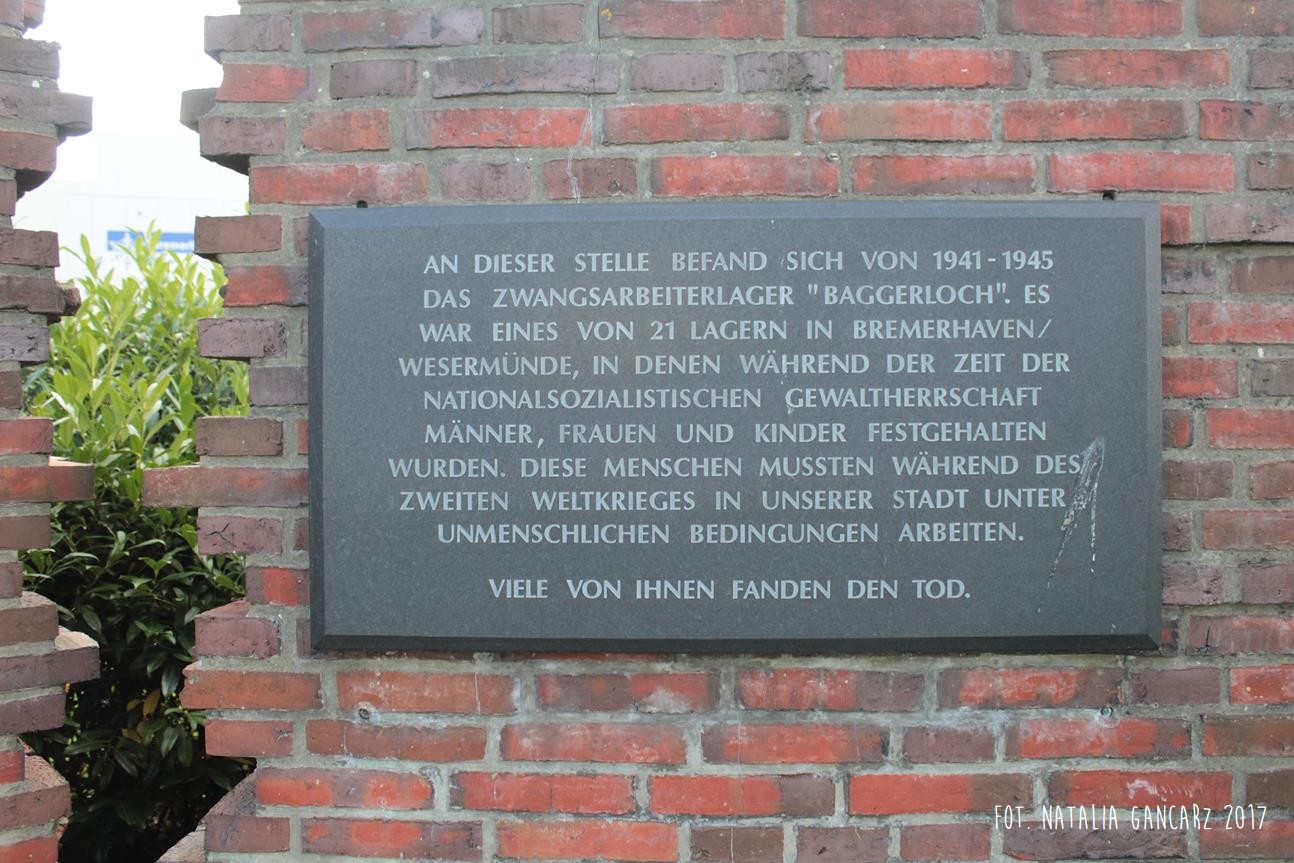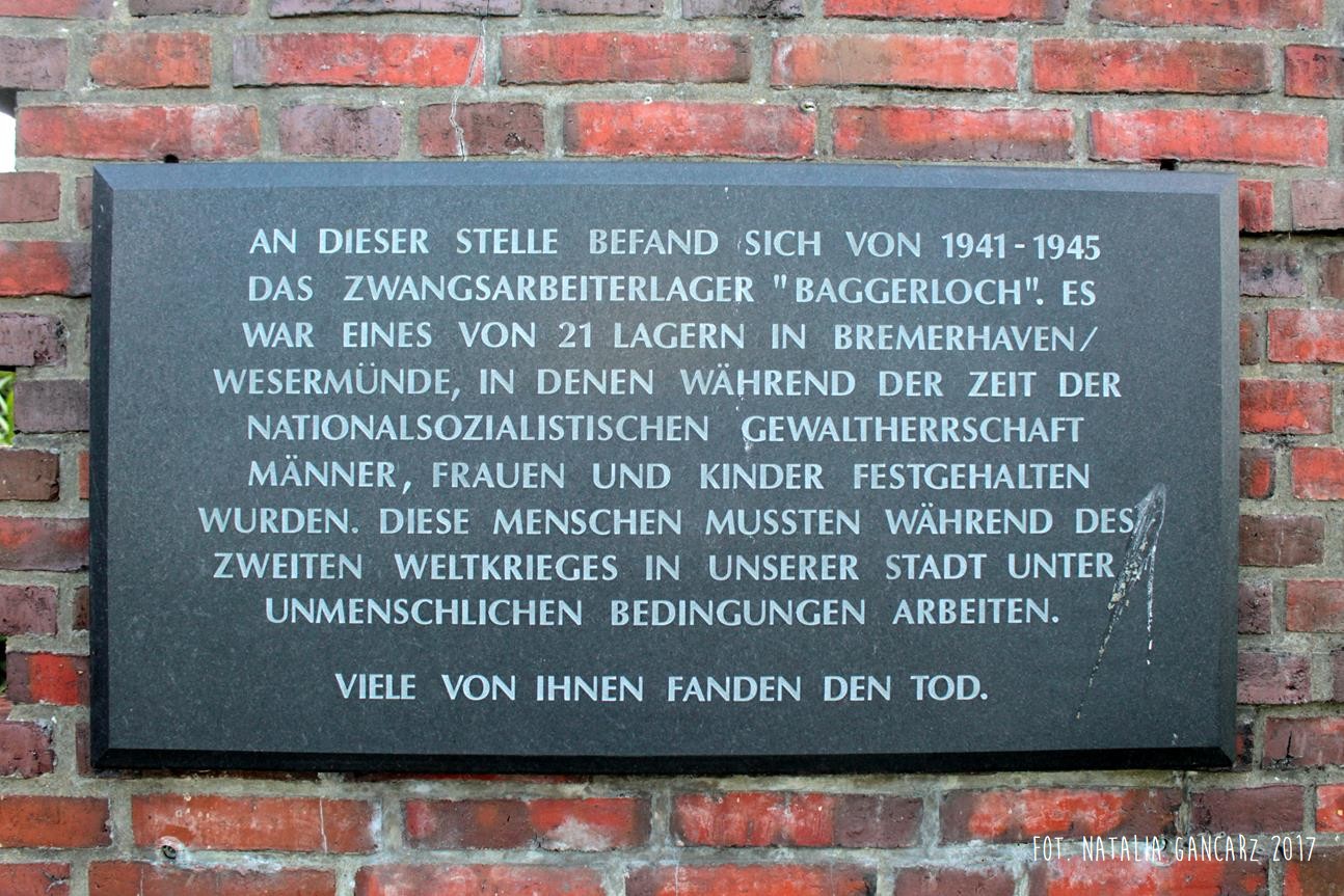 W tym miejscu w latach 1941-45 mieścił się obóz pracy przymusowej „Baggerloch”. Był to jeden z 21 obozów na terenie Bremerhaven/Wesermünde, w którym przetrzymywano mężczyzn, kobiety i dzieci. W czasie II wojny światowej ci ludzie musieli pracować w naszym mieście w nieludzkich warunkach. Wielu spotkała śmierć.