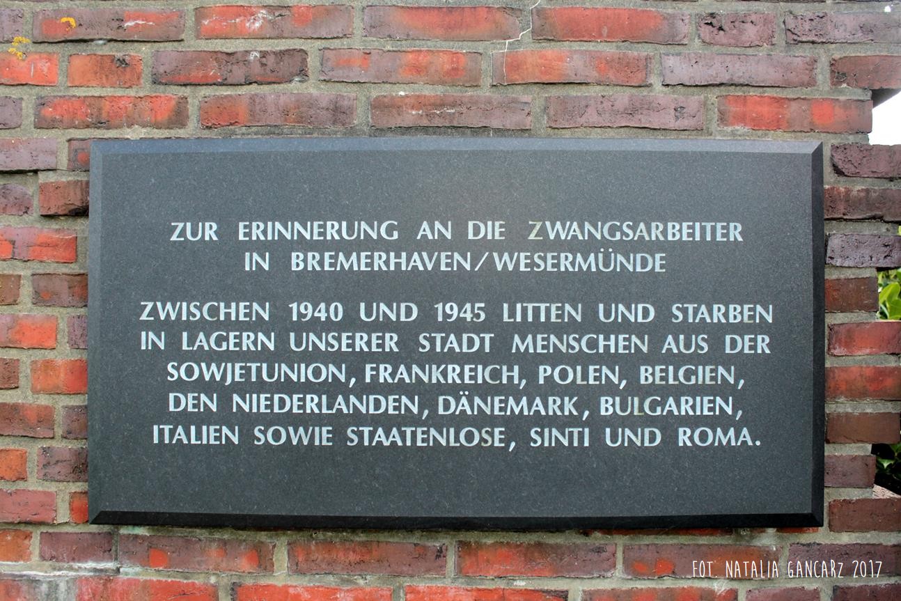 Ku pamięci przymusowych robotników w Bremerhaven/Wesermünde. Między 1940 a 1945 w obozie w naszym mieście cierpieli i umierali ludzie ze Związku Radzieckiego, Francji, Polski, Belgii, Niderlandów, Danii, Bułgarii, Italii oraz bezpaństwowcy i Cyganie.