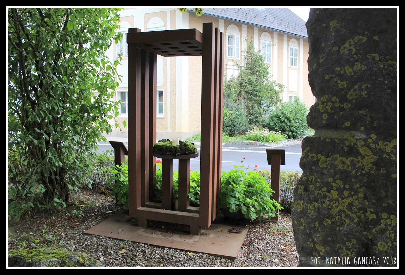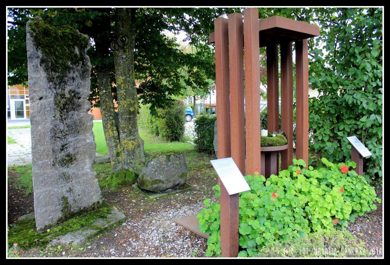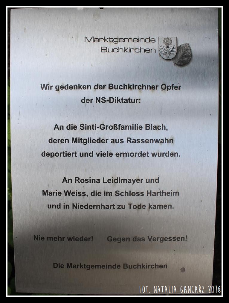 Dla upamiętnienia ofiar dyktatury narodowosocjalistycznej: pochodzącej z Buchkirchen wielkiej rodziny Snti Blach, której członkowie z powodu uprzedzeń/złudzeń rasowych zostali deportowani, a wielu z nich zamordowano. Ku pamięci Rosiny Leidlmayer i Marii Weiss, które zmrły w zamku Hartheim oraz Niedernhart. Nigdy więcej! Nie zapomnij! Gmina Miasta Buchkirchen
