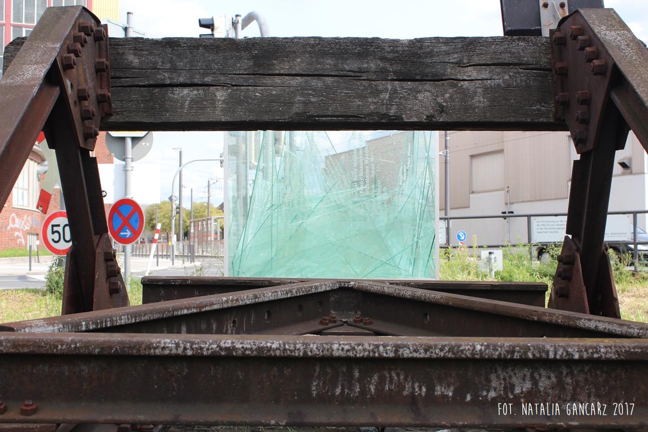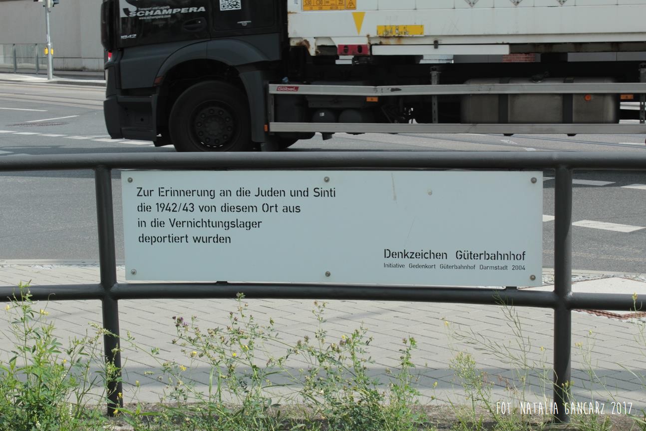 Pamięci Żydów I Sinti, którzy w 1942/43 z tego miejsca byli deportowani do obozów zagłady. // Dworzec Towarowy Denkzeichen (dosł. Stocznia towarowa) // Inicjatywa Miejsce Pamięci Güterbahnhof Darmstadt 2004.