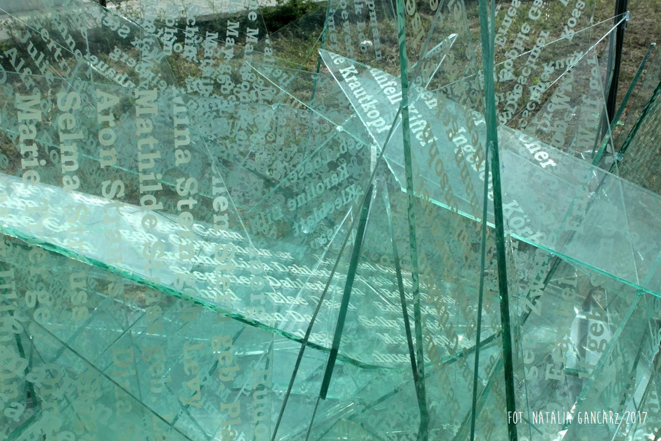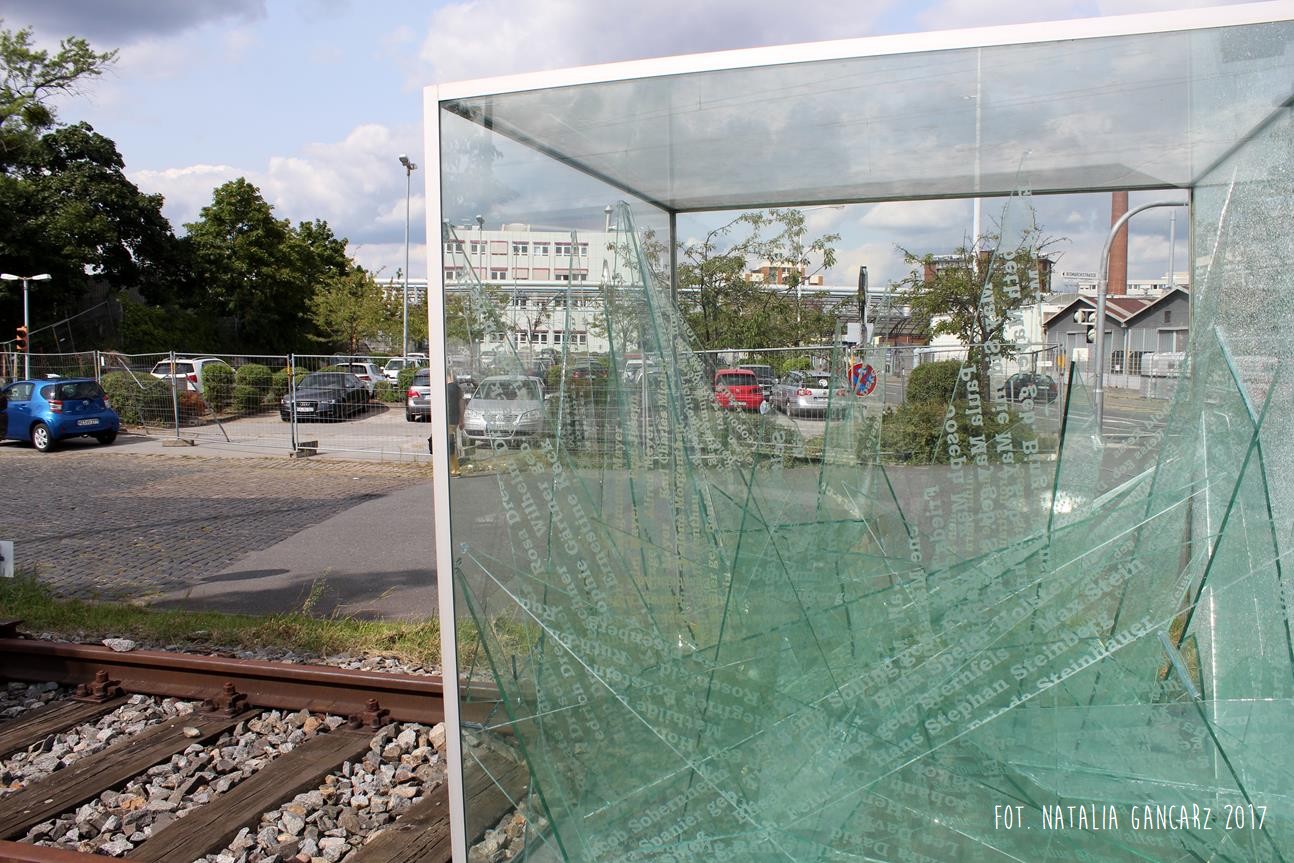 Pomnik składa się ze szklanego akwarium w kształcie sześcianu. Wypełnione jest ono popękanymi szybami, dużymi i ostrymi odłamkami, na których wygrawerowano ok. 600 nazwisk Żydow oraz Romów i Sinti z terenu (landu) Hessen, którzy zostali stąd wywiezieni. Nazwiska te są symboliczną delegacją ok. 3400 ludzi z regionu Ren-Men (region Frankfurt/Ren-Men zajmuje teren południowej części Hesji oraz części sąsiadujących krajów związkowych, tj. Nadrenii-Palatynatu i Bawarii).