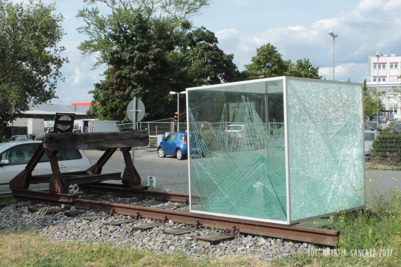 Am 7.11.2004 wurde das „Denkzeichen Güterbahnhof” in Erinnerung / an die Juden und Sinti, die von diesem Ort aus deportiert wurden, / eingeweiht. // In der Nach vom 9.07. auf den 10.07.2006 wurde das „Denkzeichen Güterbahnhof” durch Gewalt beschädigt, drei Seiten / des Glaskubus sind zerstört. Das Denkzeichen hat standgehalten.