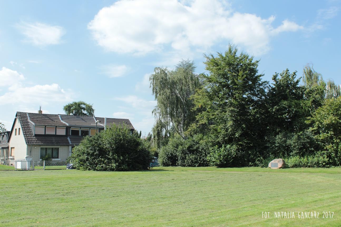 W północnym krańcu pola zwanego dziś Heinefeld Platz, przy ścieżce przecinającej plac ze wschodu na zachód znajduje się pomarańczowo-czerwony jasny, niewysoki kamień, z umieszczoną na nim tablicą z brązu. Na jej matowym tle wyraźnie widoczny jest wypukły napis ozdobną czcionką. Całość tablicy stylizowana na obramowaną.