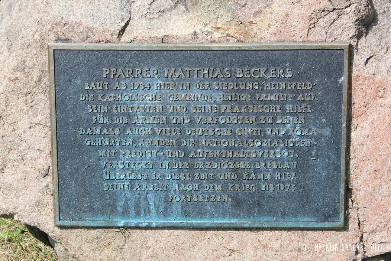 Pfarrer Matthias Beckers / baut ab 1934 hier in der Siedlung 'Heinefeld’ / die katholische Gemeinde 'Heilige Familie’ auf. / Sein Eintreten und seine praktische Hilfe / für die Armen und Verfolgten, zu denen / damals auch viele deutsche Sinti und Roma / gehörten, ahnden die Nationalsozialisten / mit Predigt- und Aufenthaltsverbot. / Versteckt in der Erzdiözese Breslau / überlebte er diese Zeit und kann hier / seine Arbeit nach dem Krieg bis 1975 / fortsetzen.
