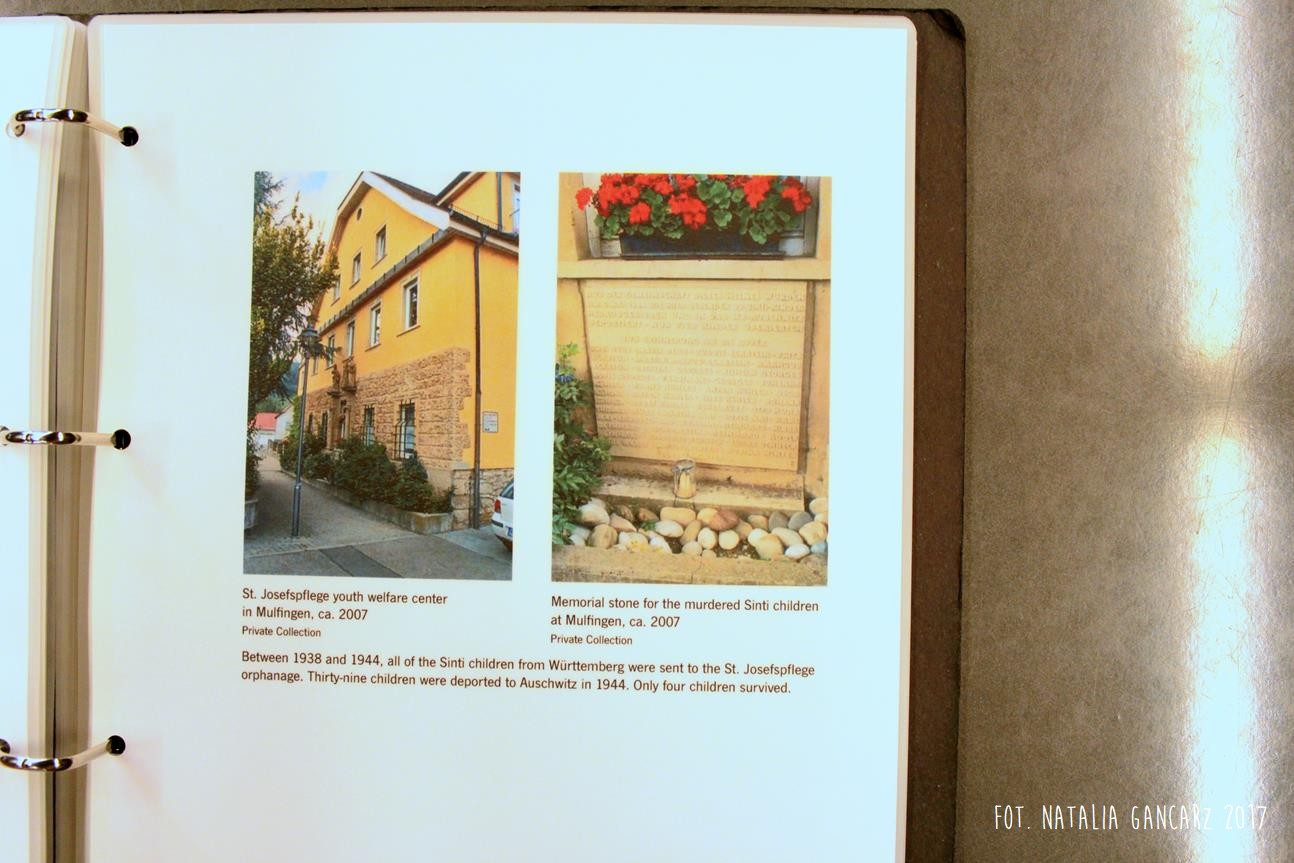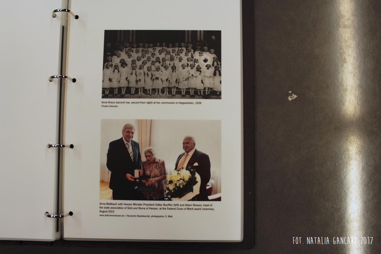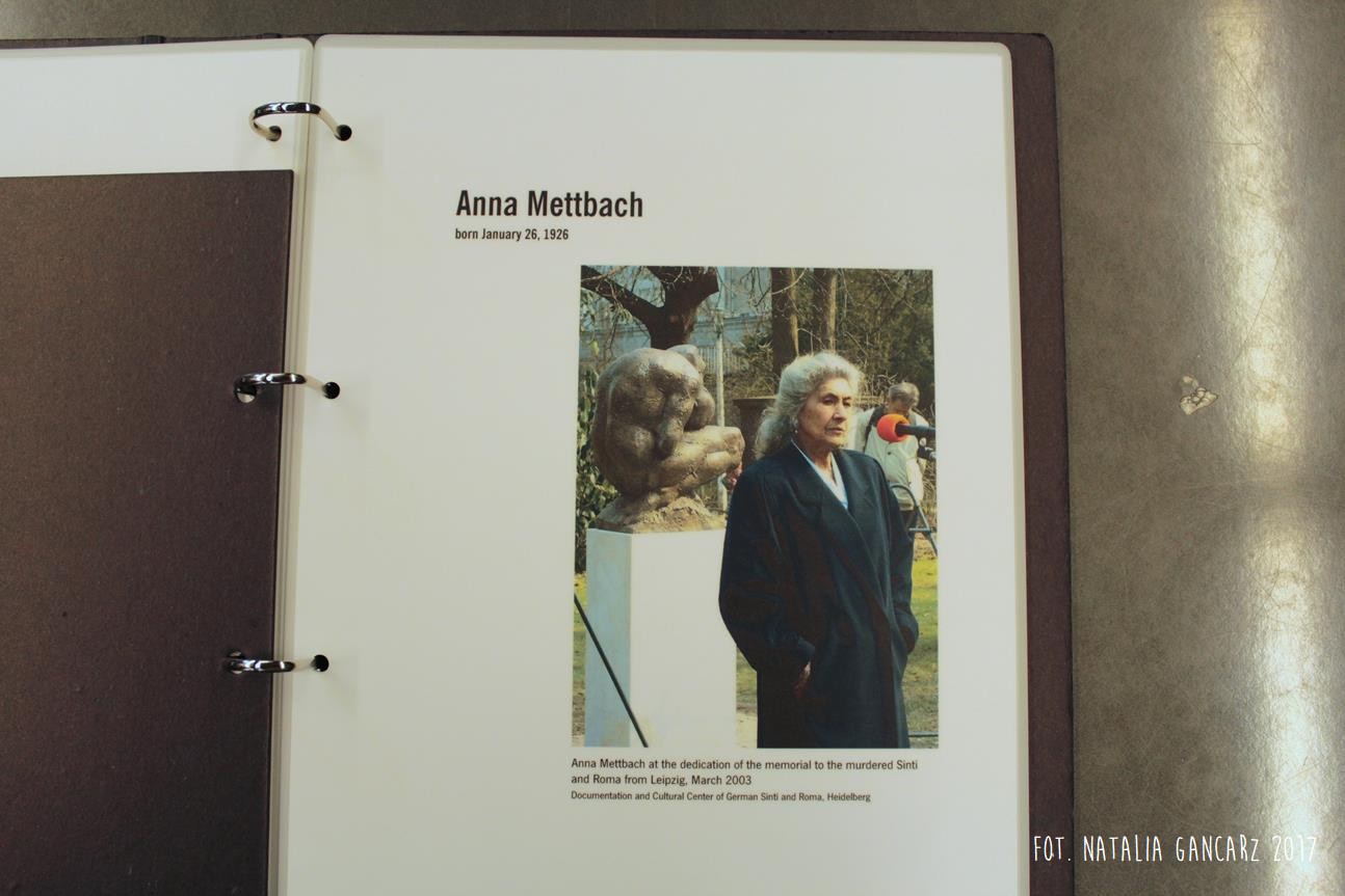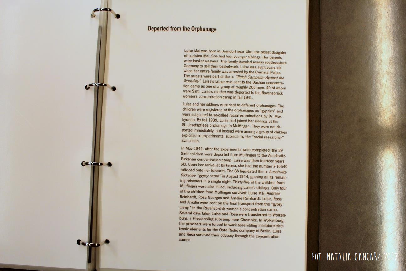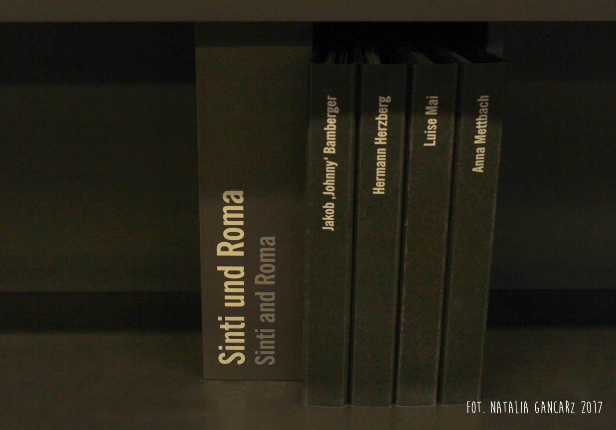 Po drugie – nieopodal planszy ze Stojanem Lassischem znajduje się wydzielona przestrzeń, w której można usiąść i postudiować dzieje przedstawicieli poszczególnych narodów, więzionych w obozie. Na „Regale Pamięci” ustawiono księgi poświęcone wybranym, znanym z nazwiska i historii, więźniom obozu, opisanym wedle narodowości. Spośród Romów odnajdujemy tutaj historie ocalonych: Jacoba „Johna” Bambergera (boksera; jednego z 44 Sintów, na których dokonywano eksperymenty medyczne w KL Dachau), Hermanna Herzberga (jeden ze strajkujących w 1980 r. w Dachau), Luise Mai (jedna z 39 cygańskich dzieci, które zostały wywiezione z sierocińca w Mulfingen 1938-44; tylko czwórka, wśród nich Luise – przeżyła) i Anna Mettbach.