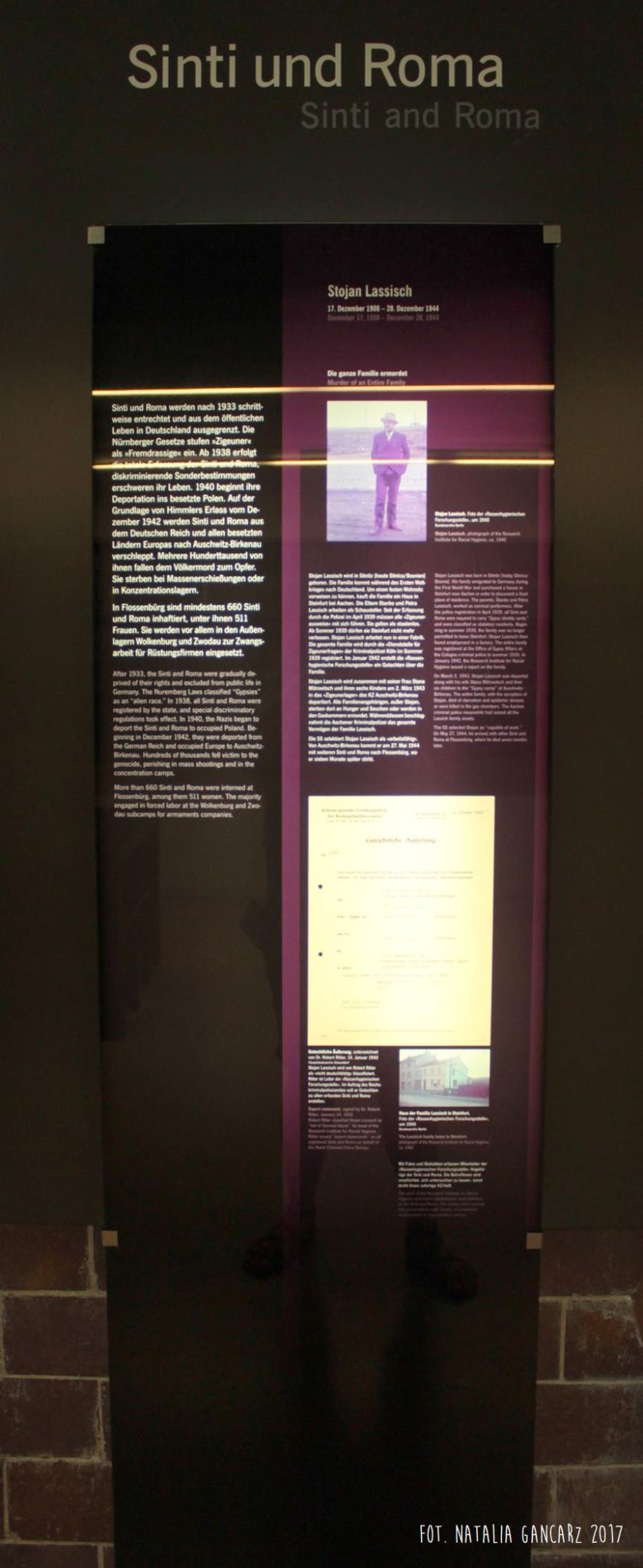 Na tej samej tablicy przedstawiona jest sylwetka Stojana Lassischa, bośniackiego Roma, którego rodzina wyemigrowała do Niemiec w czasie I wojny światowej. 2 marca 1943 r. wraz z całą rodziną został deportowany do KL Auschwitz-Birkenau, gdzie większość rodziny zmarła z powodu chorób lub została zagazowana. Sam Stojan znalazł się w grupie Romów i Sinti, zakwalifikowanych jako „zdolni do pracy” i przywiezionych z Auschwitz do KL Flossenbürg 27 maja 1944 r. Zmarł tutaj siedem miesięcy później.