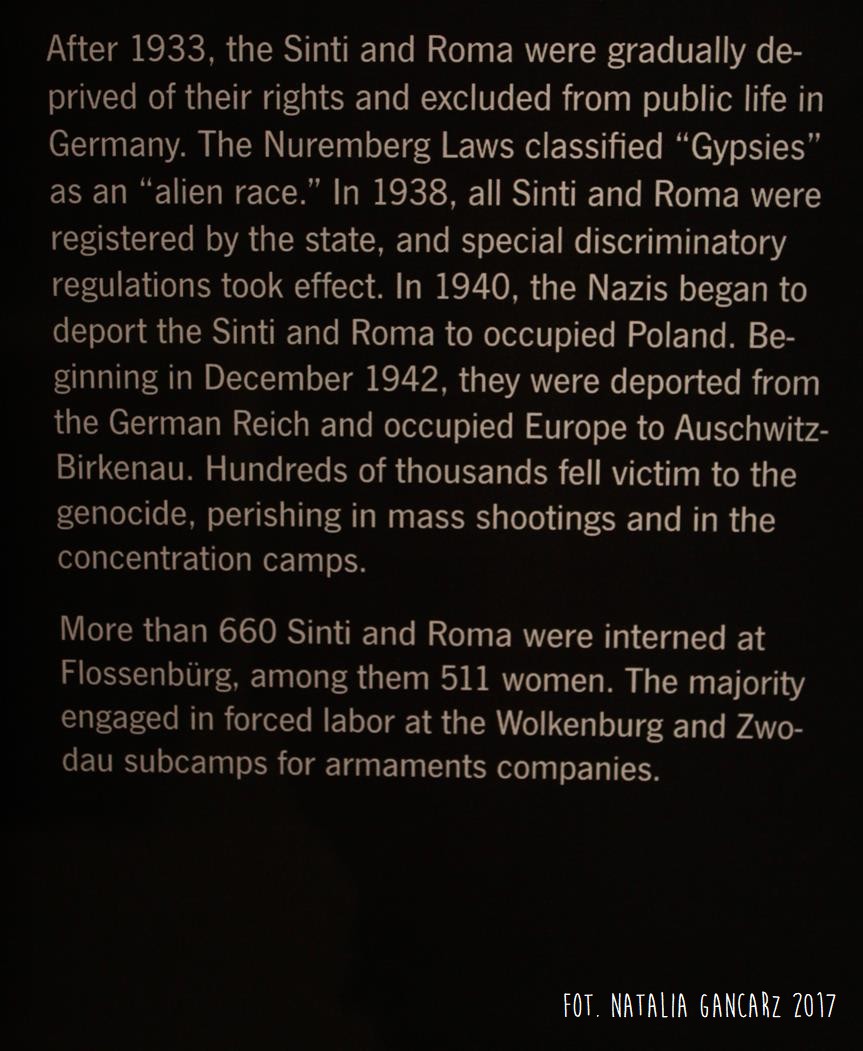 Stała wystawa „Obóz koncentracyjny Flossenbürg 1938-1945” mieści się w budynku dawnej łaźni/pralni obozowej. Romowie i Sinti pojawiają się na wystawie głównej trzykrotnie. Po pierwsze, w części ogólnej na dole, pośród innych narodowości wymienieni są na osobnej tablicy Romowie i Sini wraz z bardzo skrótową informacją o zakwalifikowaniu ich przez Ustawy Norymberskie jako przedstawicieli „rasy obcej” (na tablicy jest: „alien race” (!)); dalej o deportacjach i masowej śmierci m.in. w KL Auschwitz-Birkenau.