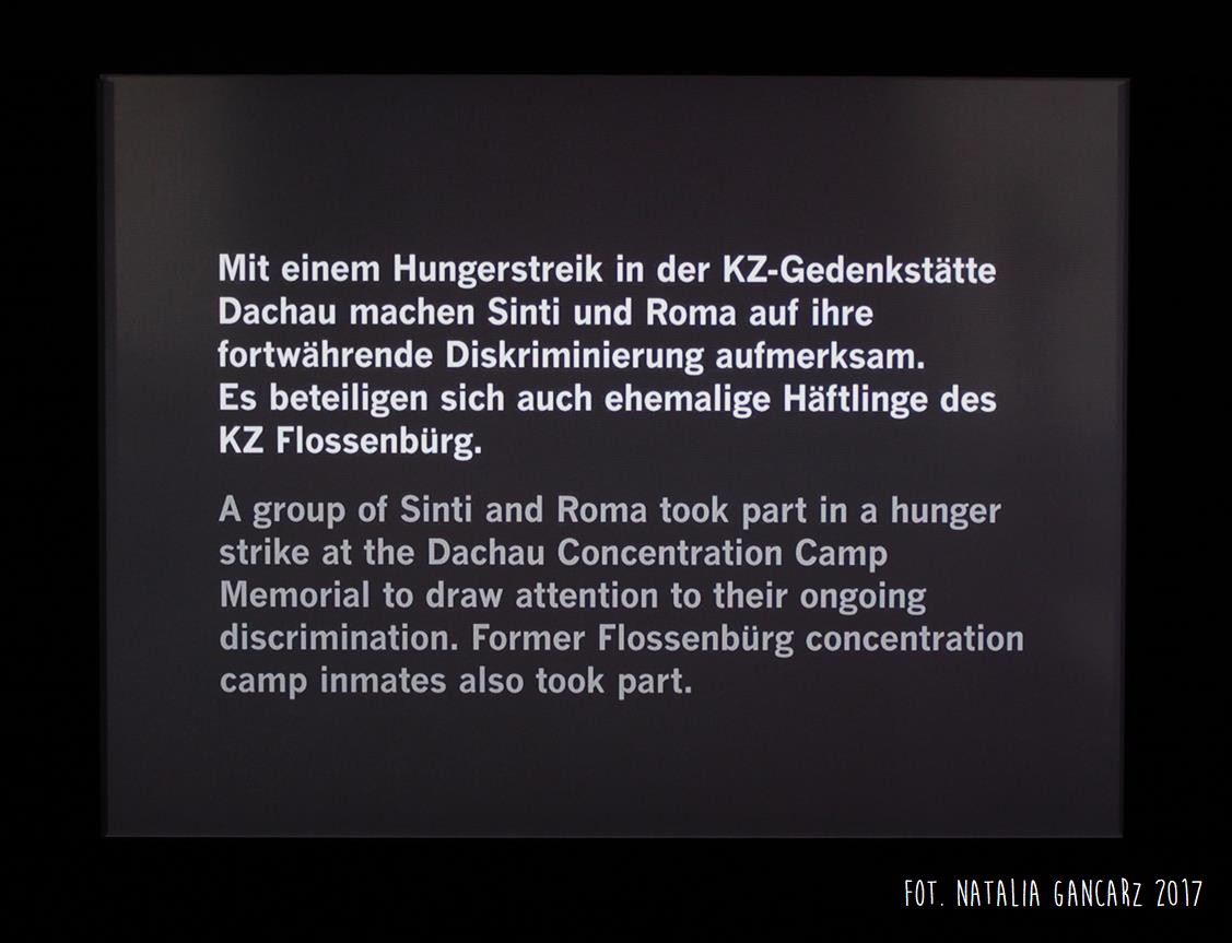 Trzeci element to prezentacja filmowa dotycząca strajku głodowego, który przeprowadzili Sinti i Romowie w dawnym obozie Dachau w roku 1980. Kilkunastu działaczy cygańskich, m.in. Rudko Kawczyński (Polski Rom), Hermann Herzberg (więzień obozów Flossenbürg, Dachau, Bergen-Belsen), Romani Rose (lider Dokumentations- und Kulturzentrum Deutscher Sinti und Roma, najważniejszej niemieckiej organizacji cygańskiej) – żądało oficjalnego uznania Romów i Sintów za ofiary narodowego socjalizmu. To wydarzenie traktowane jest dziś przez badaczy tematu jako pierwszy akt upamiętnienia romskich ofiar II wojny światowej, jak również jeden z pierwszych i najważniejszych momentów w budowaniu nowoczesnej tożsamości romskiej.