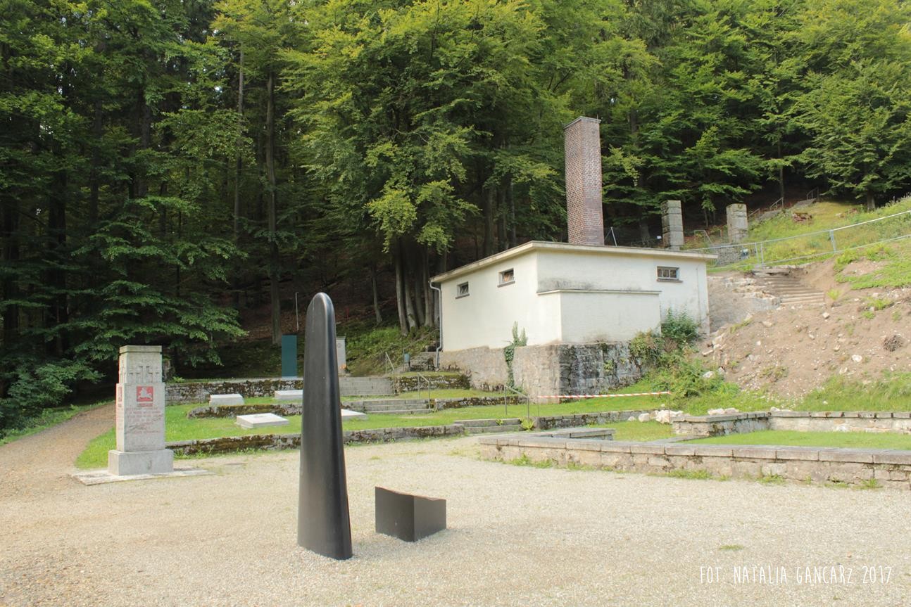 W tzw. Dolinie Śmierci, blisko Piramidy Prochów mieści się niezwykły pomnik: gładki, szlifowany, czarny granit o obłym kształcie, przypominającym wbite w ziemię skrzydło samolotu (więźniowieb obozu pracowali na rzecz zakładów Messerschmitta). Tuż przed skrzydłem – ten sam rodzaj kamienia wycięty na kształt odwróconego czarnego trójkąta (symbol nadawany więźniom zakwalifikowanym jako Cyganie/Romowie/Sinti).