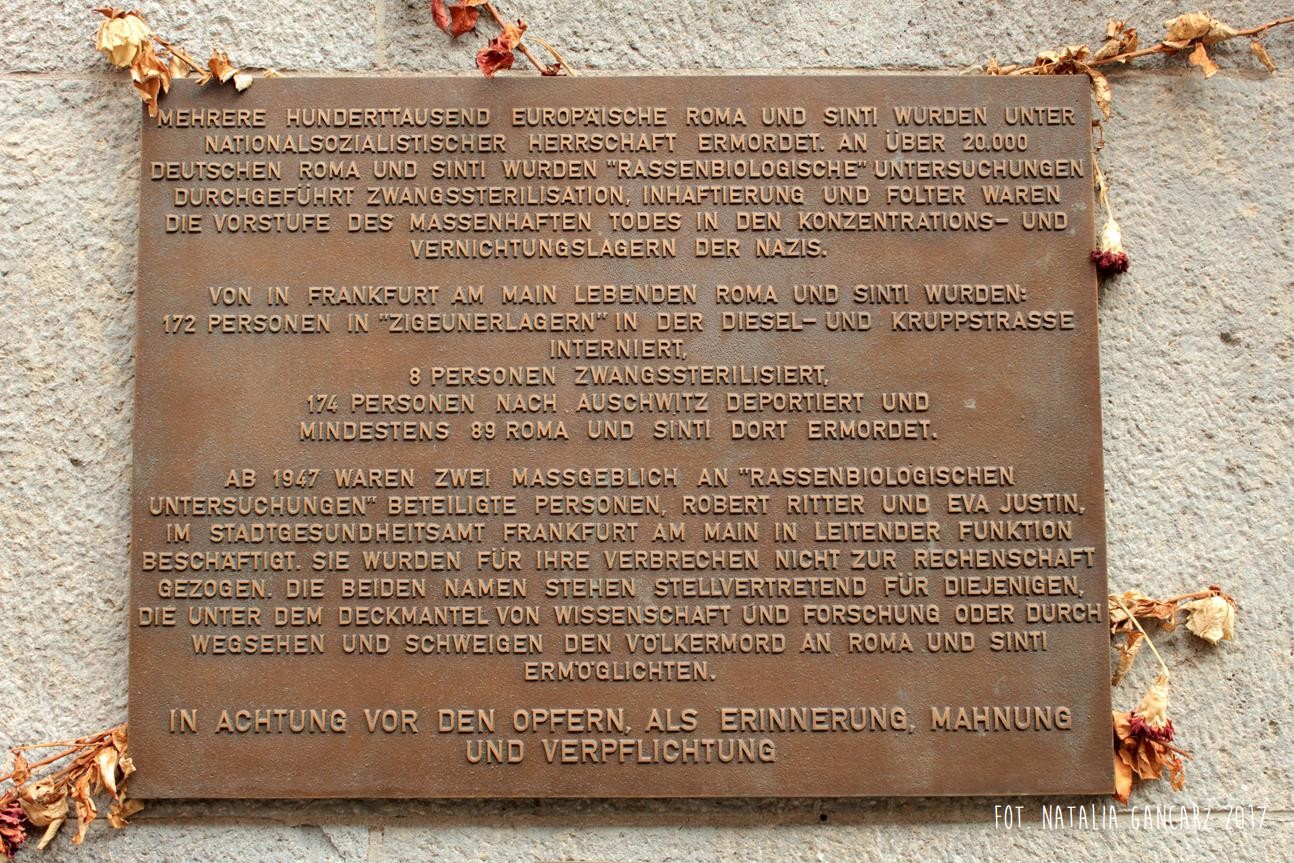 Na murze odremontowanej kamienicy Wydziału Zdrowia Miasta Frankfurt nad Menem znajduje się duża tablica, wykonana ze stali kortenowskiej z napisem w jęz. niemieckim. Poniżej kod QR kieruje do strony: http://www.gedenkorte-frankfurt-main.de/gom_orts_liste.php?PHPSESSID=4h08185rqp8mt3cqe6kpgaj304&dateiname=t_gom_gedenktafel_braubachstr , na której znajduje się opis miejsca, historia prześladowania Romów i Sinti, jak również informacje o dwójce „naukowców” wraz z ich dziejami powojennymi.