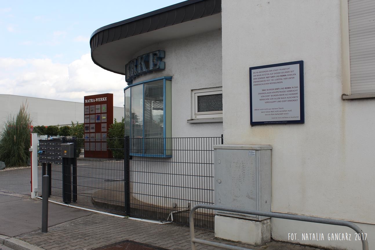 Tablica upamiętnia miejsce, gdzie przed 1937 r. mieściło się koczowisko cygańskie, przekształcone w sierpniu 1937 w zamknięty obóz. Jego więźniowie poddani zostali licznym badaniom antropologicznym i medycznym, które doprowadziły do stworzenia przez Roberta Rittera i Ewę Justin (zob. też. Frankfurt am Main (tablica, Braubachstrasse) kryteriów „cygańskości”, a następnie list deportacyjnych – głównie do obozu zagłady Auschwitz.
