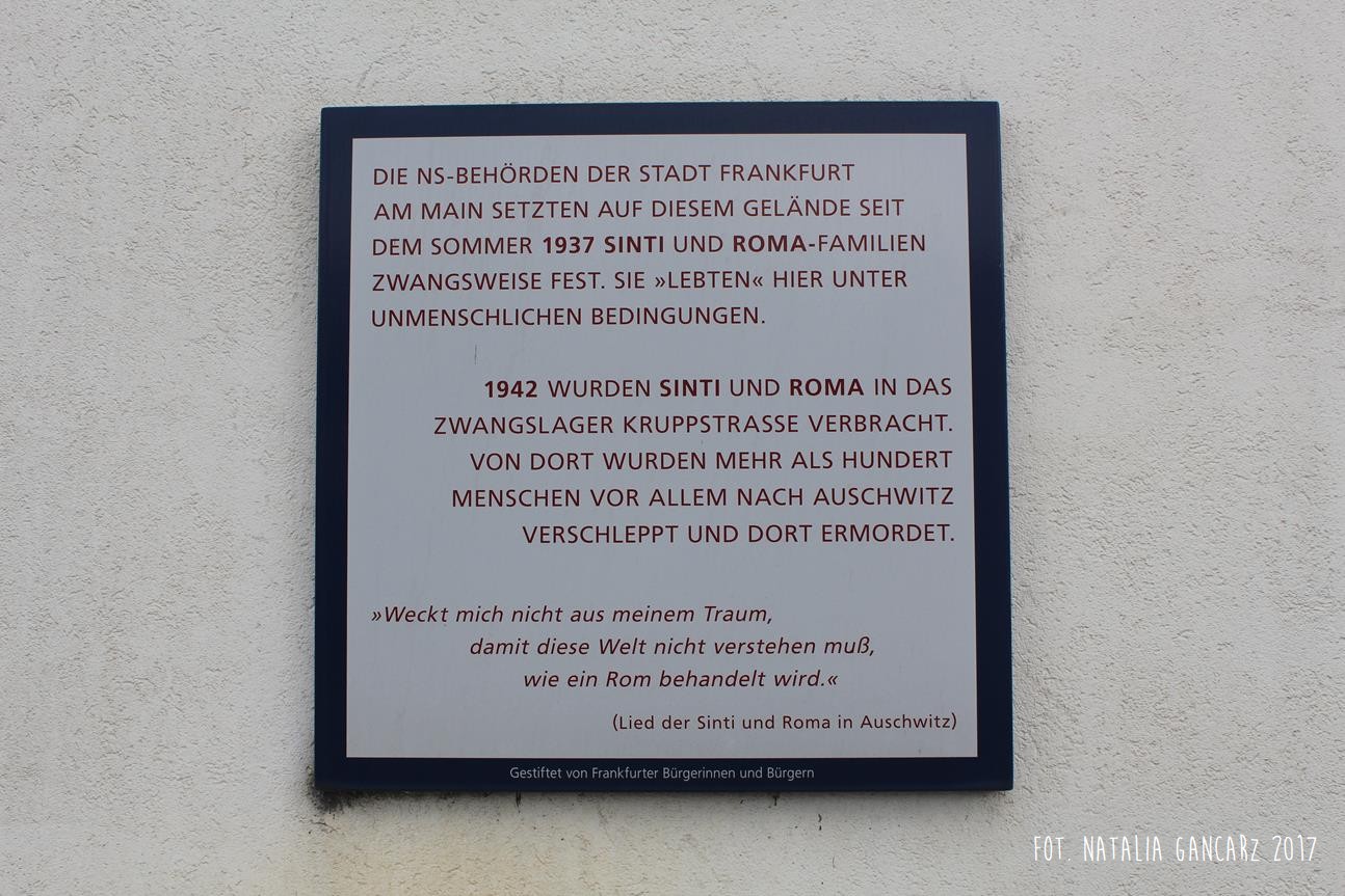 Die NS Behörden der Stadt Frankfurt / am Main setzten auf diesem Gelände seit / dem Sommer 1937 Sinti und Roma-Familien / zwangsweise fest. Sie “lebten” hier unter / unmenschlichen Bedingungen. // 1942 wurden Sinti und Roma in das / Zwangslager Kruppstraße verbracht. / Von dort wurden mehr als hundert / Menschen vor allem nach Auschwitz / verschleppt und dort ermordet. // “Weckt mich nicht aus meinem Traum, / damit die Welt nicht verstehen muß, / wie ein Rom behandelt wird.” // (Lied der Sinti und Roma aus Auschwitz)