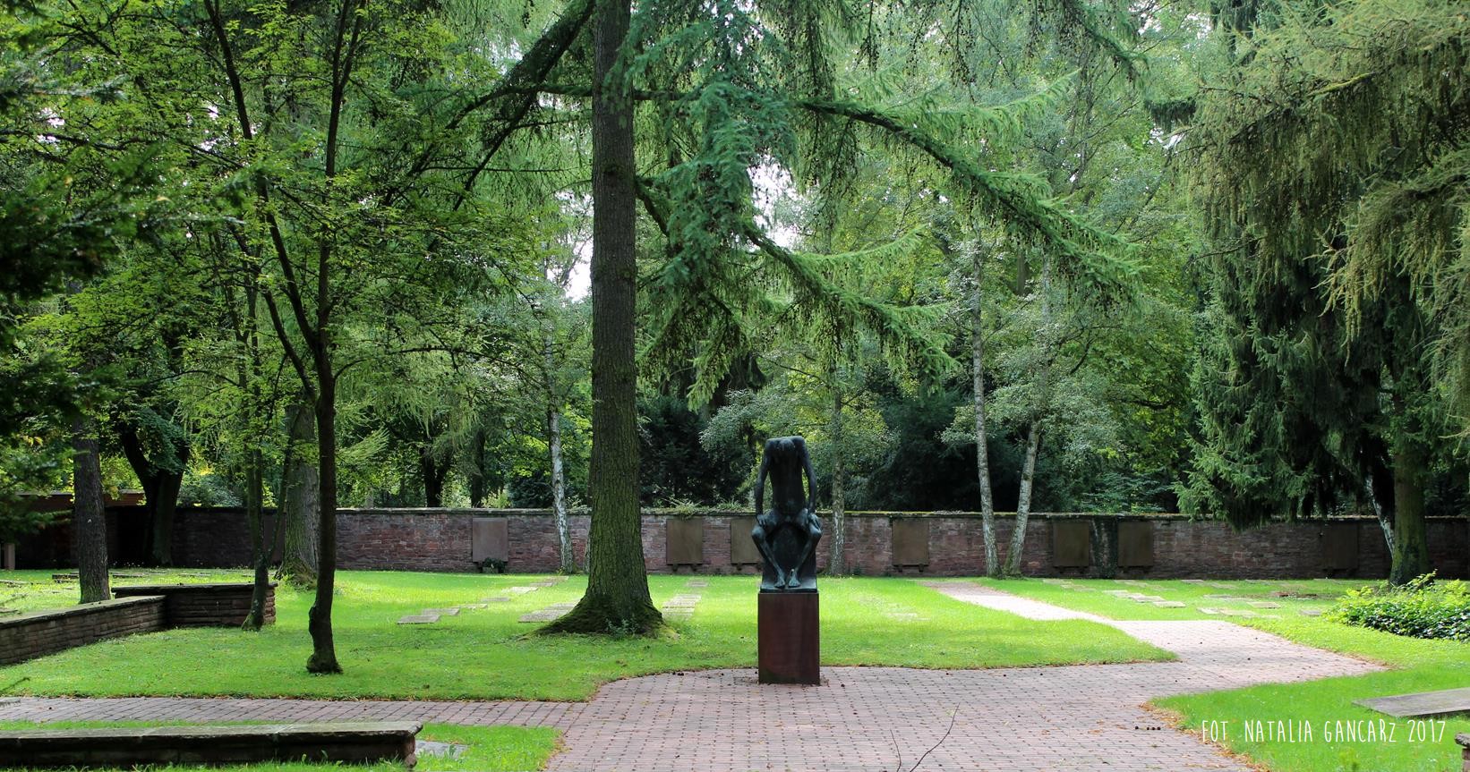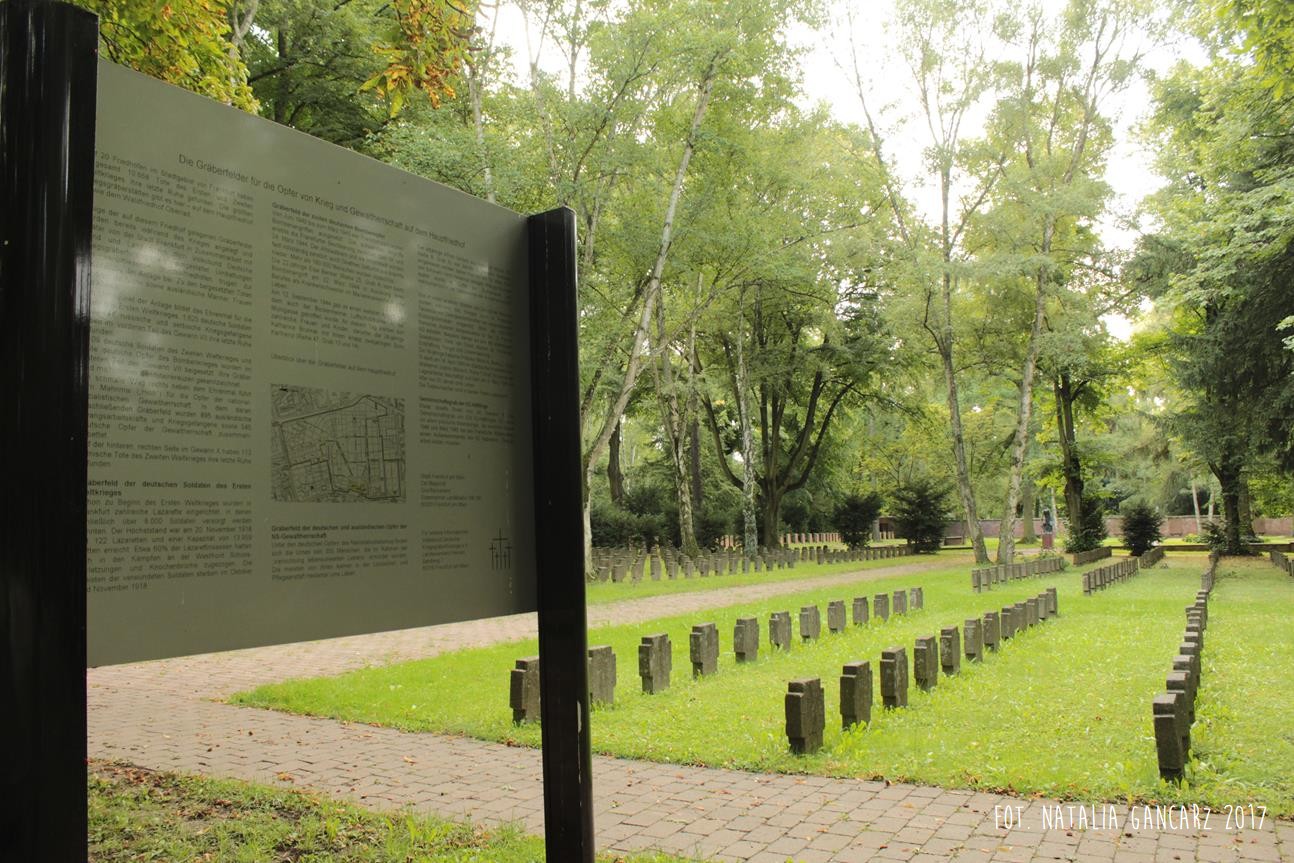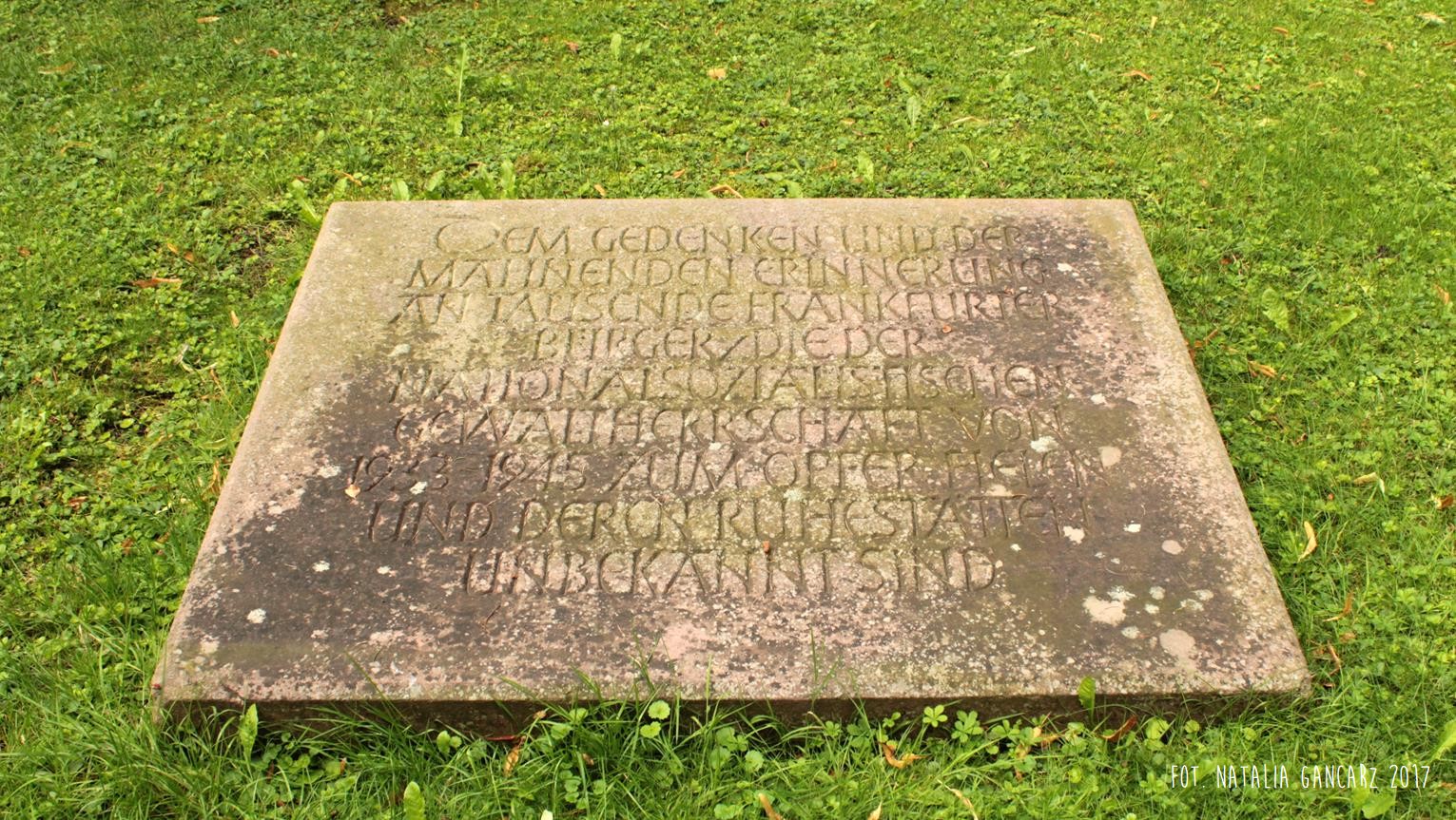 Na cmentarzu centralnym Gewann I we Frankfurcie nad Menem znajduje się duża przestrzeń poświęcona pamięci pomordowanym w czasie II wojny światowej. Na cmentarzu znajdują się szczątki 539 Niemców, którzy zginęli w obozach koncentracyjnych, zakładach karnych lub szpitalach psychiatrycznych, 617 jeńców wojennych i robotników przymusowych z byłego Związku Radzieckiego, 126 polskich jeńców wojennych i robotników przymusowych, 27 niezidentyfikowanych zmarłych i 175 zabitych, głównie z byłej Jugosławii i krajów bałtyckich. Setki jednakowych grobów, mauzoleum oraz – w samym centrum rzeźba Hioba (z brązu) na postumencie z piaskowca (postument przygotowany przez kamieniarzy cygańskich z Landau). Po lewej ręce Hioba znajdują się tablice osadzone prawie równo z gruntem. Bliższa Hioba ma charakter „ogólny”, wspomina bowiem „ofiary terroru 1933-1945”. Druga upamiętnia Romów i Sinti, którzy stali się ofiarami ludobójstwa nazistów. Napis w jęz. niemieckim.
