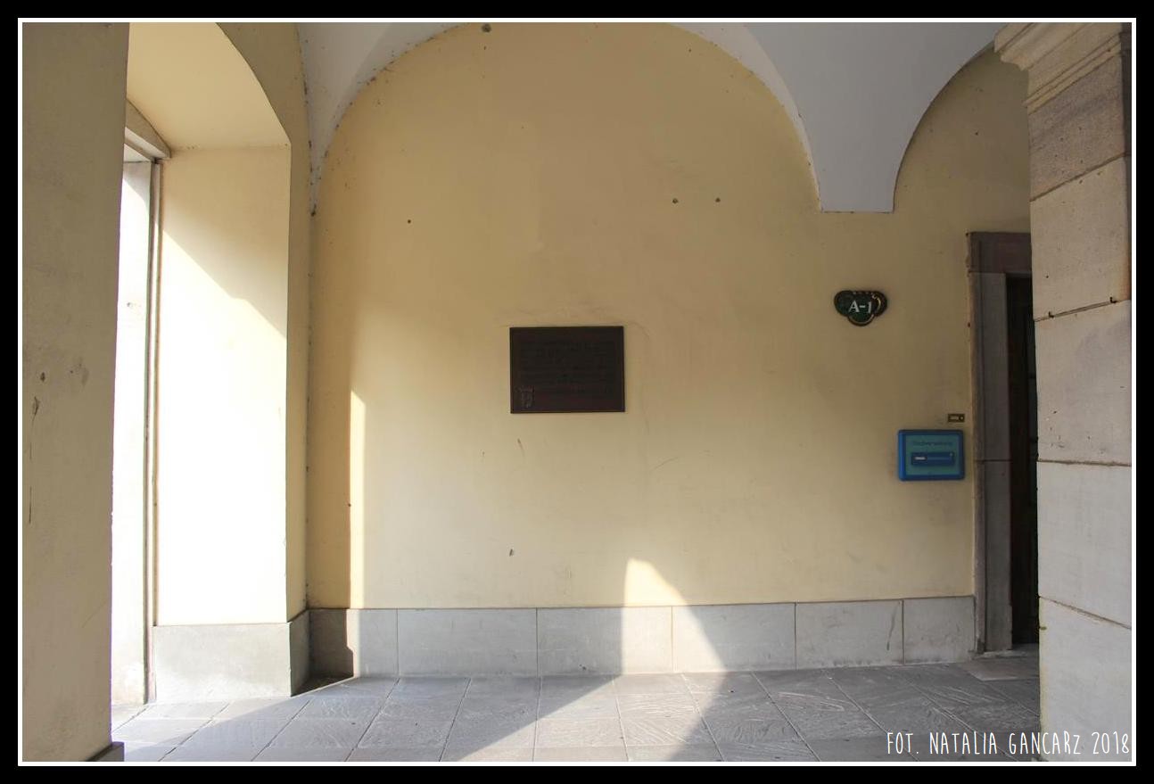 Tablica posiada napis sporządzony czcionką szeryfową, wypukłą, smukłą o ostrych krawędziach. Zapis kapitalikami. Tło tablicy lekko fakturowane, wąska ramka bez zdobień.