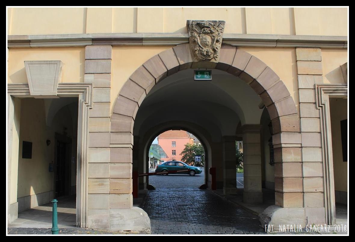 W lewym dolnym rogu znajduje się herb miasta: po lewej krzyż, po prawej trzy lilie wyrastające z jednego punktu na potrójnej chmurze. Ponad herbem znajduje się korona zakończona pięcioma blankami [jest to tzw. w heraldyce „corona muralis”, a pięcioma blankami posługiwały się w heraldyce miasta wielkie, stołeczne – przyp. G].
