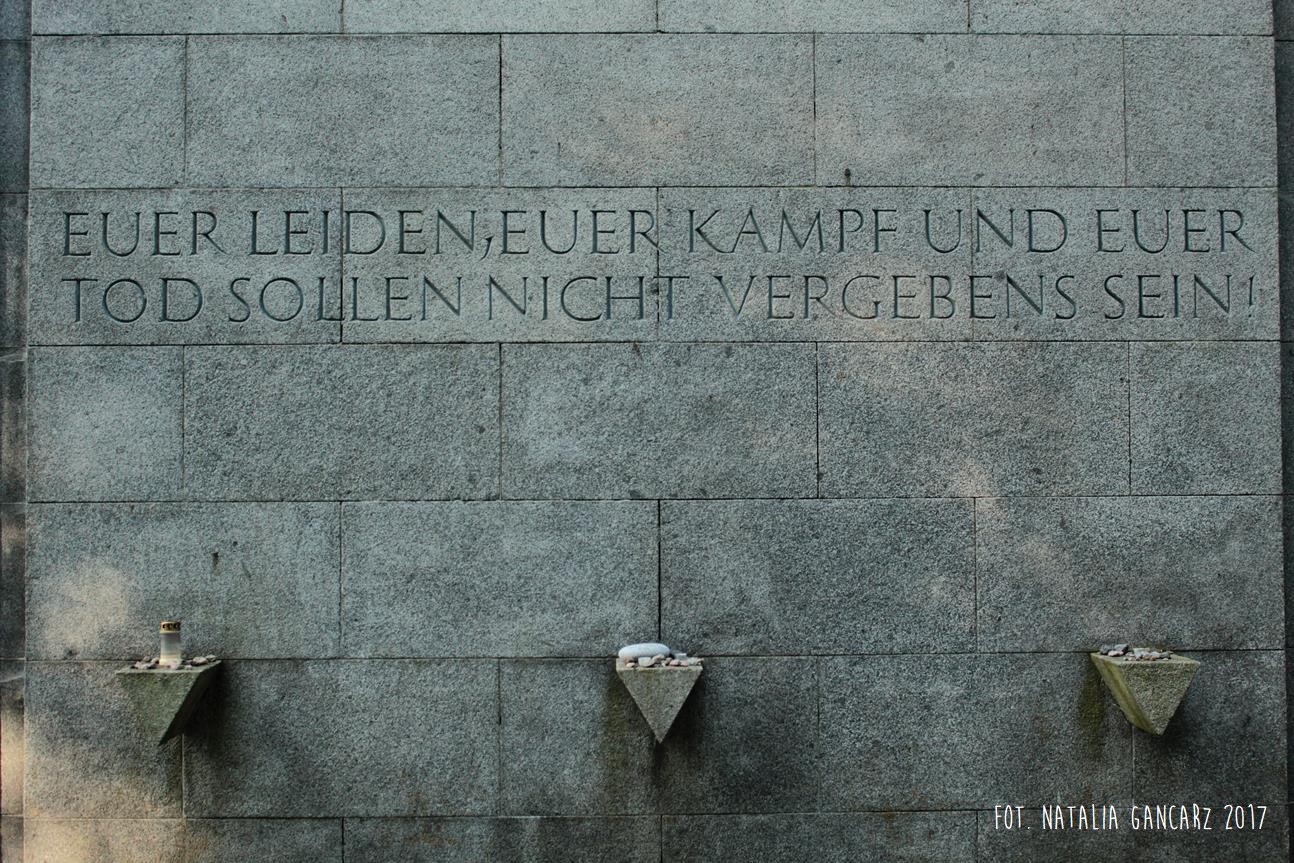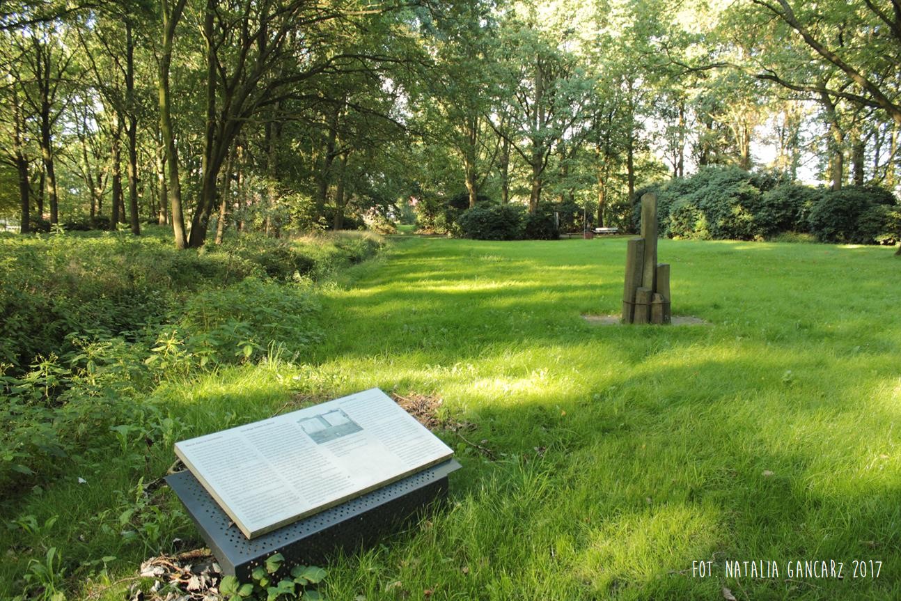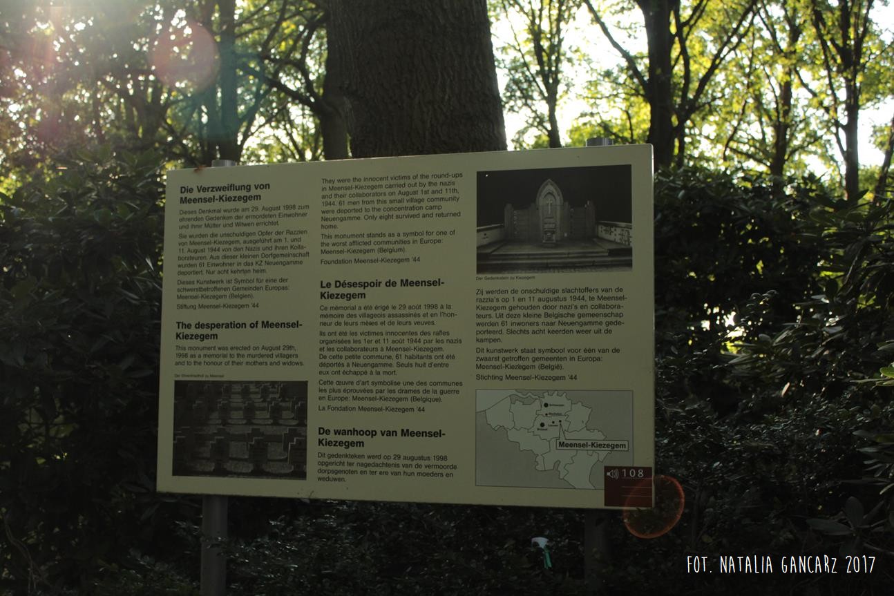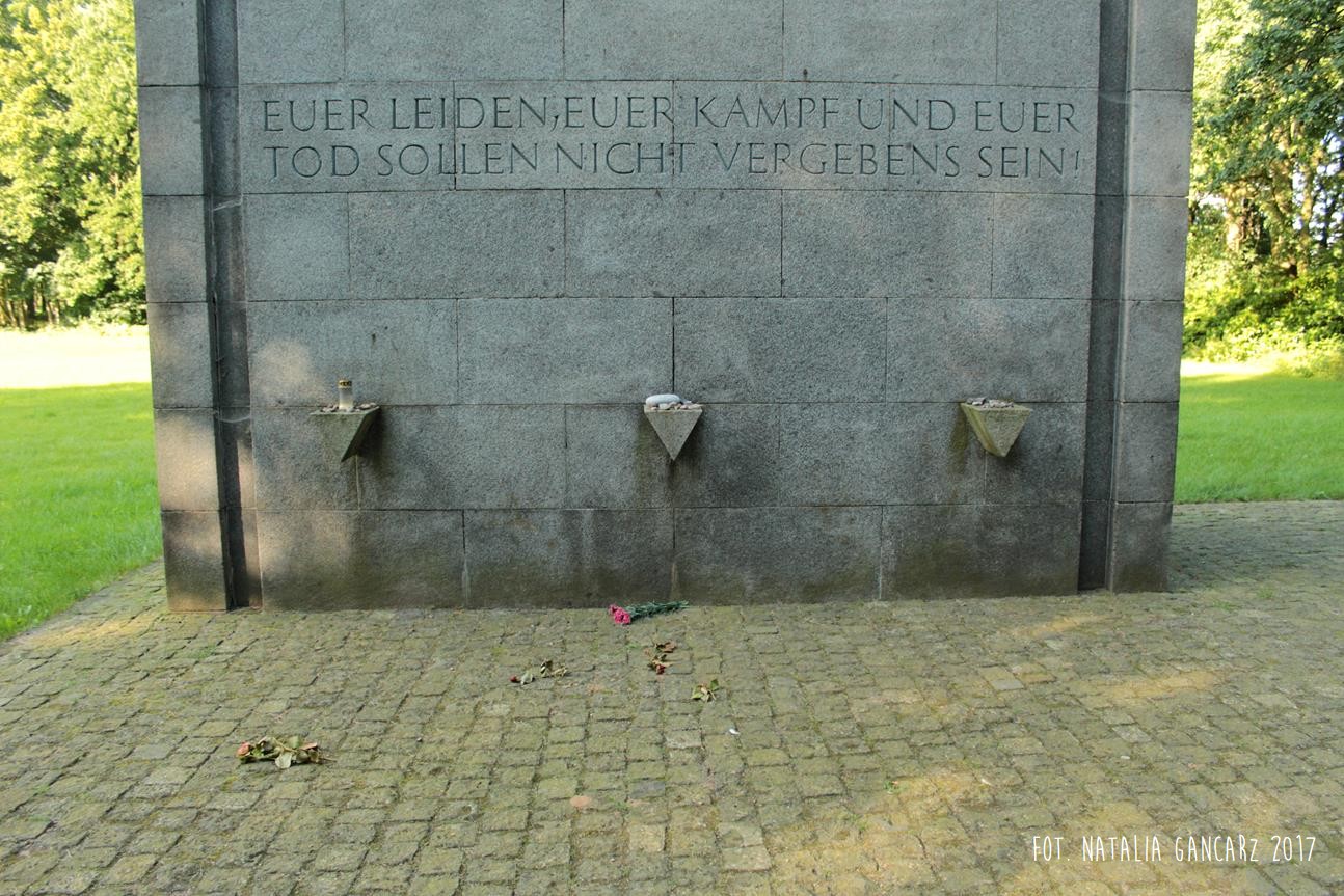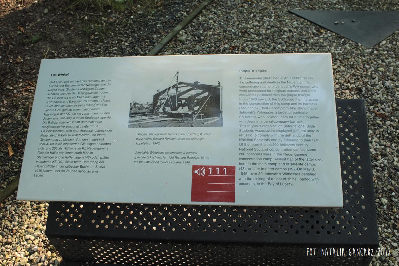 W latach 1938-1945 tutaj, w obozie Neuengamme oraz w jego podobozach, cierpiało 106 000 osób z wielu narodów cierpiało. Pomiędzy nimi było ponad 55 000 mężczyzn, kobiet i dzieci, którzy zostali zamordowani przez narodowych socjalistów. [Tu następują nazwy 67 podobozów].