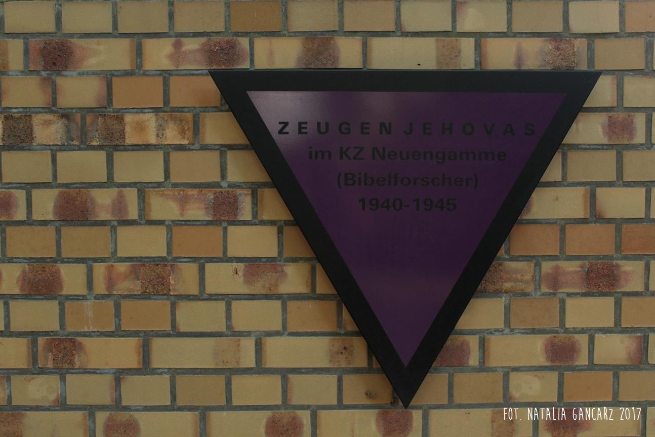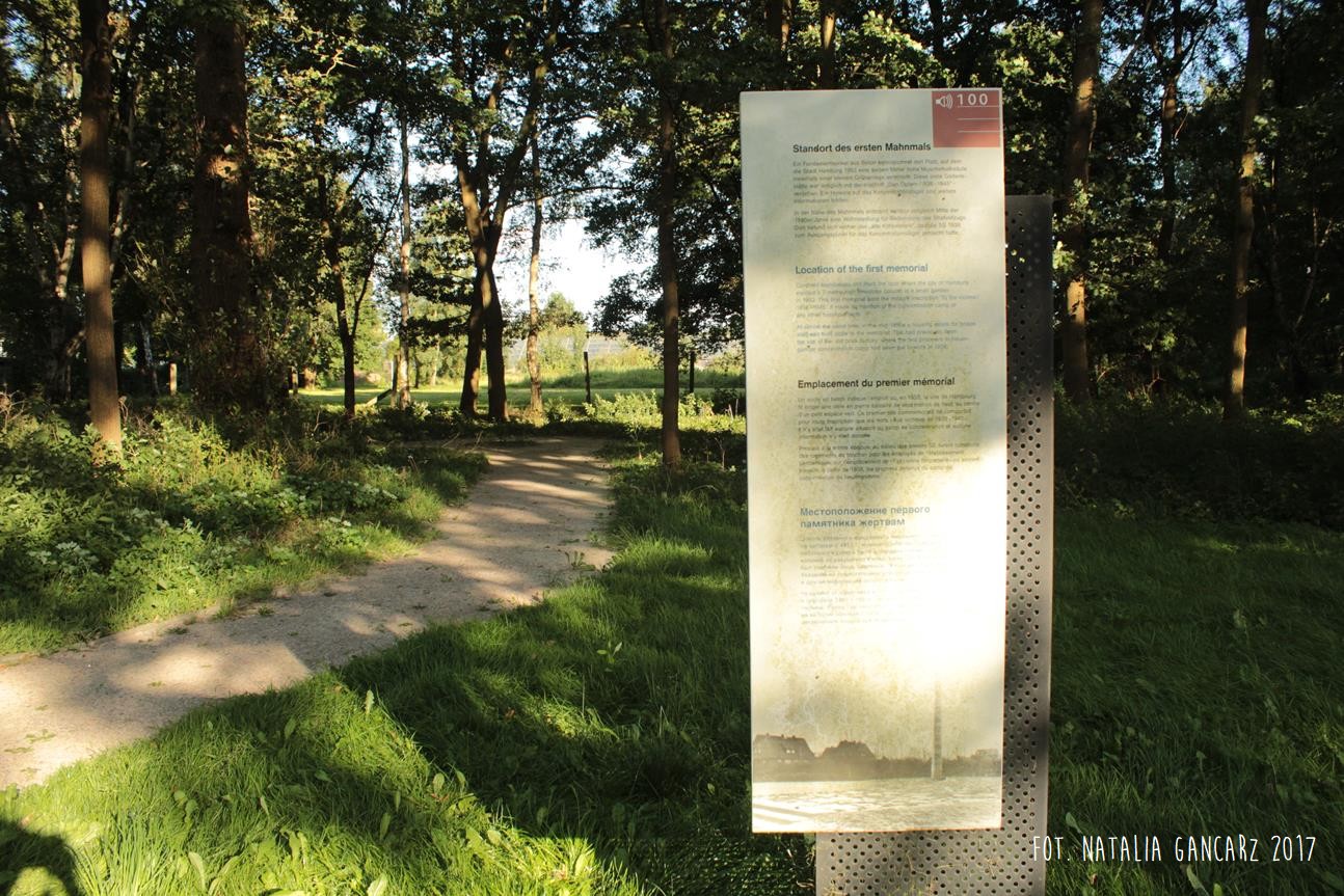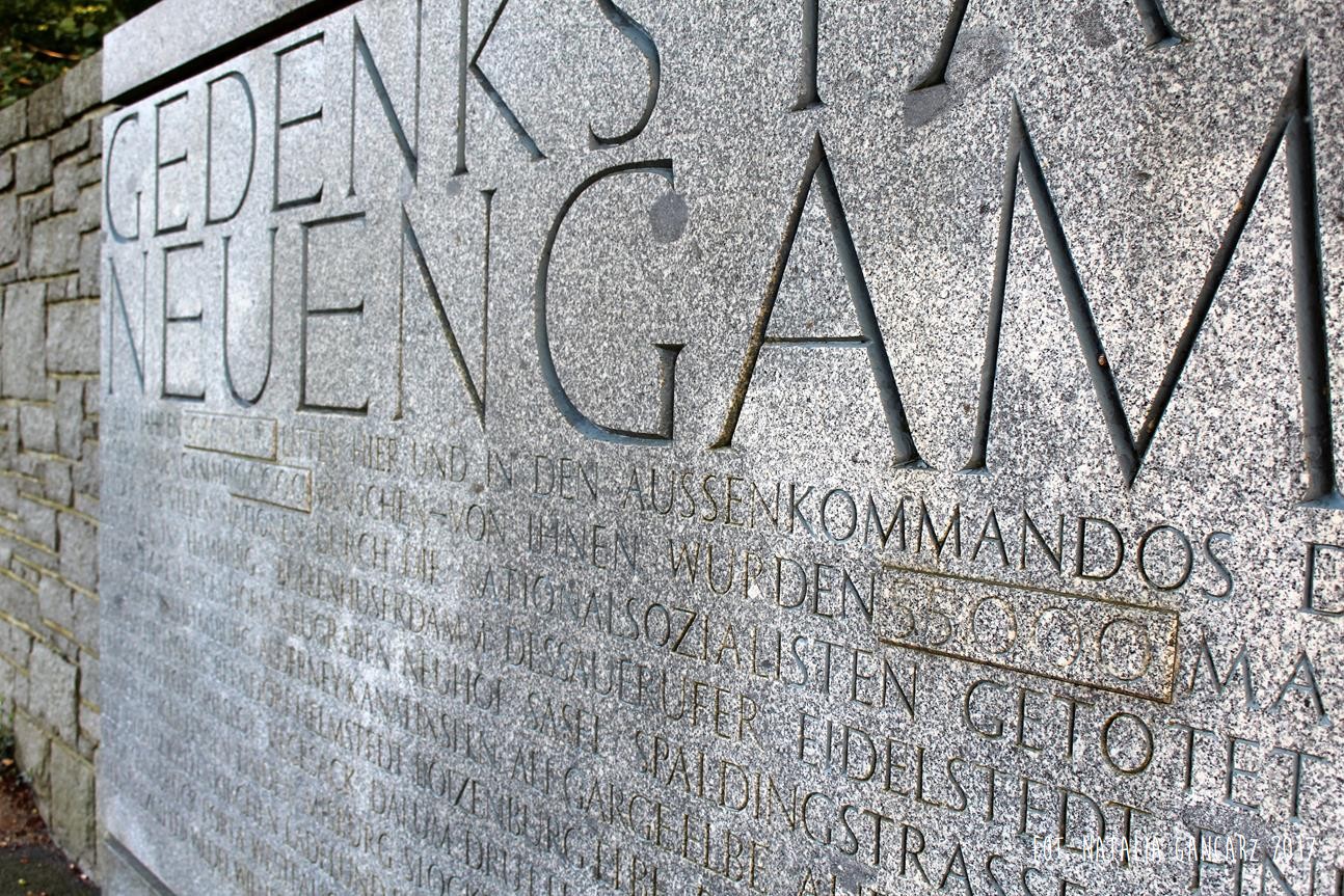 Tuż obok, bezpośrednio na murze, blisko ulicy, umieszczono dużą tablicę z napisem Gedenkstätte Neuengamme (i informacje o obozie).