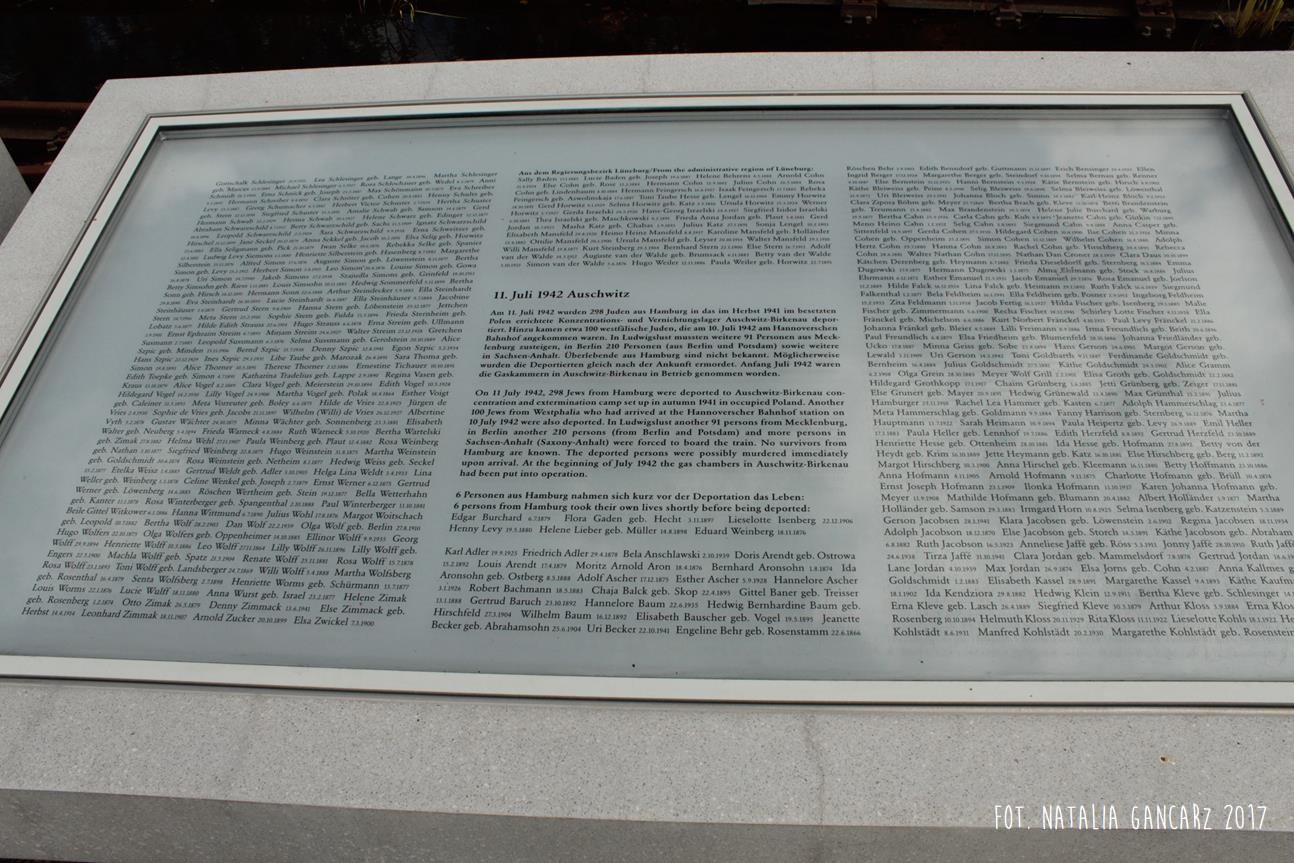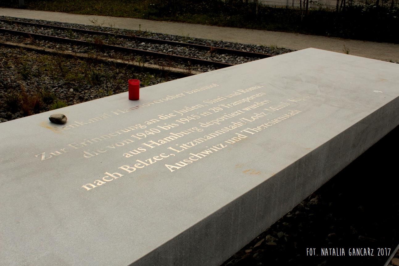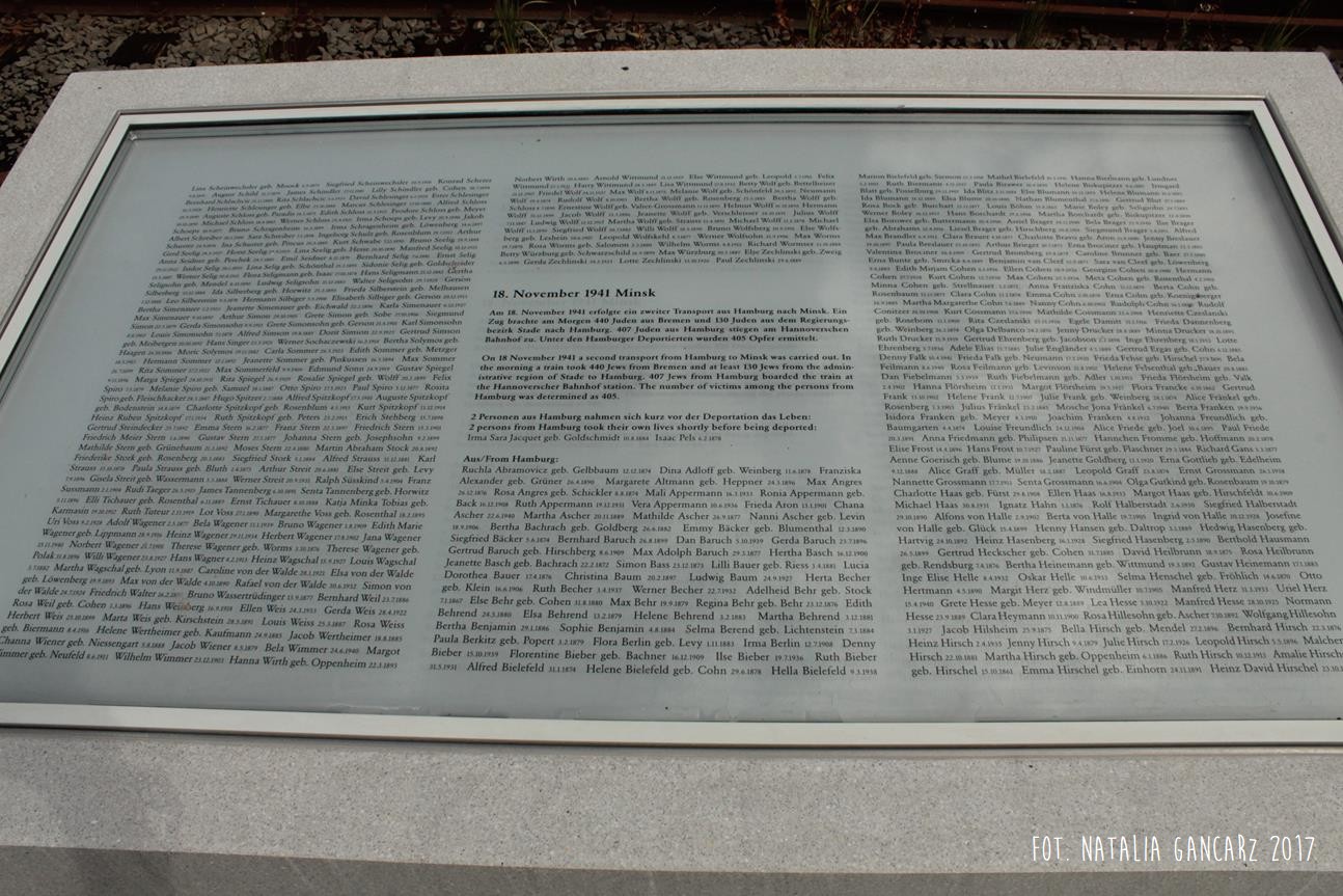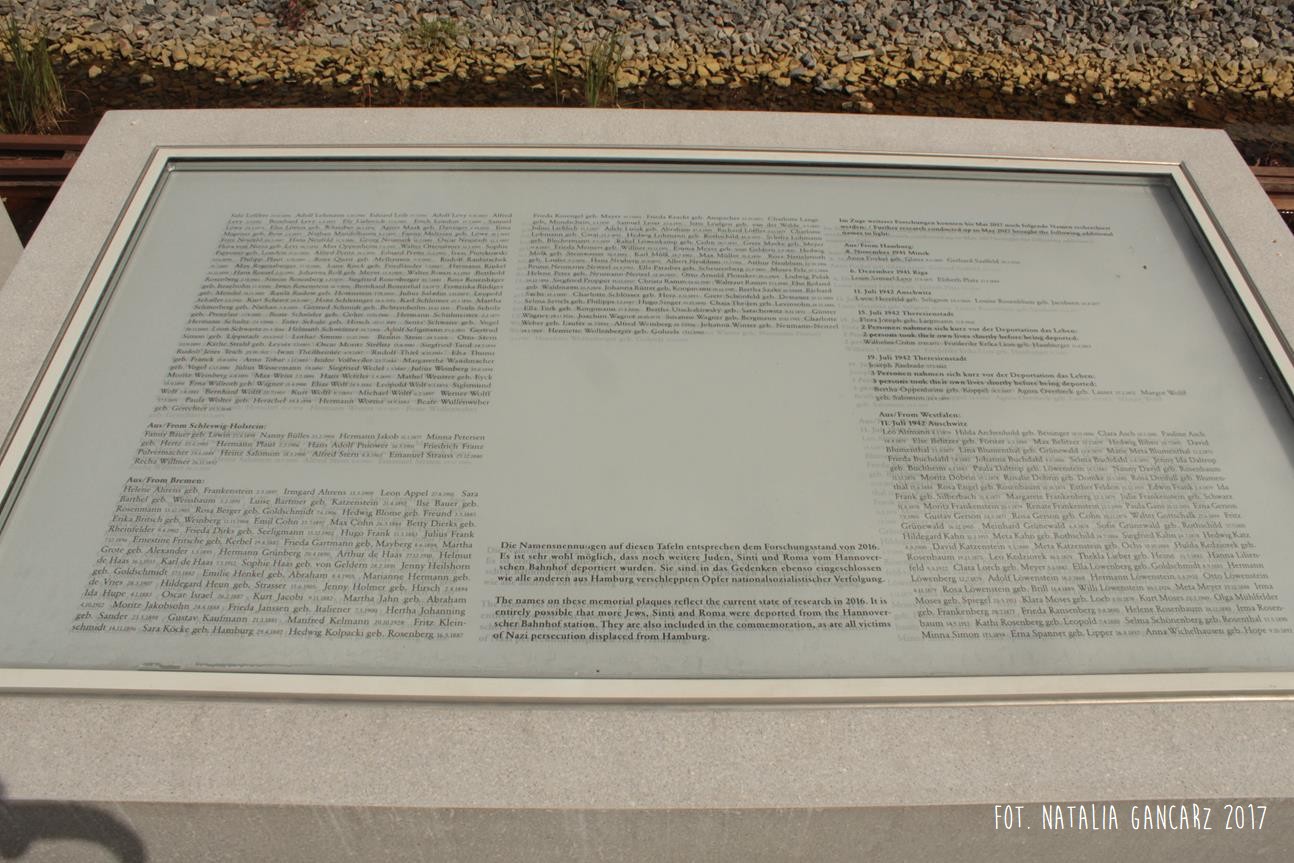 Pomnik Stacji Hannover. Dla upamiętnienia Żydów, Sinti i Romów, którzy w latach 1940-1945, w 20 transportach z Hamburga – zostali wywiezieni do Bełżca, Litzmanstadt/getta w Łodzi, Mińska, Rygi, Auschwitz oraz Teresina.