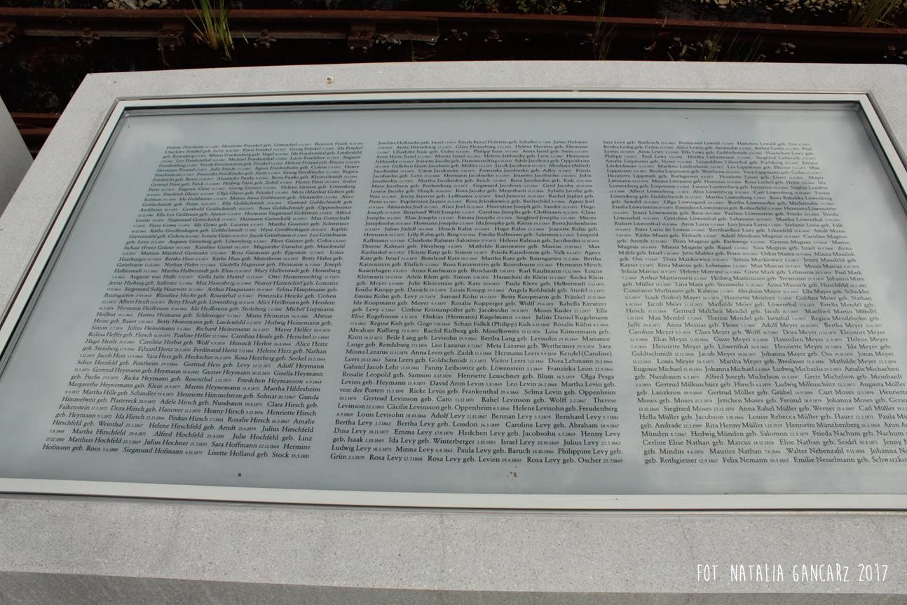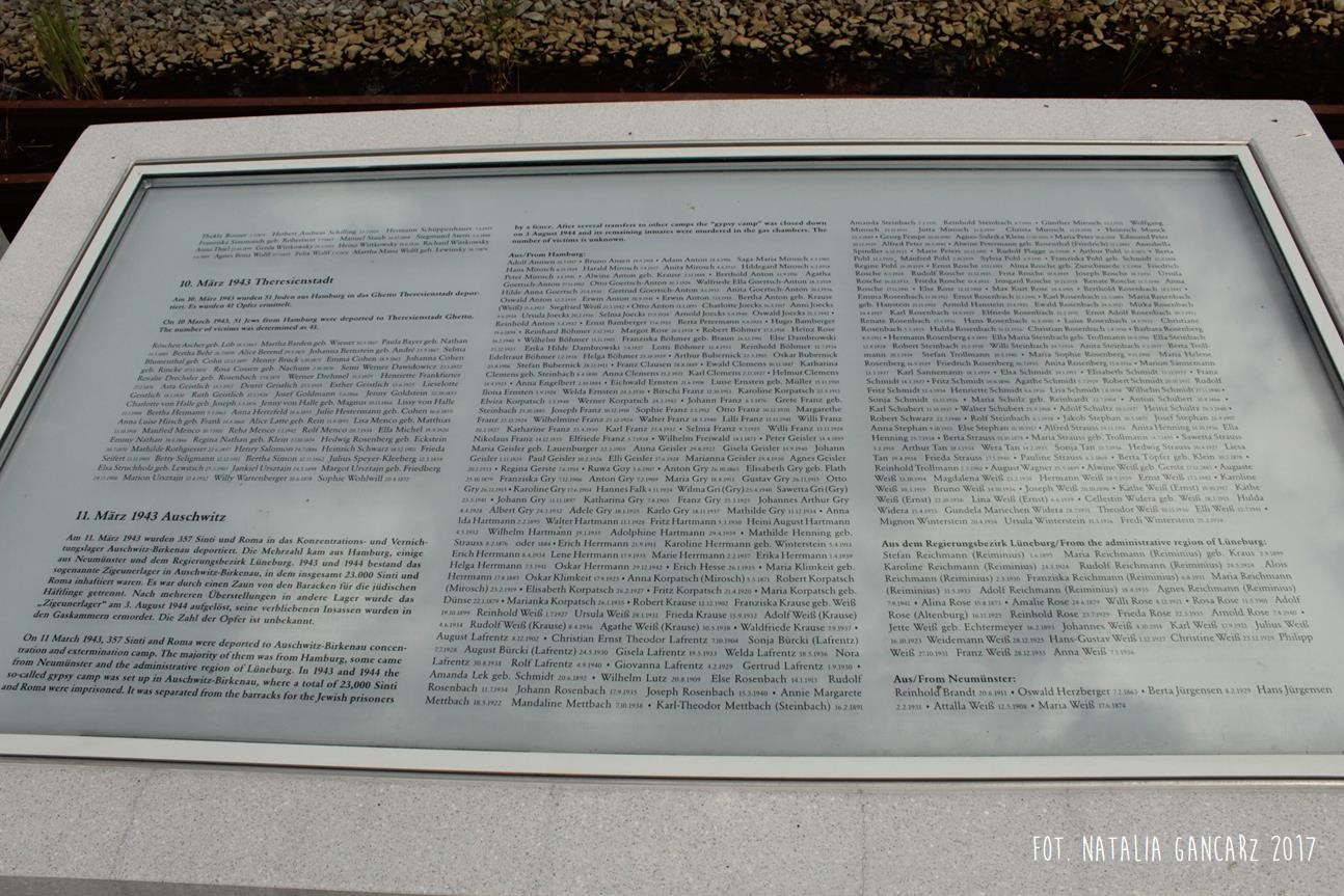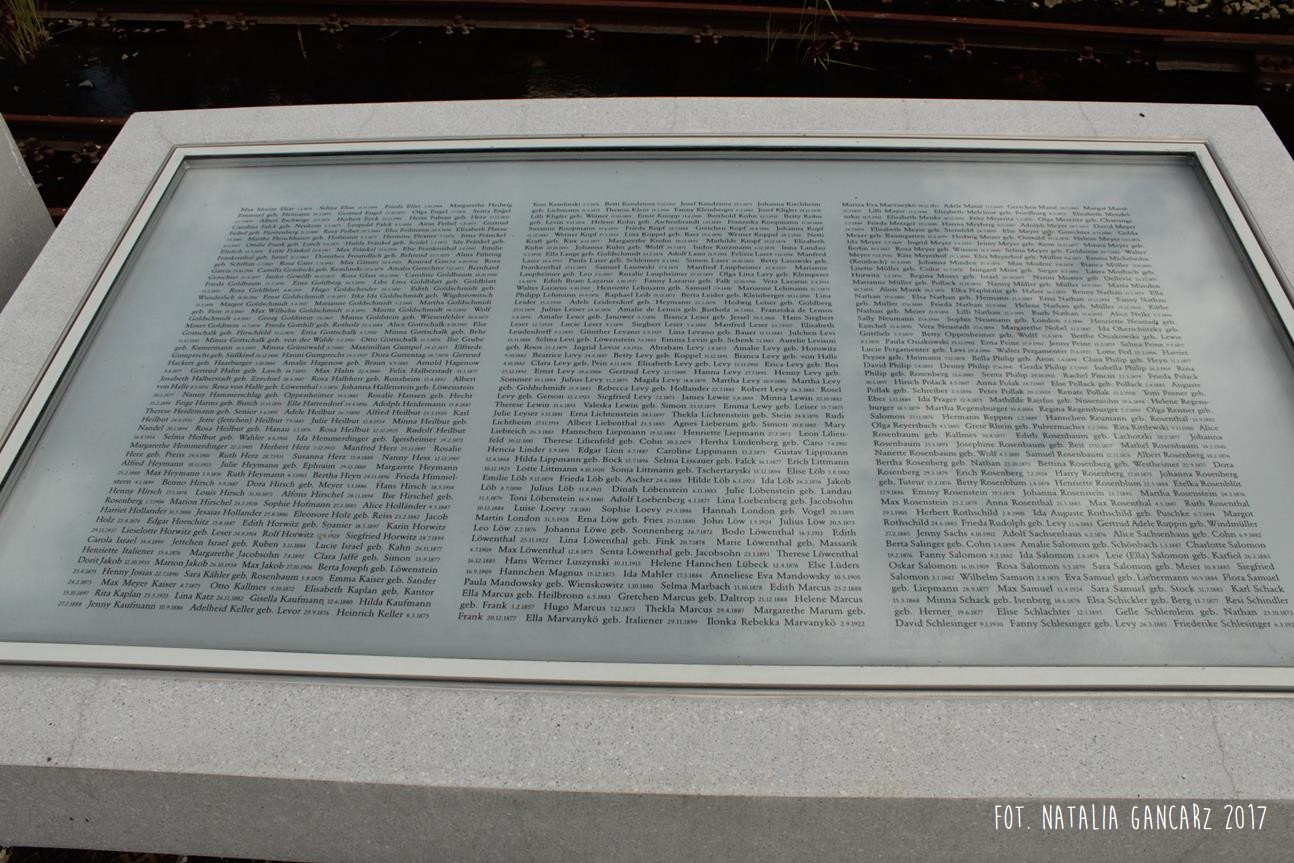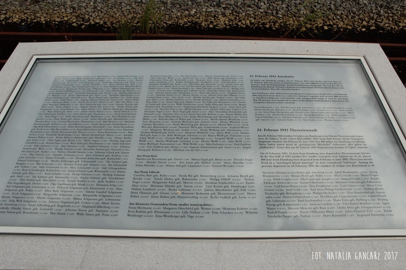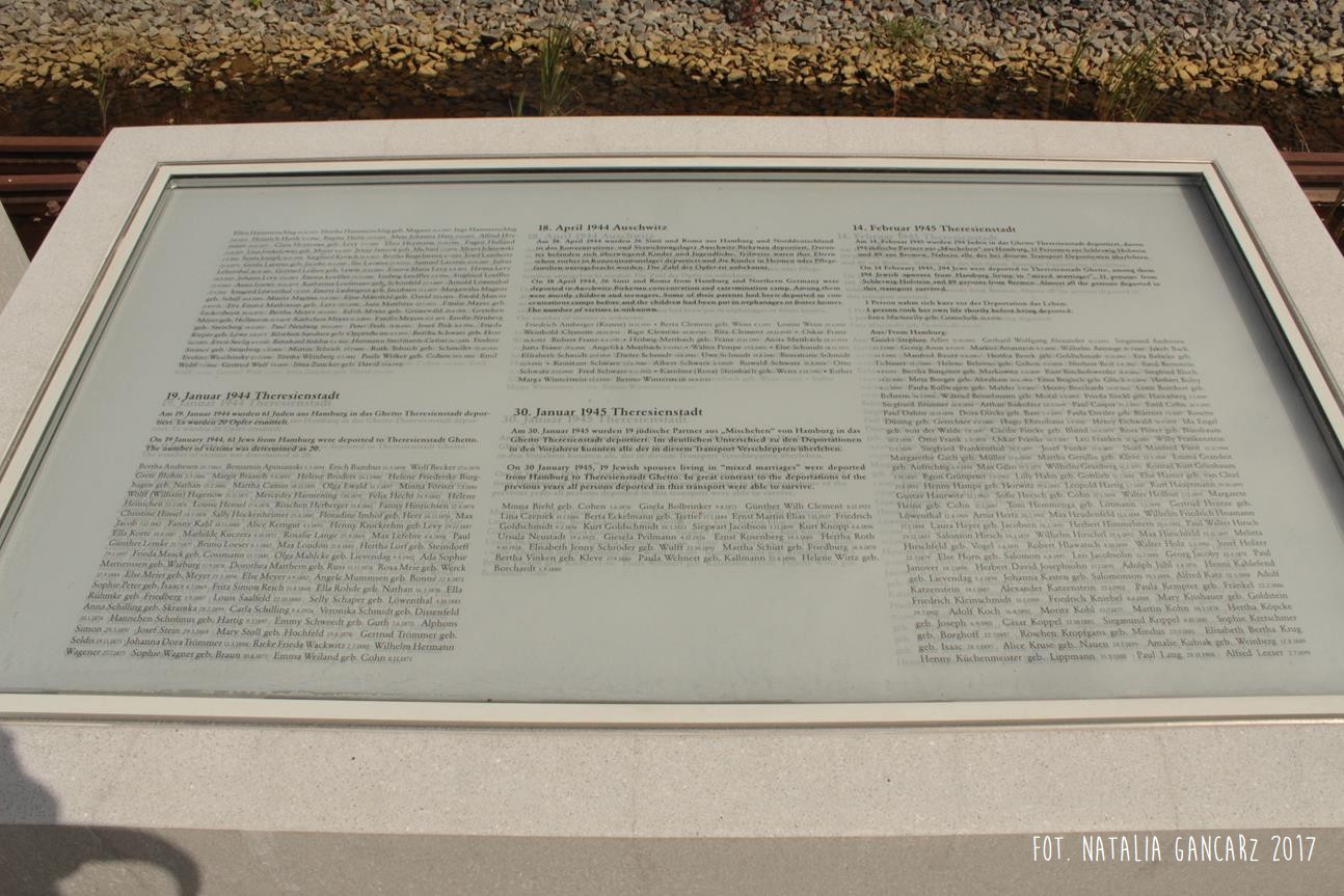 Pomnik Stacji Hannover. Dla upamiętnienia Żydów, Sinti i Romów, którzy w latach 1940-1945, w 20 transportach z Hamburga – zostali wywiezieni do Bełżca, Litzmanstadt/getta w Łodzi, Mińska, Rygi, Auschwitz oraz Teresina.