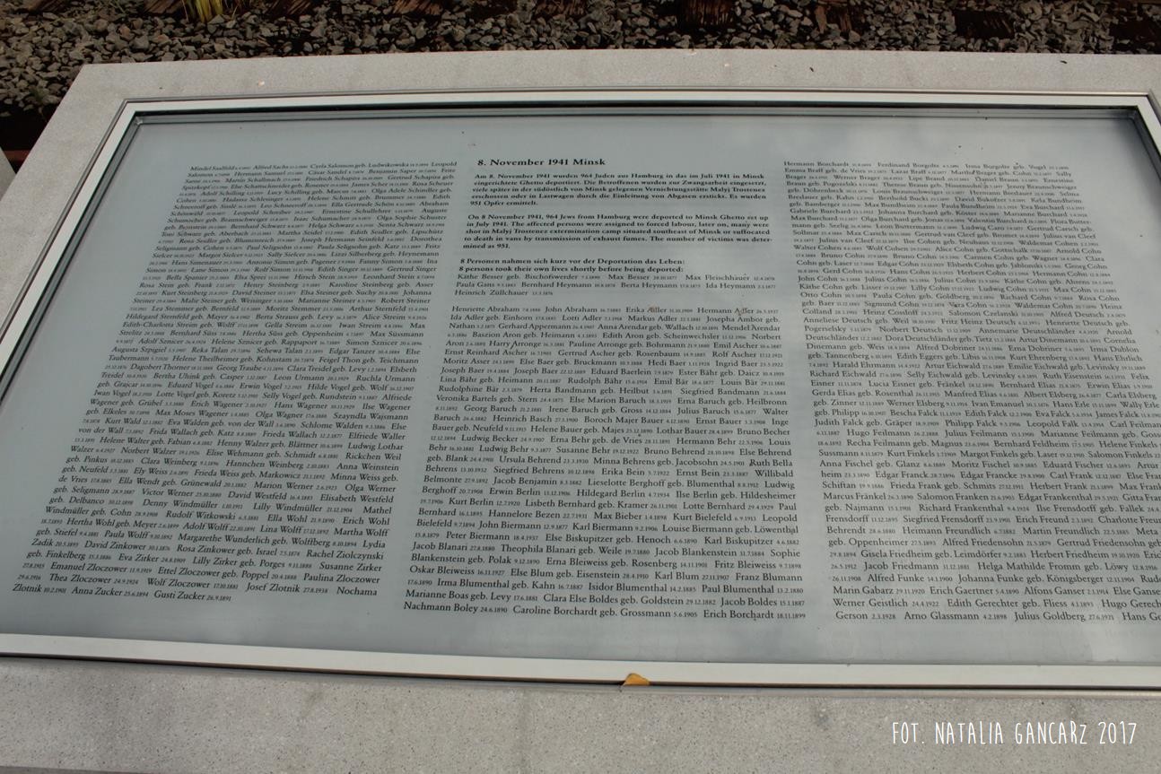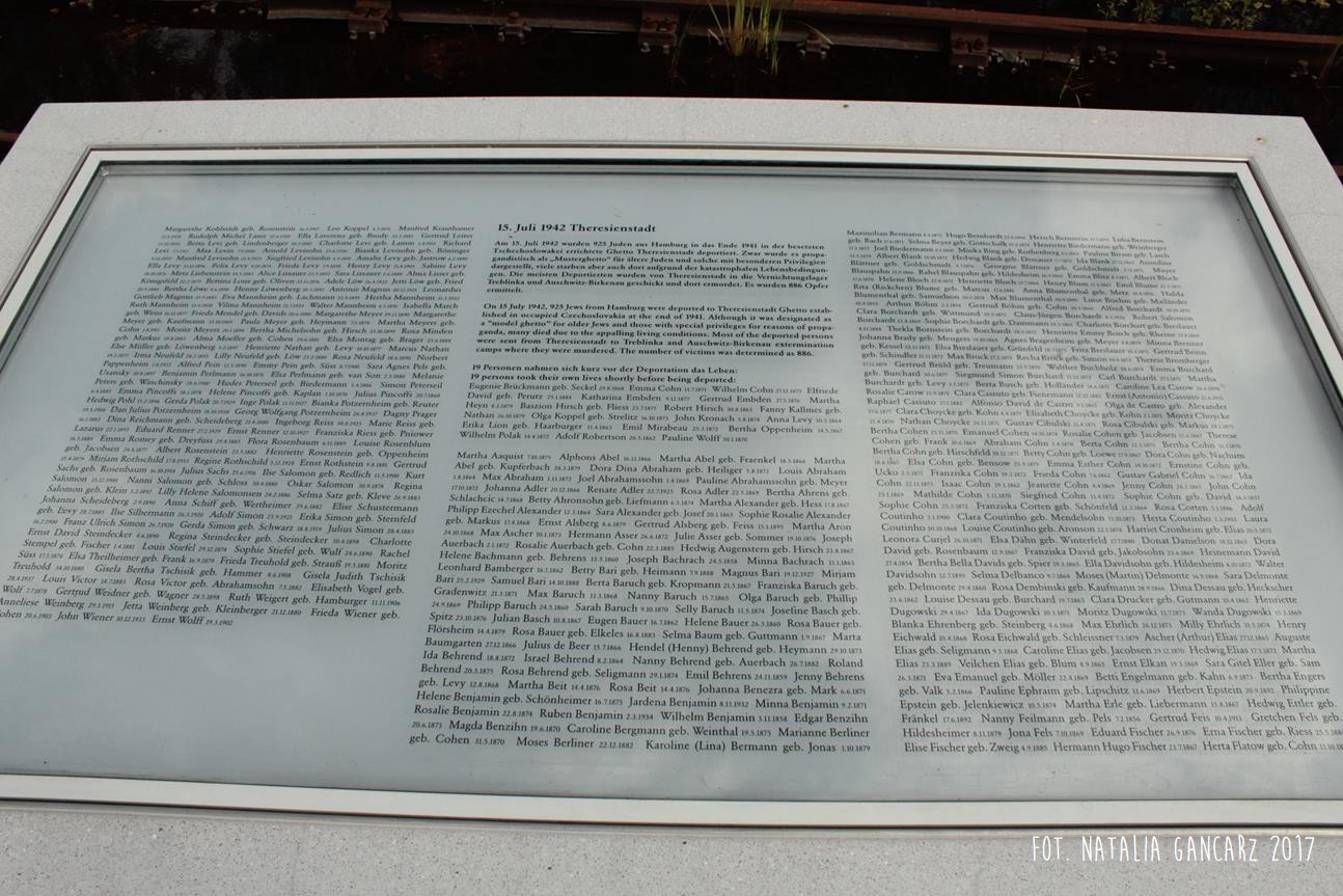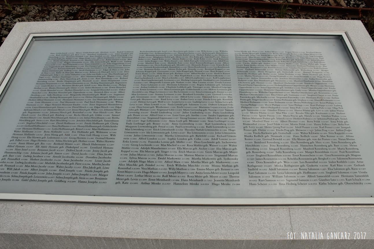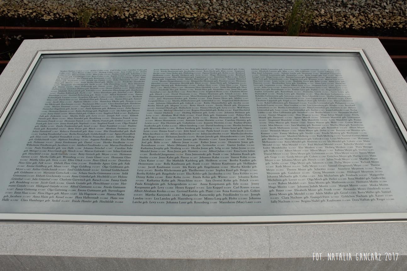 Pomnik Stacji Hannover. Dla upamiętnienia Żydów, Sinti i Romów, którzy w latach 1940-1945, w 20 transportach z Hamburga – zostali wywiezieni do Bełżca, Litzmanstadt/getta w Łodzi, Mińska, Rygi, Auschwitz oraz Teresina.