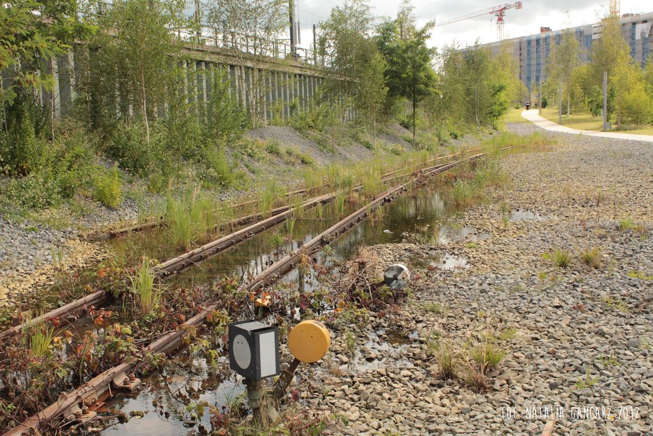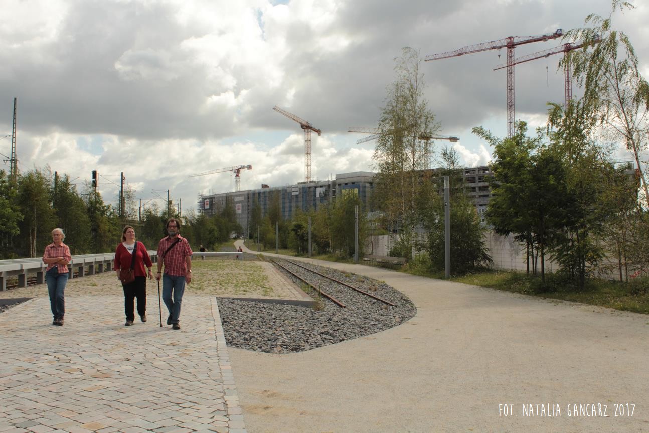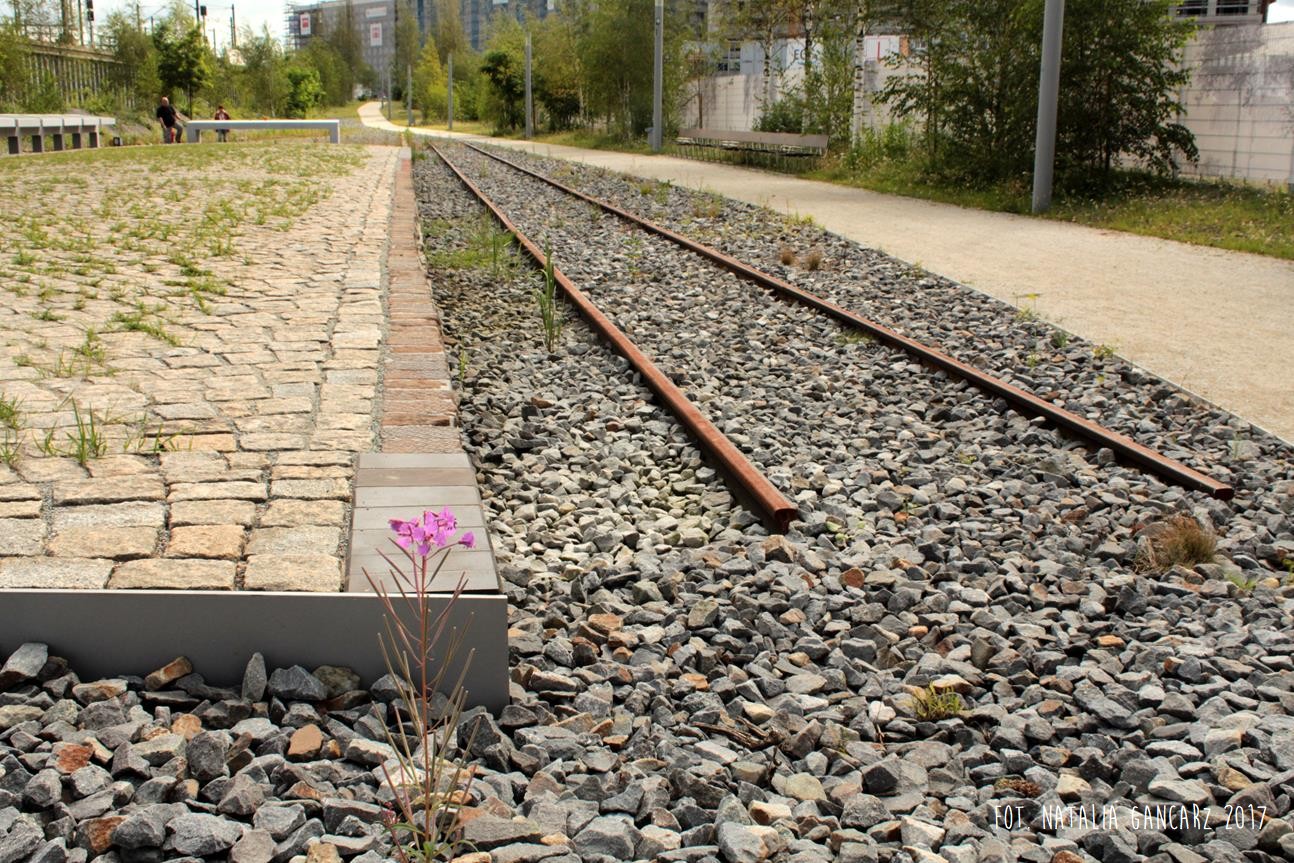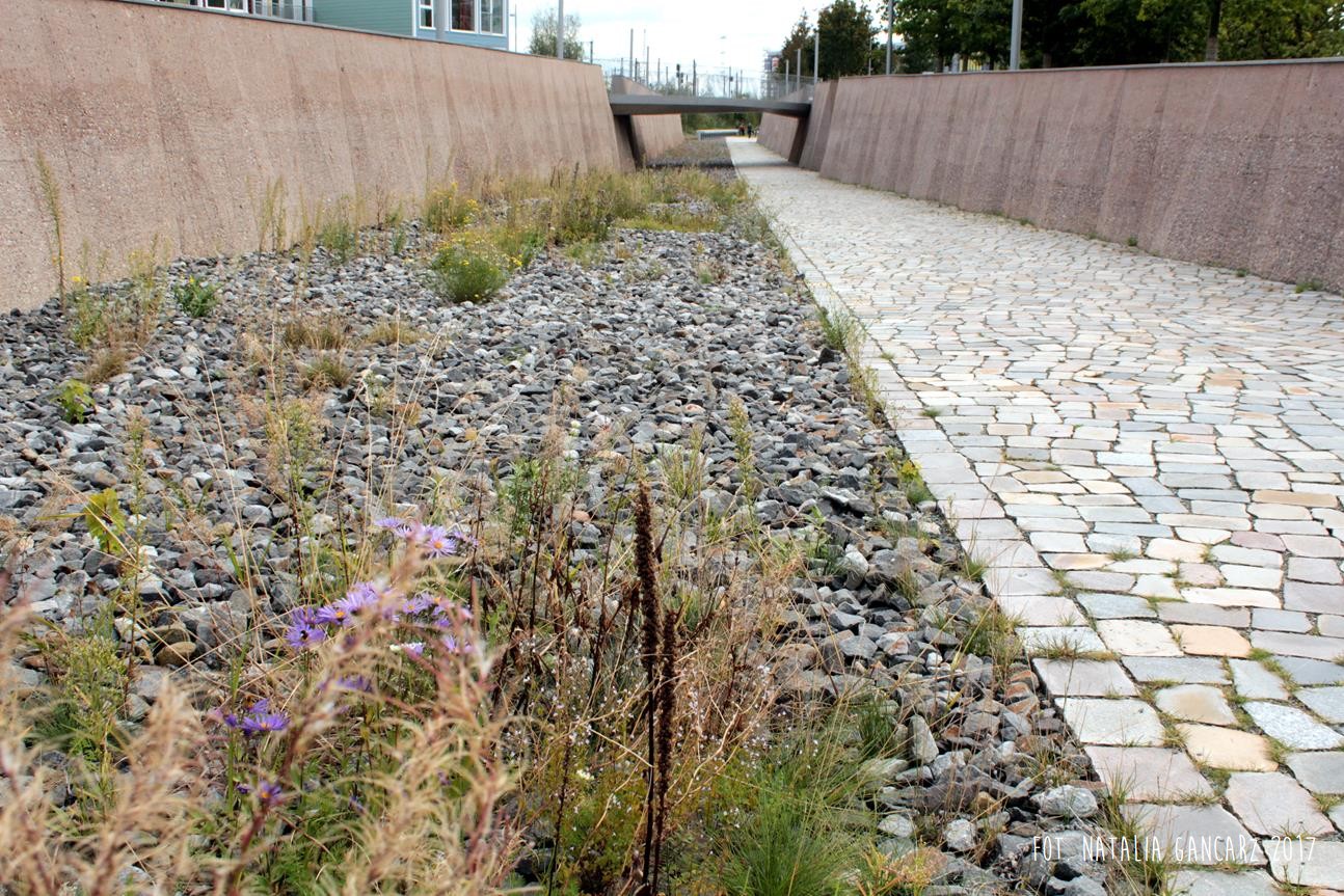 Kierując się spod kontenera z wystawą na Lohseplatz – na południe, w kierunku Baakenhafen Brücke – wybierzmy wąwóz, sztucznie utworzony przez wybudowany po bokach mur. Chodnik, ściany oraz wysypane po lewej stronie białe kamienie sprawiają wrażenie, że znajdujemy się w pobliżu torów, może na jakiejś stacji przeładunkowej. Wrażenie pogłębiają jeszcze kwitnące zioła, wyrastające spomiędzy jasnego tłucznia. Dochodzimy dalej do placu, przypominającego dawny peron: po lewej i prawej znajdują się fragmenty torów, widoczna jest nawet zwrotnica. W centralnym miejscu placu odnajdujemy ogromny betonowy stół przypominający ołtarz, na którym umieszczono napis w jęz. niemieckim (mosiądz wtopiony w beton). Po jego lewej stronie, w betonowych gablotach, za szybami znajdują się nazwiska wszystkich osób deportowanych ze Stacji Hannover w Hamburgu. Transport za transportem.