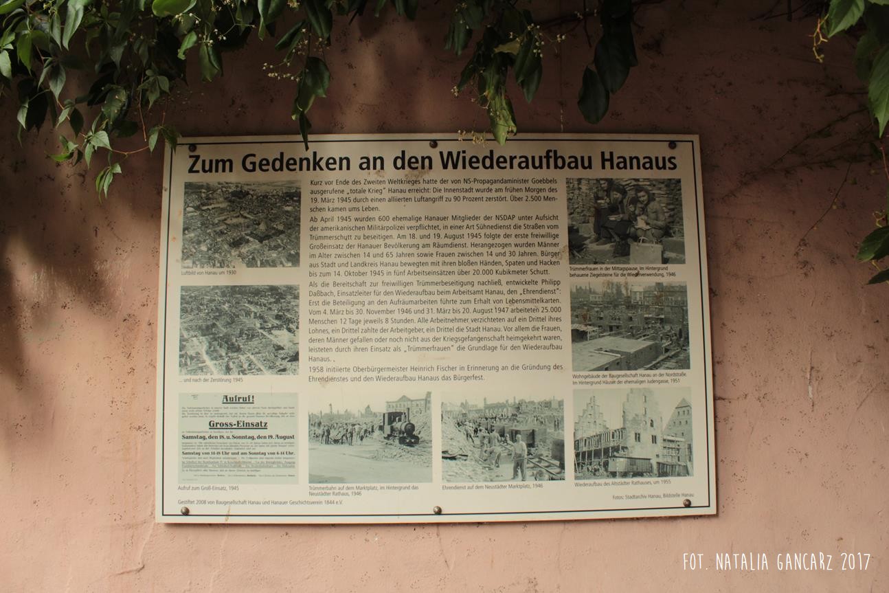Na wschodniej ścianie starego budynku ratusza w Hanau (za pomnikiem Braci Grimm) znajdują się dwie tablice. Jedna z nich to informacja o budowniczych, którzy rekonstruowali zburzone podczas wojny Hanau. Druga – to odlew z brązu, który jest upamiętnieniem Romów i Sinti, deportowanych z Hanau i zamordowanych.