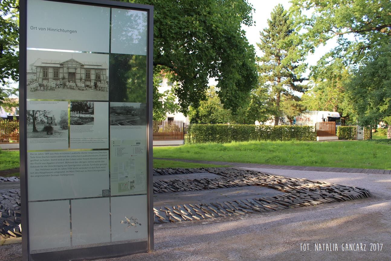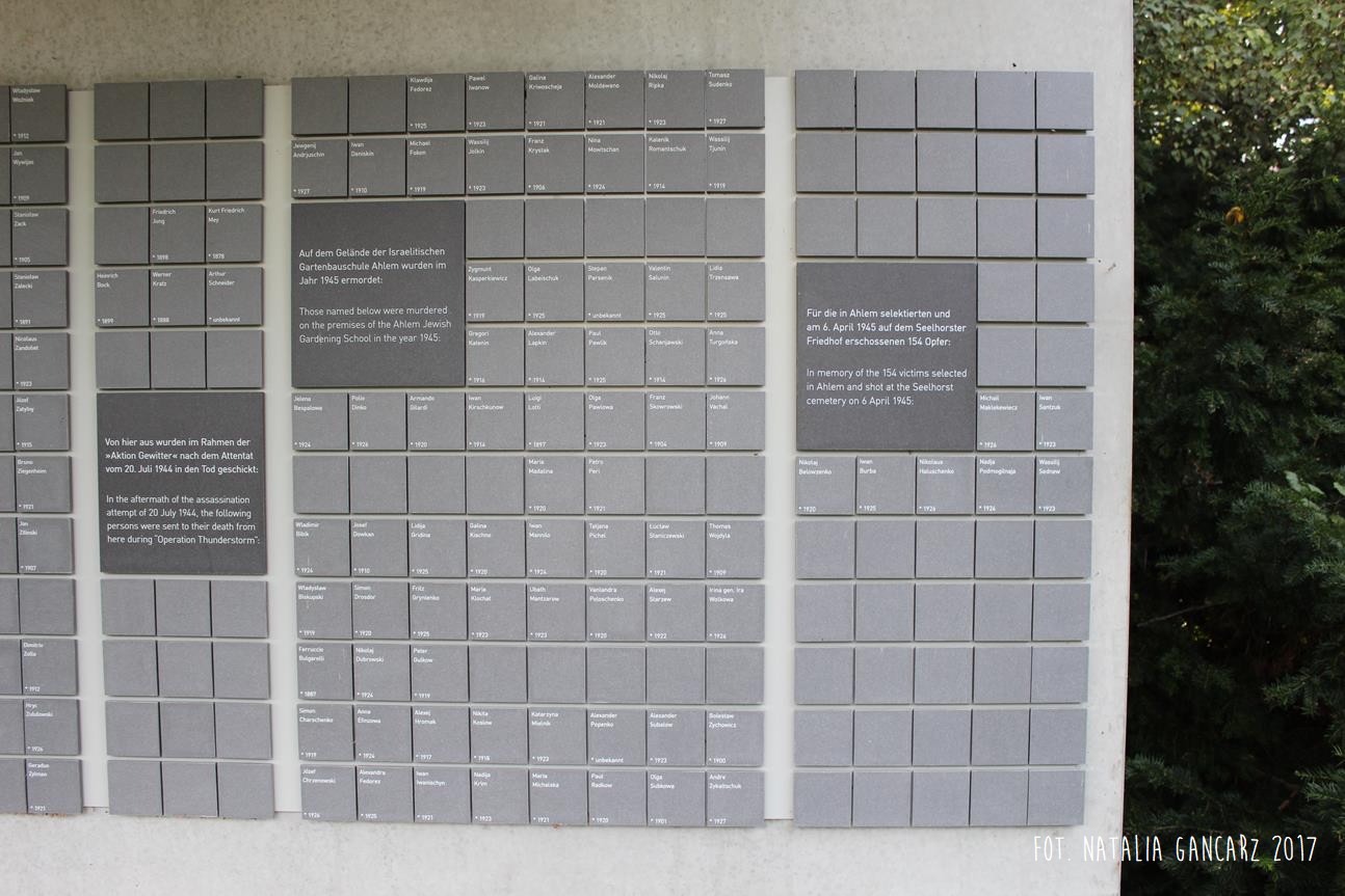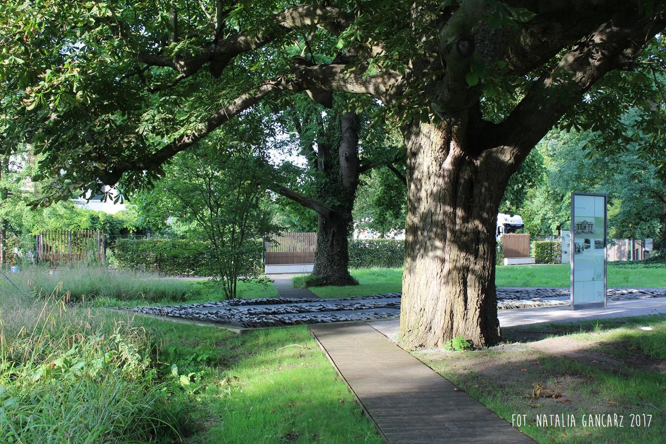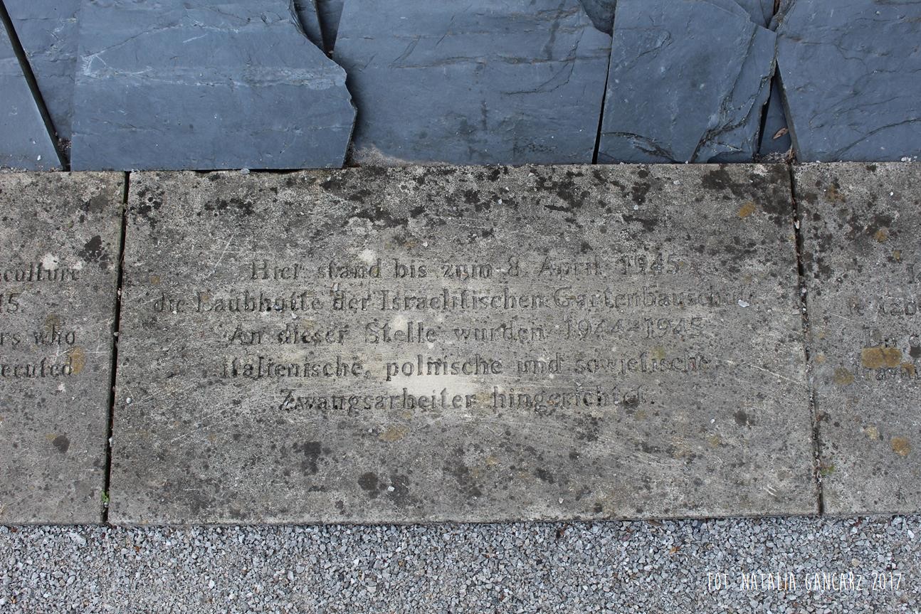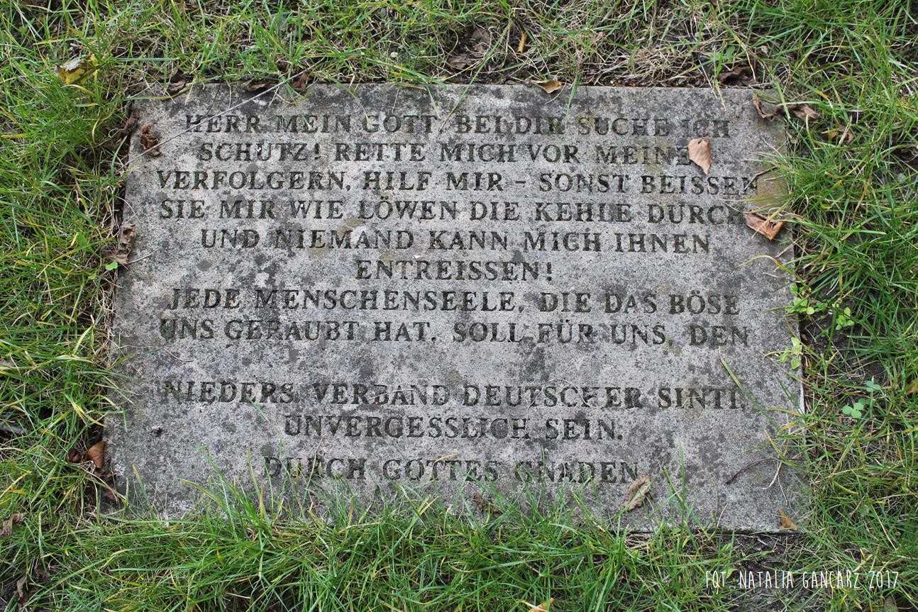 Kierując się od tunelu z nazwiskami ofiar Ahlem do pomnika ofiar włoskich, polskich i radzieckich robotników przymusowych – mniej więcej w połowie drogi, obok wyznaczonej drewnianym torem ścieżki odnajdziemy wkopaną bezpośrednio w ziemię i otoczoną trawnikiem tablicę betonową, z wyrytym napisem pamiątkowym ku czci (Deutscher) Sinti w jęz. niemieckim.