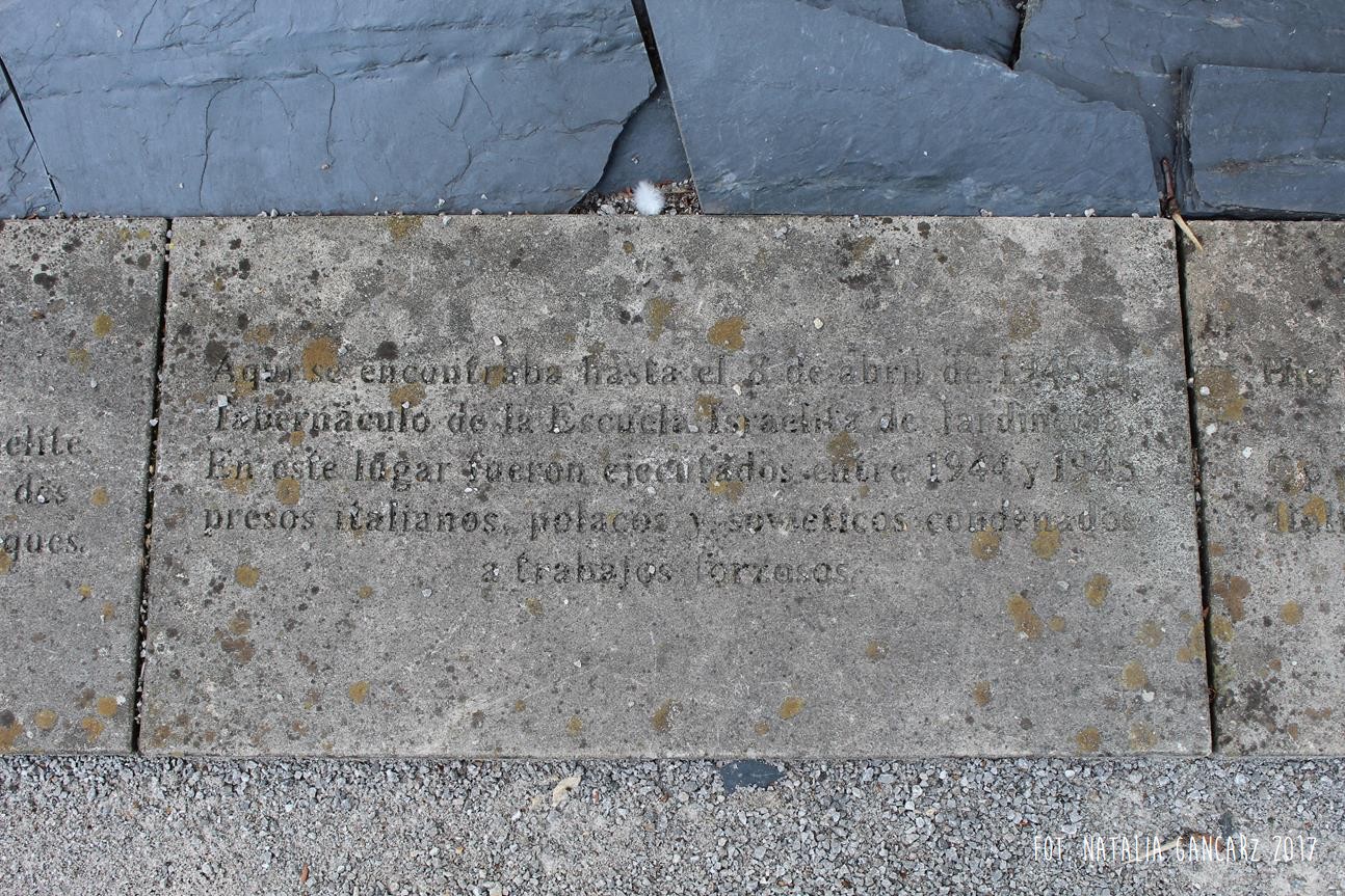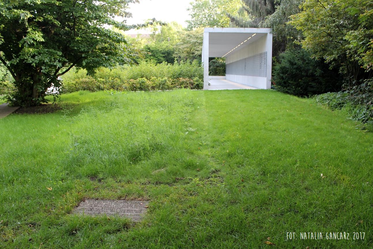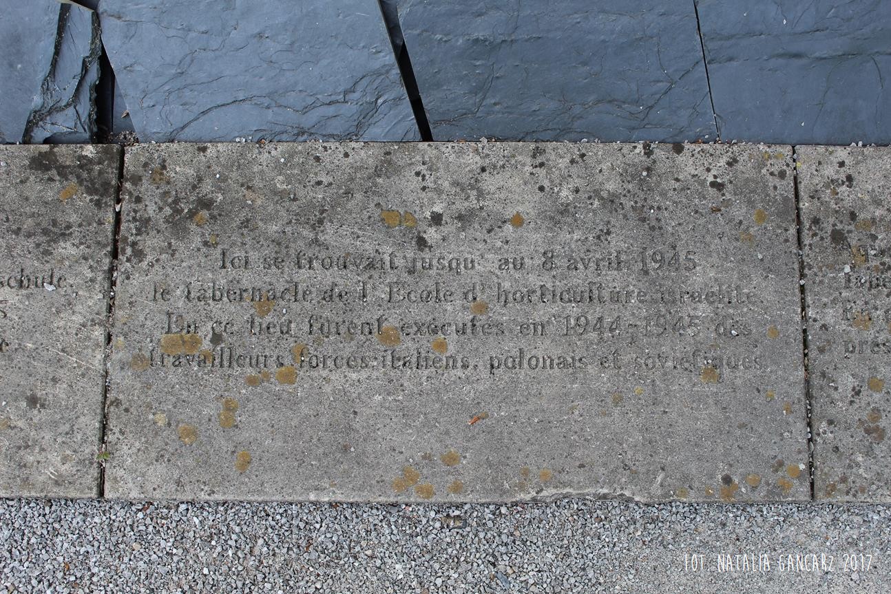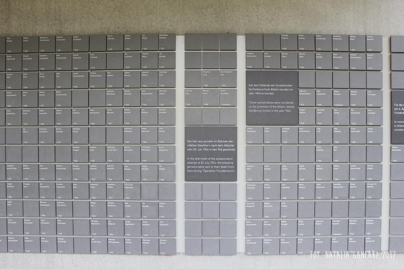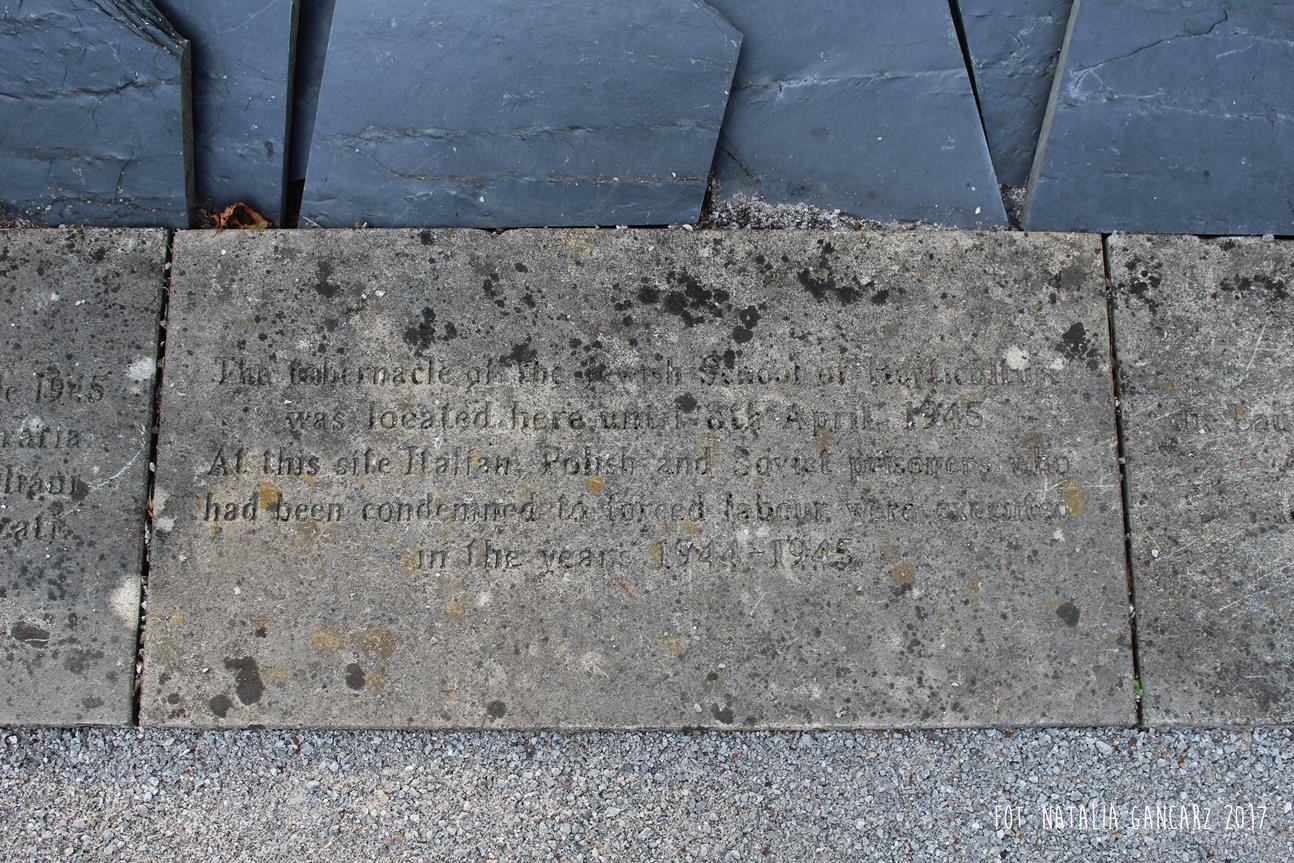 Kierując się od tunelu z nazwiskami ofiar Ahlem do pomnika ofiar włoskich, polskich i radzieckich robotników przymusowych – mniej więcej w połowie drogi, obok wyznaczonej drewnianym torem ścieżki odnajdziemy wkopaną bezpośrednio w ziemię i otoczoną trawnikiem tablicę betonową, z wyrytym napisem pamiątkowym ku czci (Deutscher) Sinti w jęz. niemieckim.