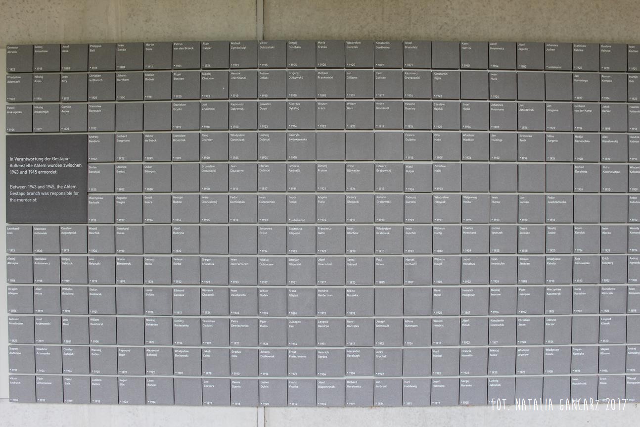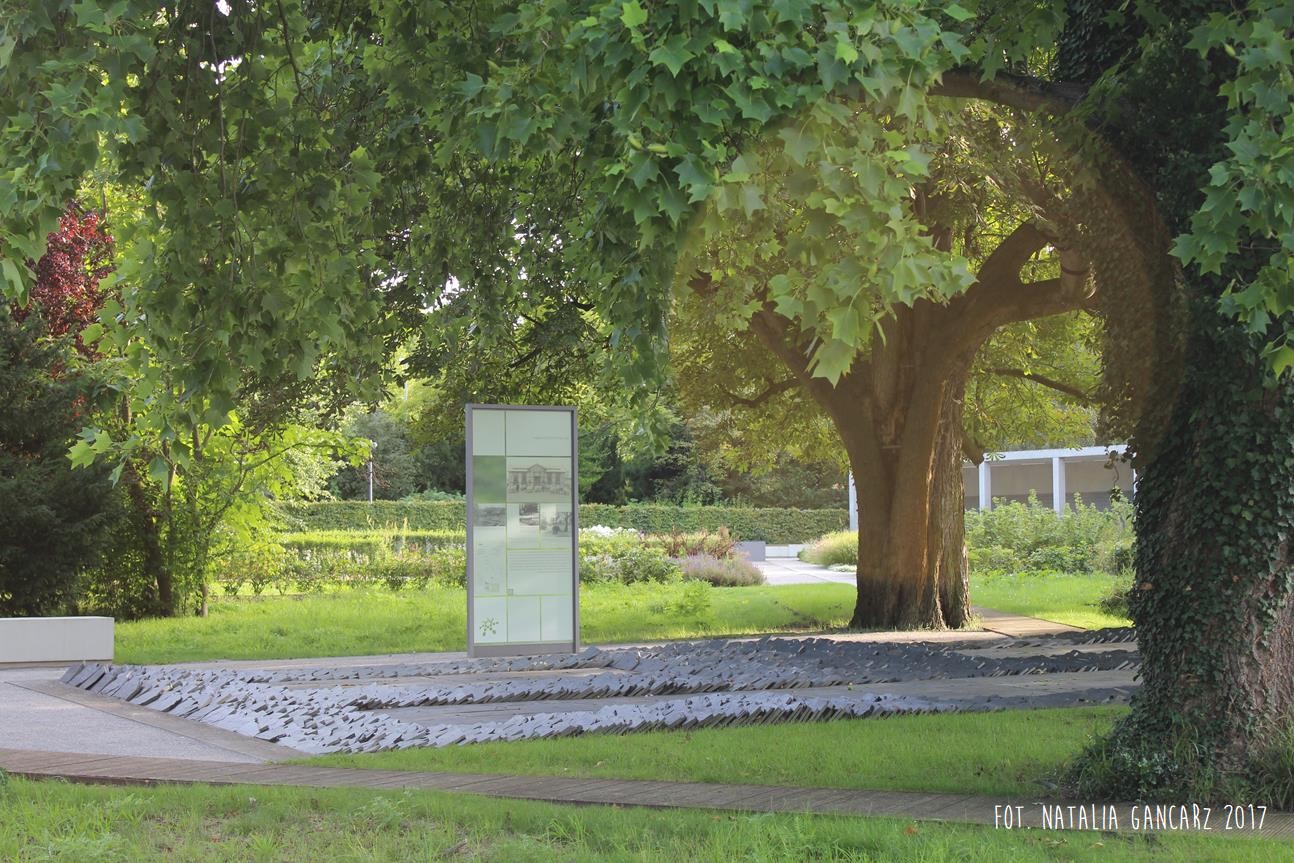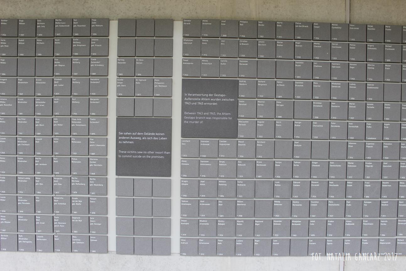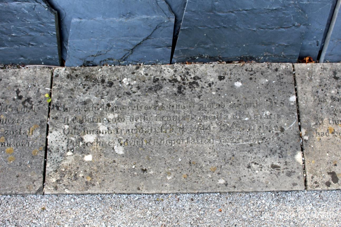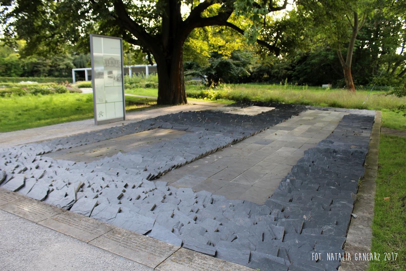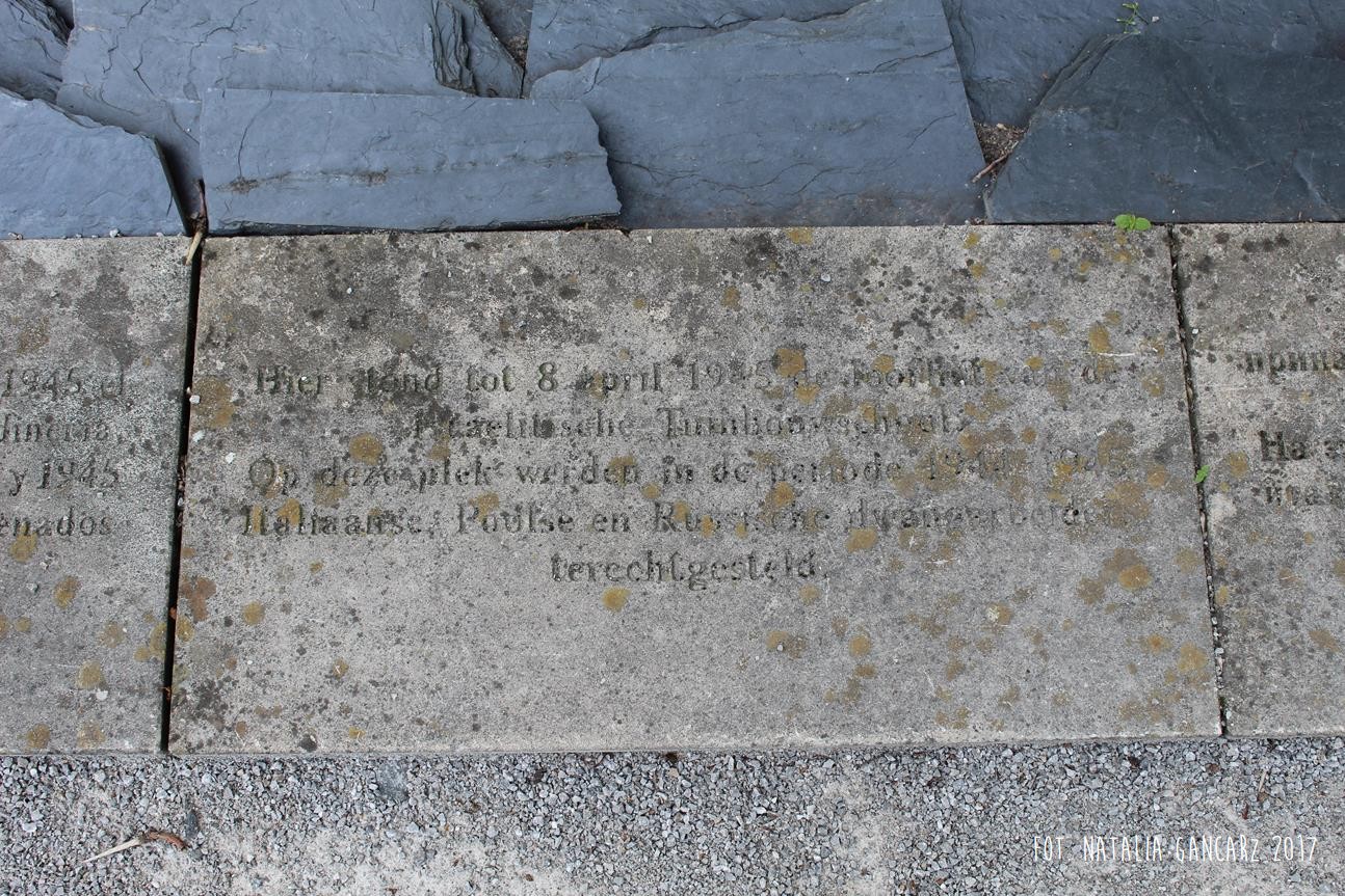 Kierując się od tunelu z nazwiskami ofiar Ahlem do pomnika ofiar włoskich, polskich i radzieckich robotników przymusowych – mniej więcej w połowie drogi, obok wyznaczonej drewnianym torem ścieżki odnajdziemy wkopaną bezpośrednio w ziemię i otoczoną trawnikiem tablicę betonową, z wyrytym napisem pamiątkowym ku czci (Deutscher) Sinti w jęz. niemieckim.