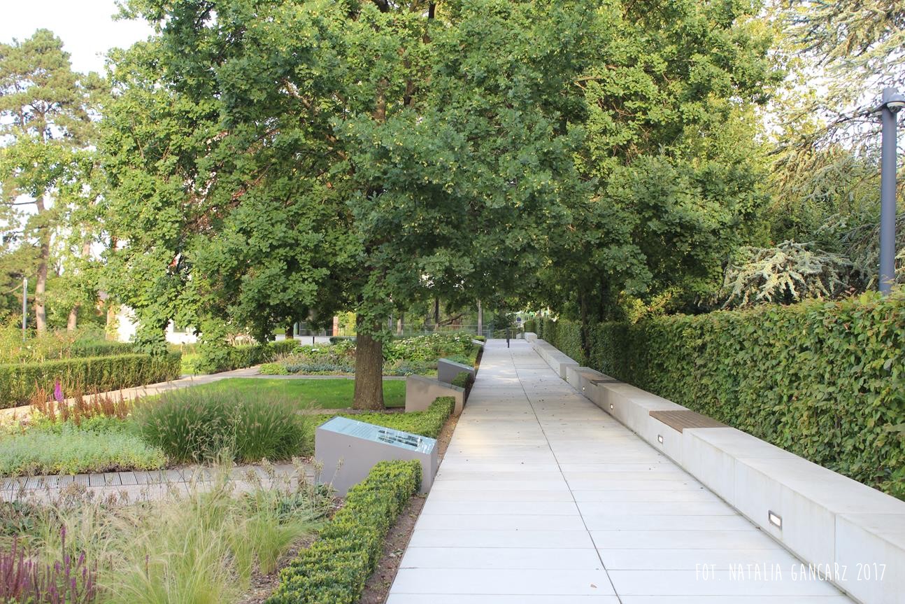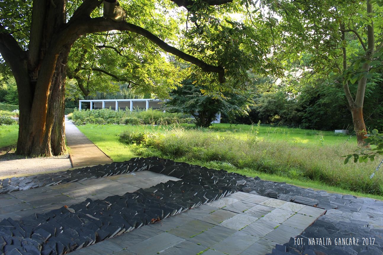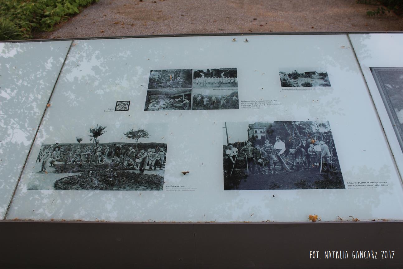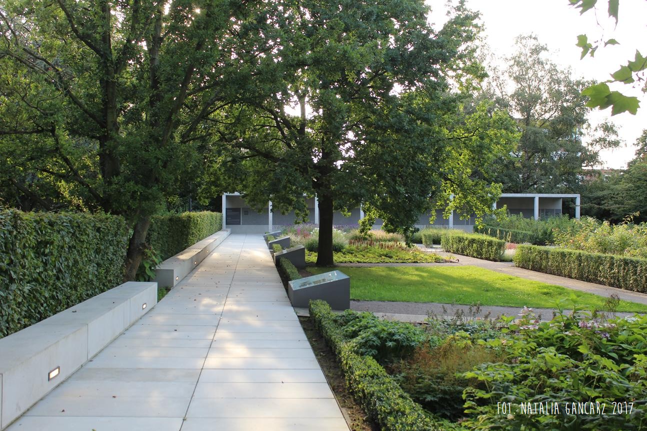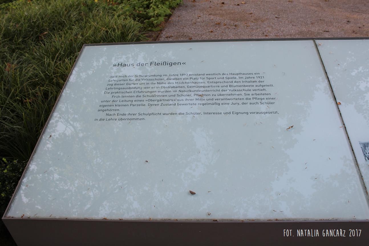 Kierując się od tunelu z nazwiskami ofiar Ahlem do pomnika ofiar włoskich, polskich i radzieckich robotników przymusowych – mniej więcej w połowie drogi, obok wyznaczonej drewnianym torem ścieżki odnajdziemy wkopaną bezpośrednio w ziemię i otoczoną trawnikiem tablicę betonową, z wyrytym napisem pamiątkowym ku czci (Deutscher) Sinti w jęz. niemieckim.