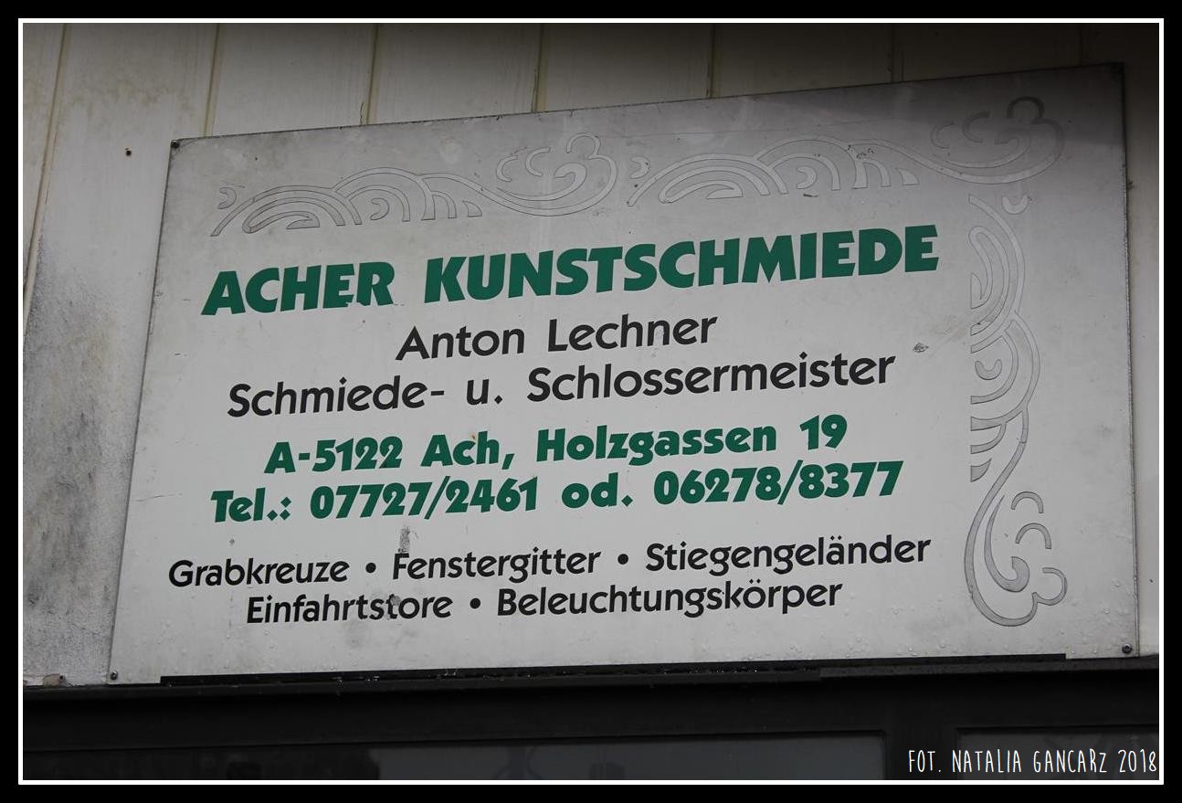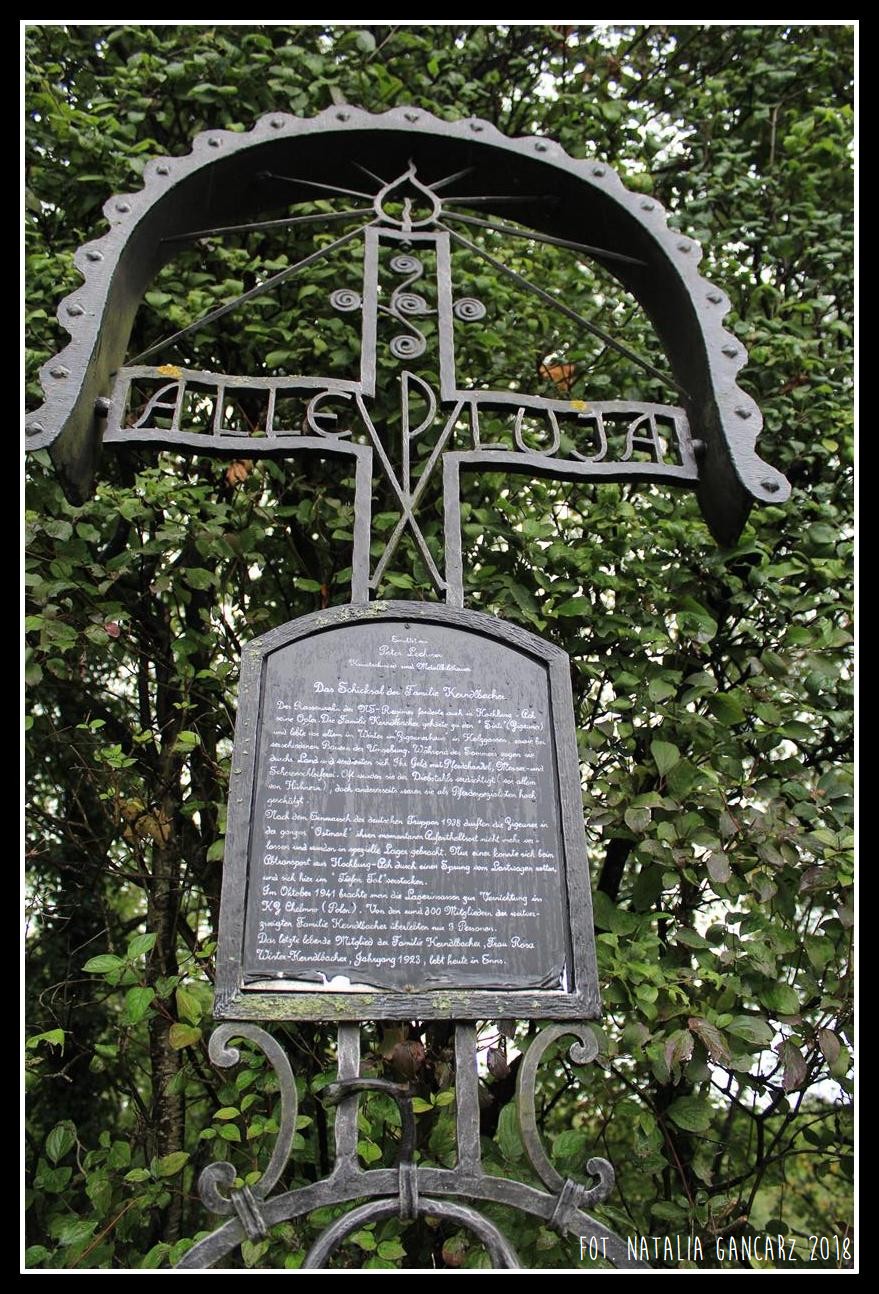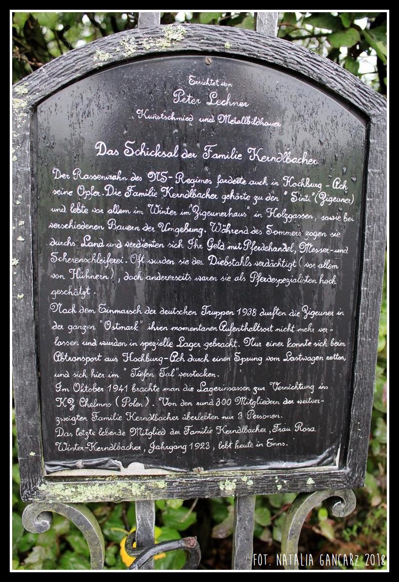 Wykonał Peter Lechner / kowal artystyczny i rzeźbiarz w metalu. // Losy Rodziny Kerndlbacher // Tragiczna polityka rasowa narodowego socjalizmu z jej podziałem na „Aryjczyków” i przedstawicieli „gorszych” ras, takich jak Europejczycy Wschodni, Cyganie, Żydzi i in., uczynił ofiarami także mieszkańców Gminy Hochburg-Ach.
