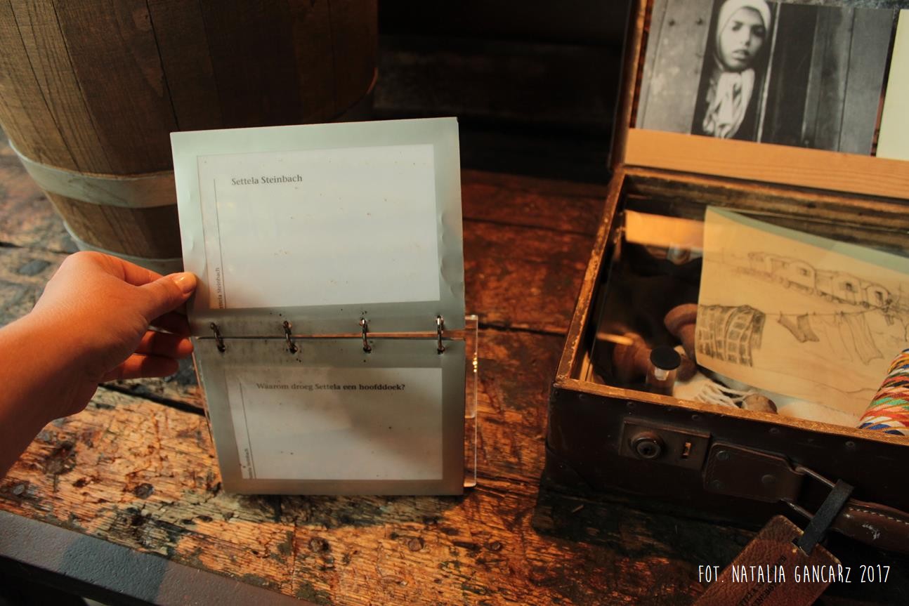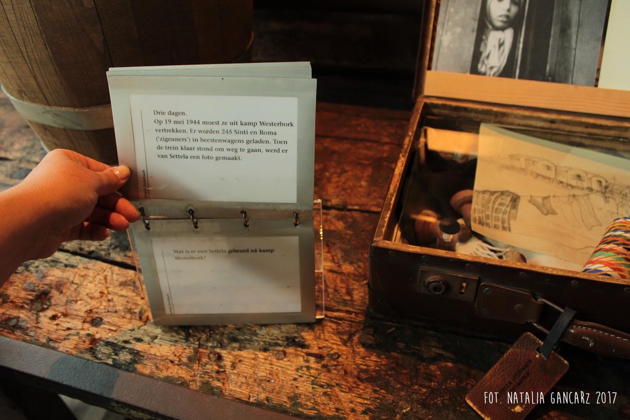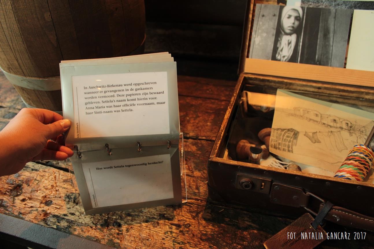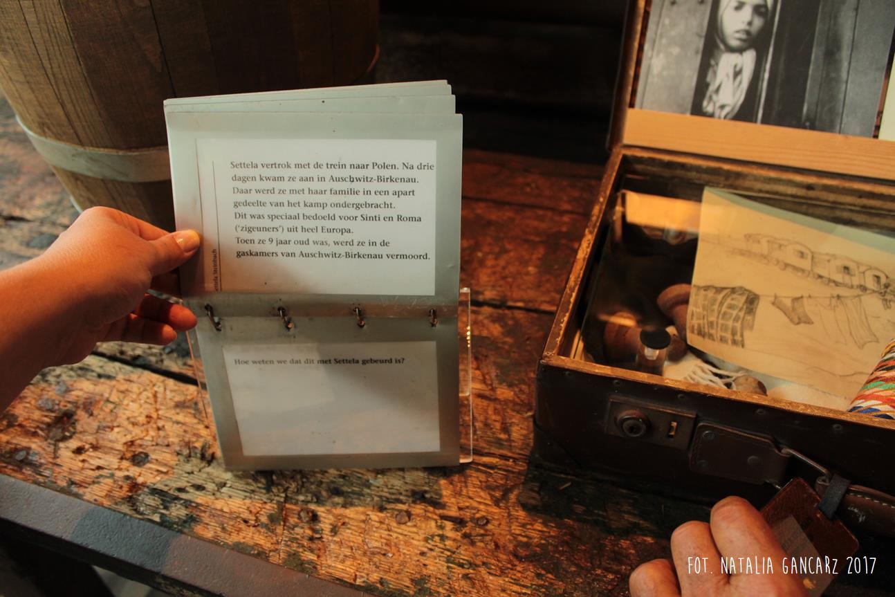 Dziewczynkę rozpoznano z jednego ujęcia w filmie dokumentującym deportację, podczas której obok Żydów część transportu zajmowali Romowie (375 osób). Odszukano listę deportacyjną z jej nazwiskiem oraz pismo, który prawdopodobnie informuje o przerzuceniu Cyganów do obozu Westerbork 16 maja 1944 r. w celu dalszej deportacji. To zdecydowanie mało, aby przedstawić sylwetkę człowieka posiadając tylko jego jedno zdjęcie, jednak projektant, wykorzystując nienarzucającą się odbiorcy symbolikę cygańską (rysunek ołówkiem cygańskiego obozowiska), jasna chustę (podobną do tej, którą uwieczniona na fotografii dziewczynka miała na głowie), kolorowy fragment ubrania, ozdobione kolorowymi sznurkami pudełko, zabawkę (Settela miała 9 lat) i – walizkę jako symbol deportacji powiedział więcej niż gdyby rozpisano cały jej życiorys. Ta jedna fotografia Setteli w części wystawy, która jest jej poświęcona – pojawia się czterokrotnie! Jedno ujęcie w różnych kadrach i funkcjach – jako okładka historii Setteli dla dzieci, jako zakładka na wieku walizki, pośród innych dokumentów (fikcyjnych, wszak po Setteli nie zostało prawie nic), wreszcie jako zdjęcie oprawione w ramkę i spakowane do walizki – takie, które zabiera się z szafki nocnej na pamiątkę.