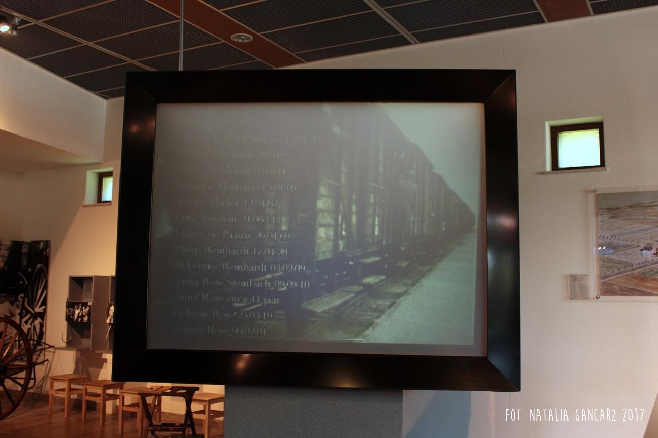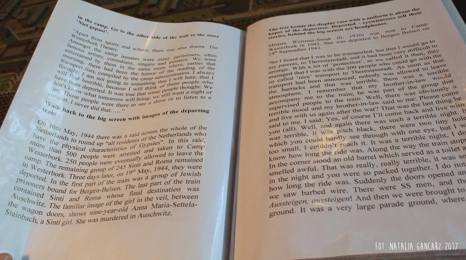 Elementy romskie pojawiają się na wystawie trzy-, czterokrotnie: fotografia Setteli tuż obok Anne Frank – na „portalu” otwierającym wystawę. Wspomniany stolik z otwartą walizką, która prezentuje postać i historię Anny-Marii Steinbach, zwanej Settelą. Po trzecie, na terenie wystawy znajduje się także ściana wypełniona maksymalnie „zdjęciami rodzinnymi”. Są tam umieszczone zdjęcia: małżeństw, rodzin, dzieci, w różnego typu, kroju i koloru ramkach, które sprawiają wrażenie prawdziwej ściany w jakiejś przedwojennej kamienicy Amsterdamu… (podejrzewam, że można na niej znaleźć także fotografie cygańskie, ale wymagałoby to dłuższych analiz, a na to zabrakło czasu). Ostatnim elementem, spajającym w całość obóz Westerbork i jego Miejsce Pamięci, w tym także Muzeum, jak również łączący wszystkie wspomniane wątki: codziennego życia, ukrywania się, deportacji, Żydów, Cyganów, dorosłych, dzieci – a przede wszystkim oddające cześć konkretnym ofiarom obozu, poszczególnym osobom, które miały swoje nazwiska jest film – „102 000 imion”.