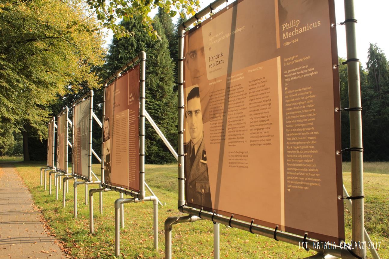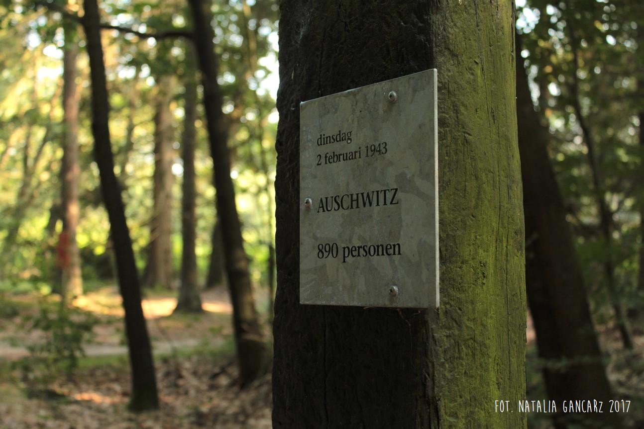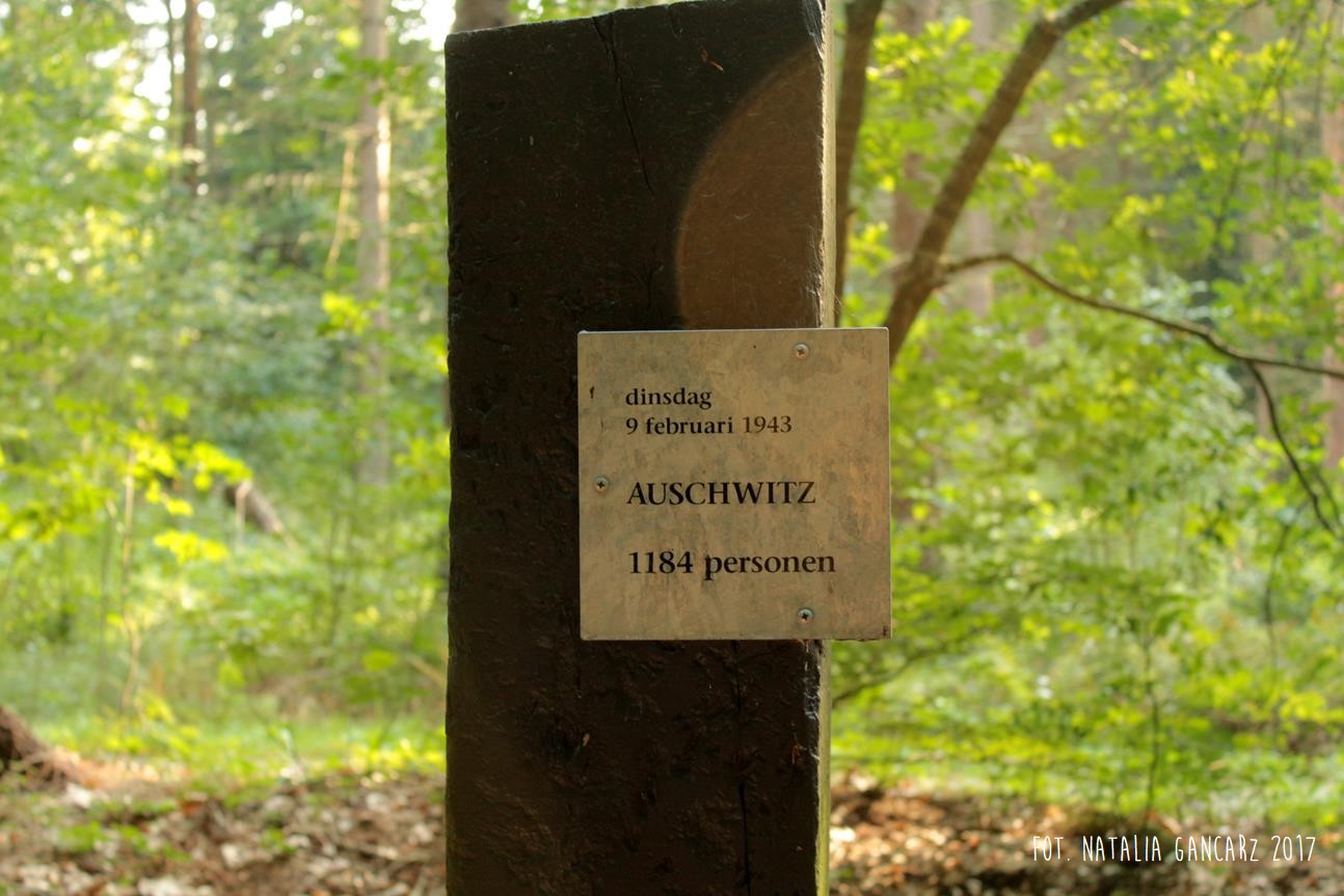 Droga do dawnego obozu Westebork wiedzie przez las i oznaczona jest drewnianymi słupami, z których każdy reprezentuje osobny transport. Na tabliczkach napisana jest dzień tygodnia, data transportu, miejsce docelowe oraz liczba osób.