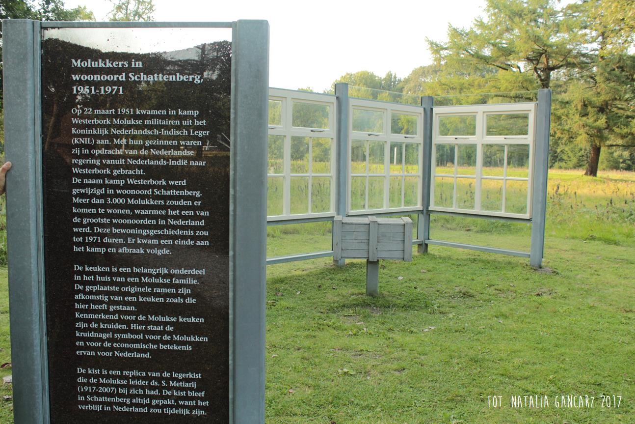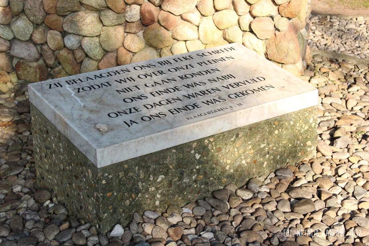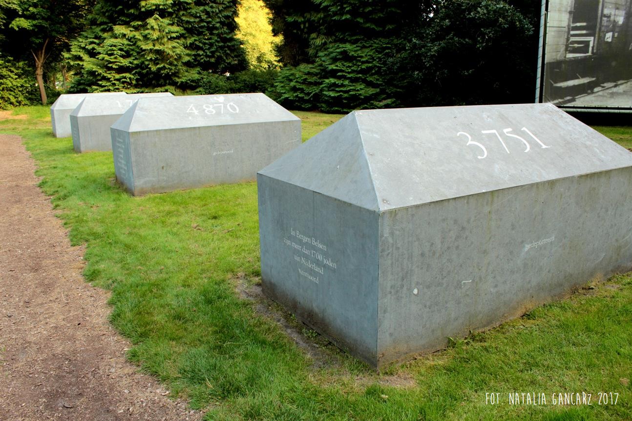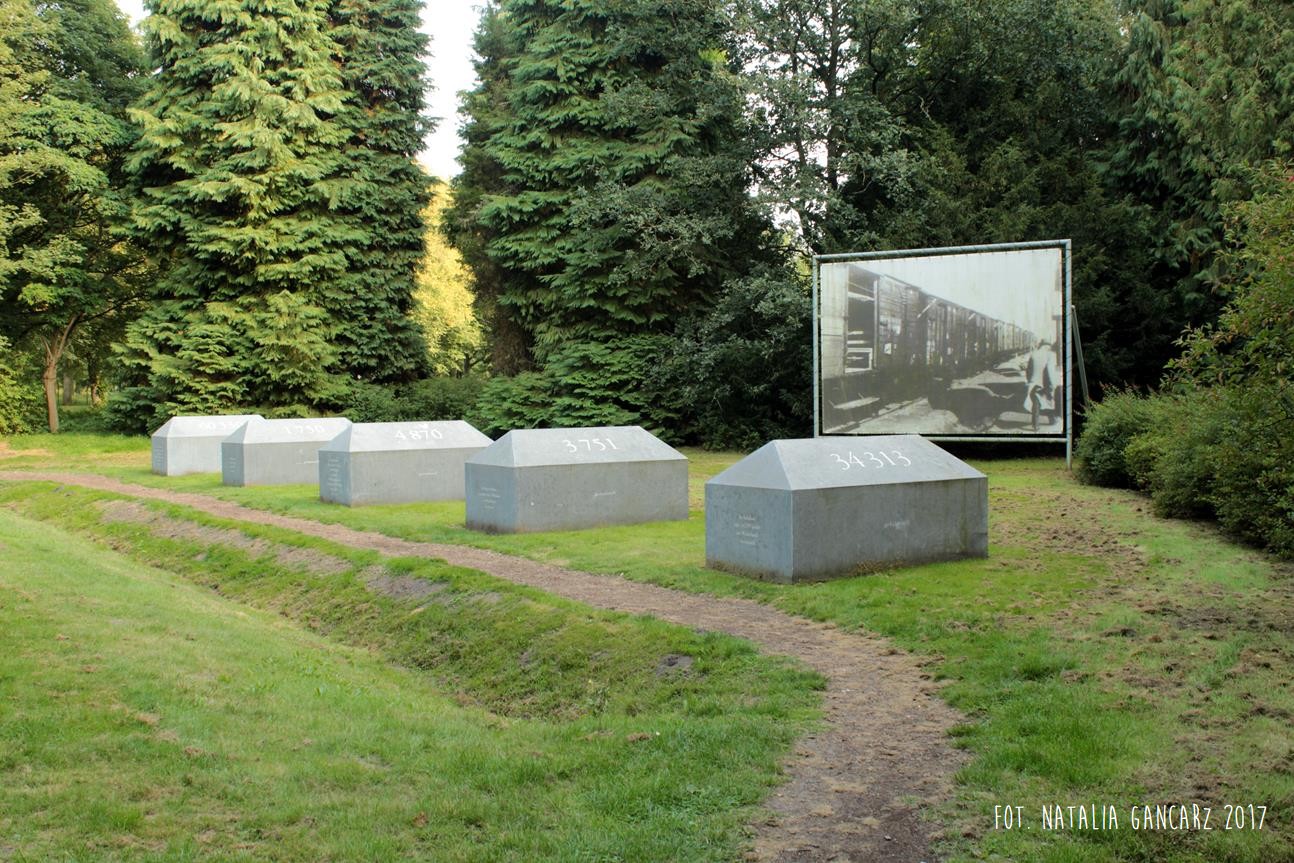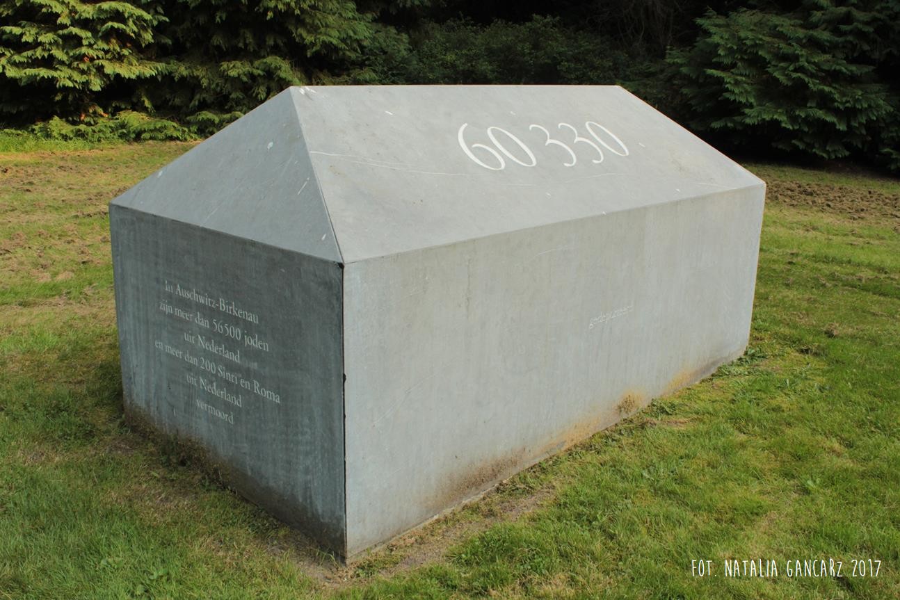 Przed wejściem na teren miejsca pamięci obozu Westerbork widzimy jednak najpierw pomnik, składającego się z pięciu betonowych sarkofagów, z których każdy opatrzony jest inskrypcją z miejscem docelowym transportu i liczbą osób: Sobibór, Auschwitz, Bergen-Belsen i in. Pomnik ów powstał w 2001 r. i zaprojektował go Victor Levie. Następnie dochodzimy do wspomnianej rekonstrukcji domu komendanta. Poszczególne części obozu przedstawione są za pomocą wielkogabarytowych zdjęć.