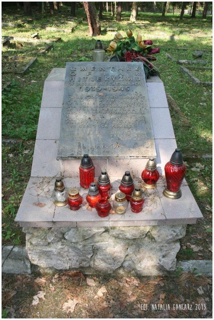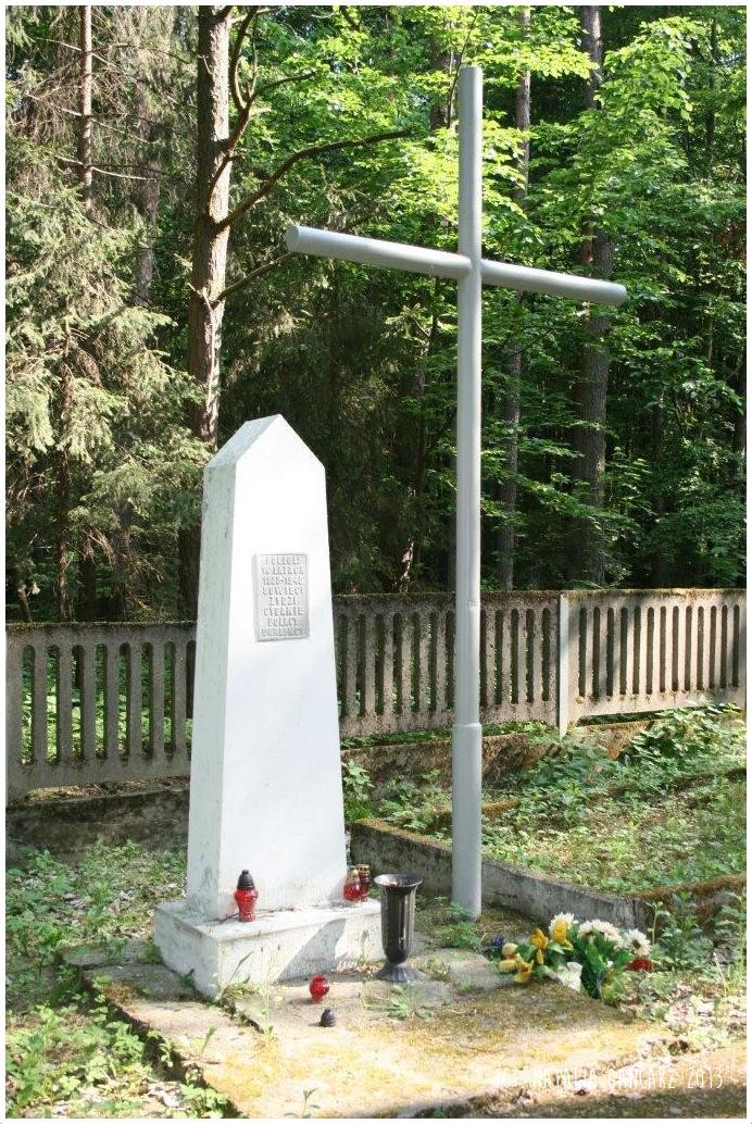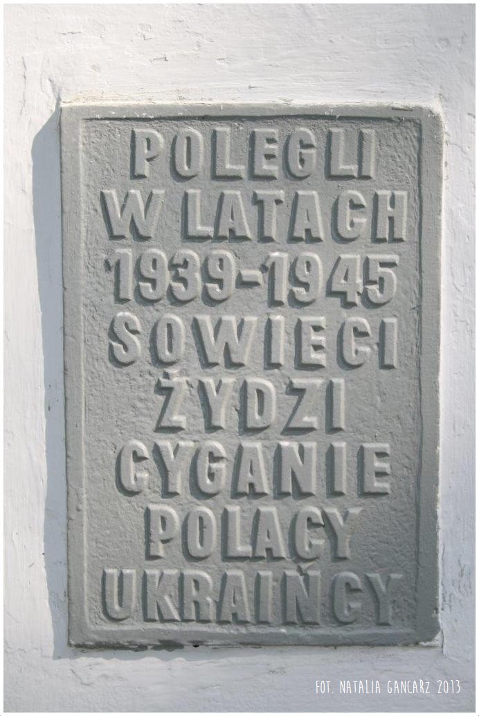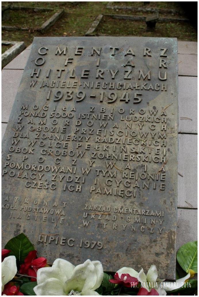 Cmentarz / ofiar / hitleryzmu / w Jagielle-Niechciałkach / 1939-1945 // Mogiła zbiorowa / ponad 5000 istnień ludzkich / zamordowanych / w obozie przejściowym / dla żołnierzy radzieckich / w Wólce Pełkińskiej. / Obok grobów żołnierskich / spoczywają /pomordowani w tym rejonie / Polacy, Żydzi i Cyganie / Cześć ich pamięci