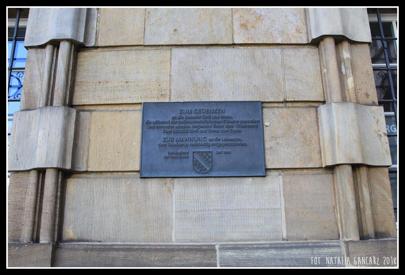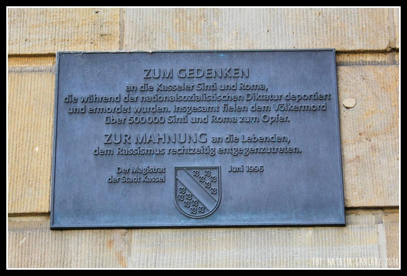 Właśnie w tym miejscu, na ścianie budynku ratusza w bliskiej odległości od Górnej Fontanny, Dieter Haist z Uniwersytetu w Kassel wykonał tablicę upamiętniającą społeczność Cyganów z Kassel.