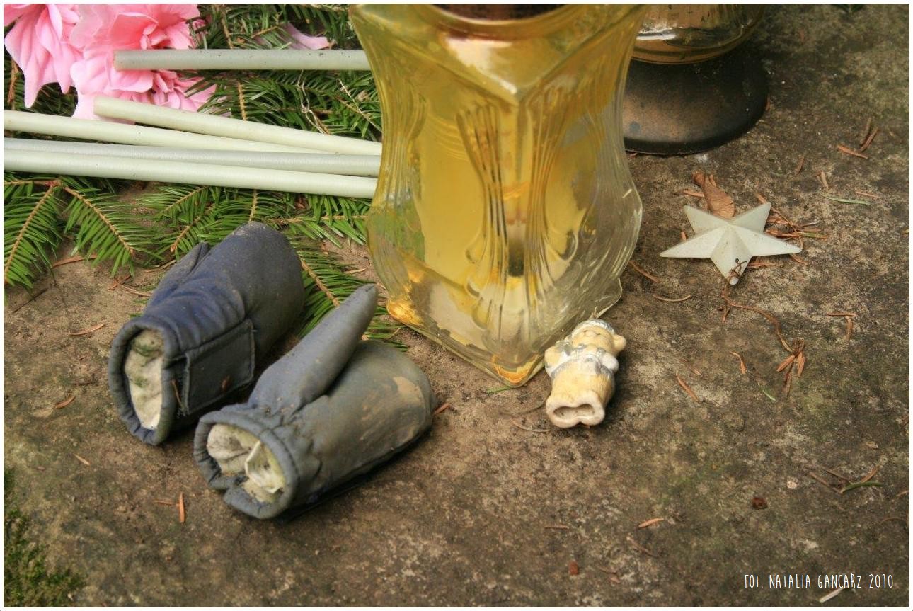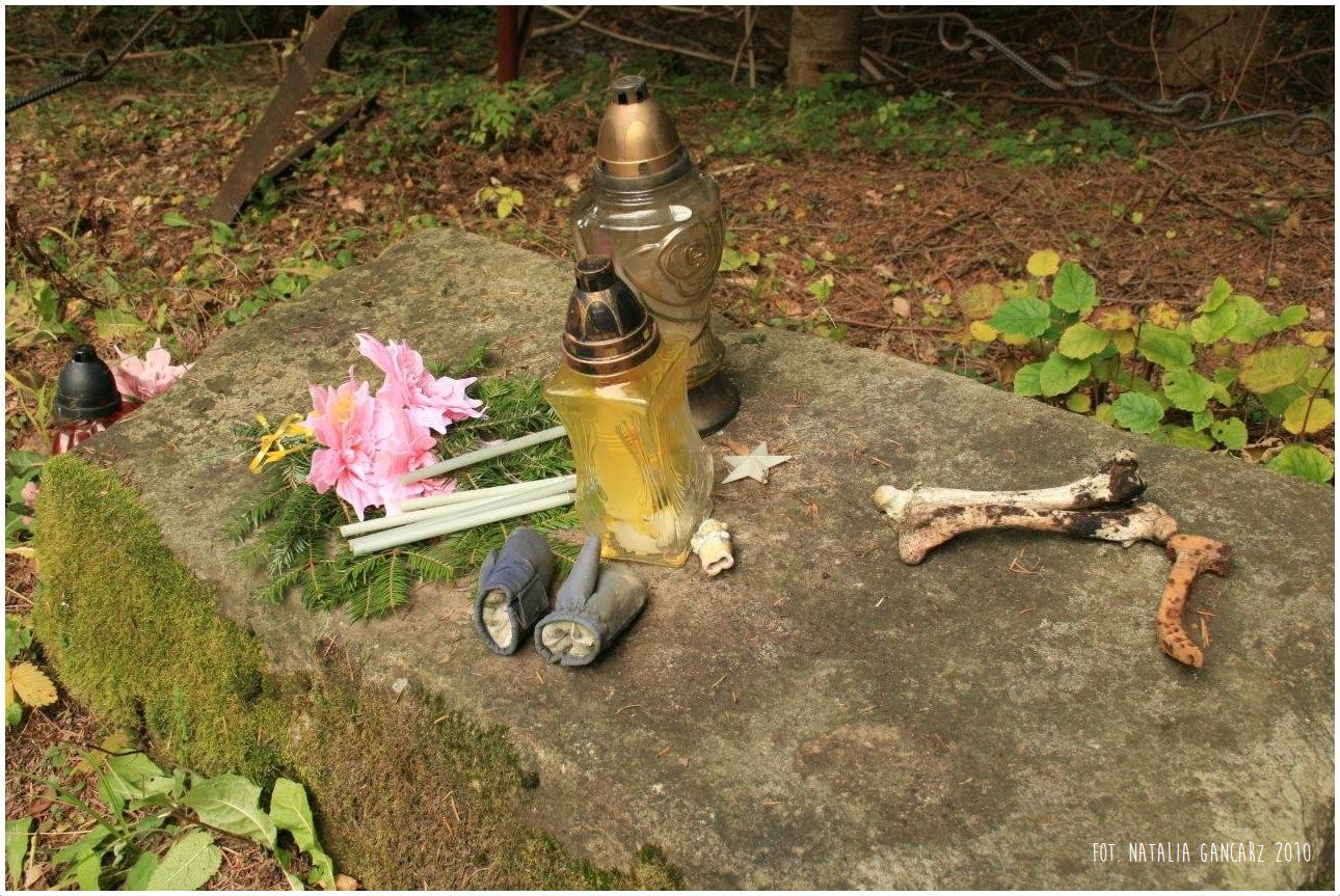 Od lat na grobie leżą interesujące atrybuty, pozostawione przez turystów: dziecięce rękawice, plastikowa figurka misia, zwierzęca kość, gwiazdka oraz zardzewiały i wygięty, duży kuty gwóźdź oraz pojawiają się długie cerkiewne świece wotywne, znicze i sztuczne kwiaty.