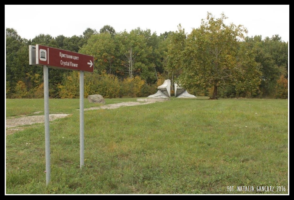 Poza drogowskazem w jęz. serbskim i angielskim „Crystal flower” napisy nieczytelne (na omszonym kamieniu).
