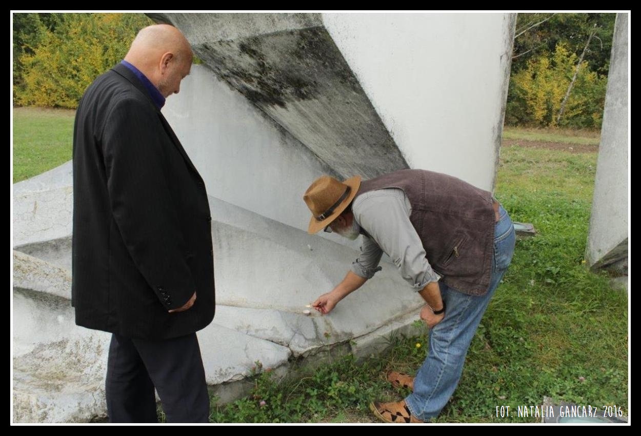 Do pomnika wiedzie chodnik z betonowych płyt (mocno przerośniętych trawą). Mniej więcej w połowie po lewej stronie omszały kamień z niewidocznym napisem. Nieco dalej betonowe cygańskie koło (8-szprychowe), umieszczone płasko, równolegle do powierzchni ziemi. Beton popękany.
