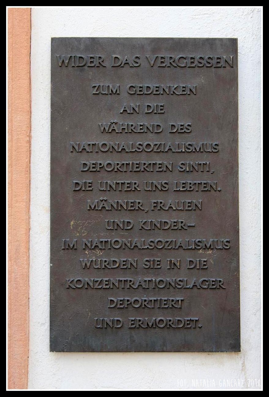 Przeciwko zapomnieniu! Aby pamiętać o deportowanych przez nazistów Sintów, którzy żyli wśród nas. Mężczyźni, kobiety, dzieci – zostali w czasie narodowego socjalizmu deportowani i zamordowani w obozie koncentracyjnym.