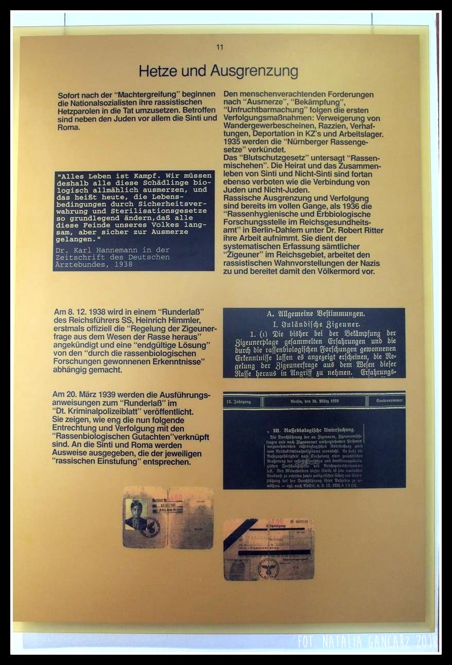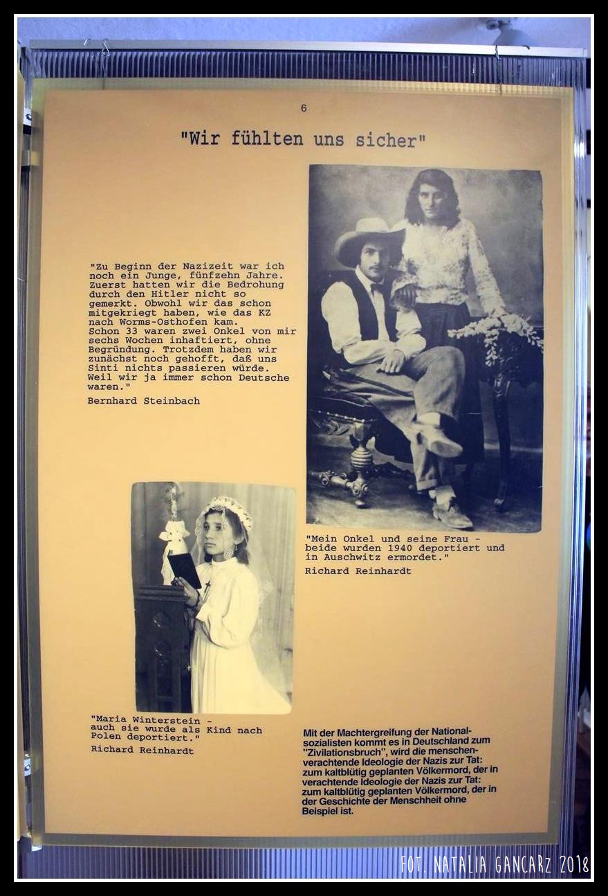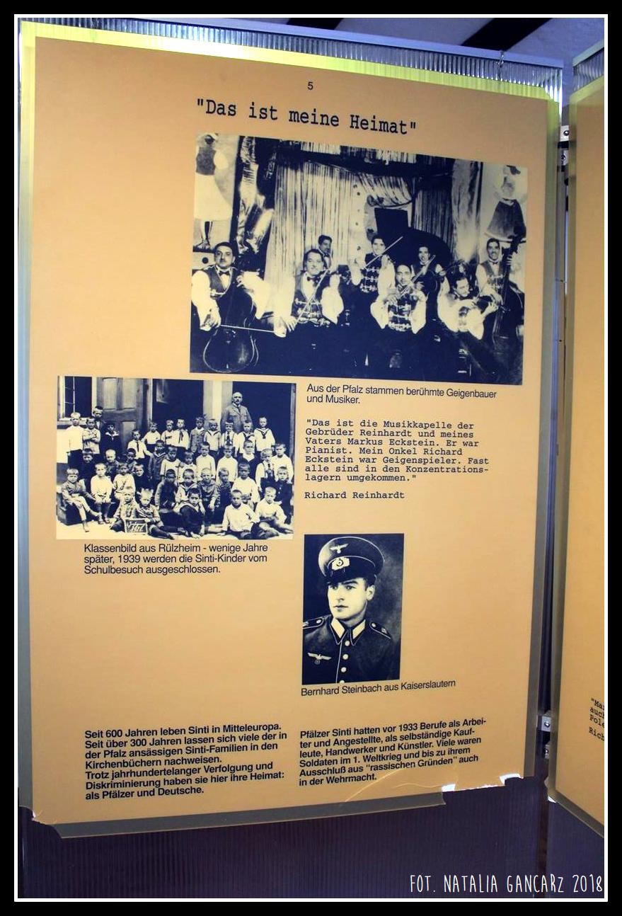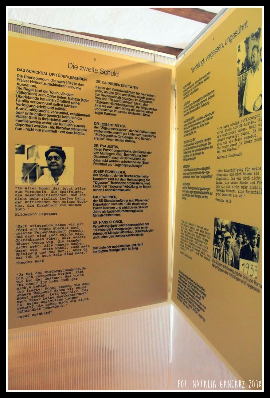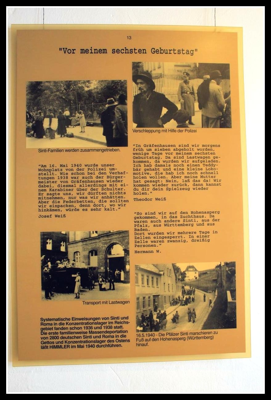 Wystawa dotycząca Sintów i Romów w rejonie Nadrenii-Palatynatu składa się z 24 plansz w języku niemieckim. Przedstawia postaci ocalonych, początki ruchu cygańskiego, związanego z z wiedzą i upamiętnianiem Zagłady Cyganów, oraz historię Sintów z Landau i rejonu, począwszy od roku 1933, poprzez późniejsze badania antropologiczne, wojenne dzieje wybranych rodzin, przypadek dzieci z przedszkola w Mulfingen, KL Auschwitz i śmierć.
